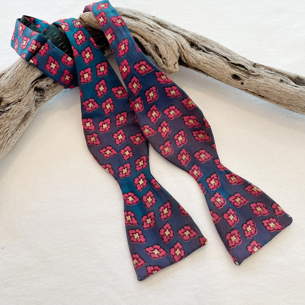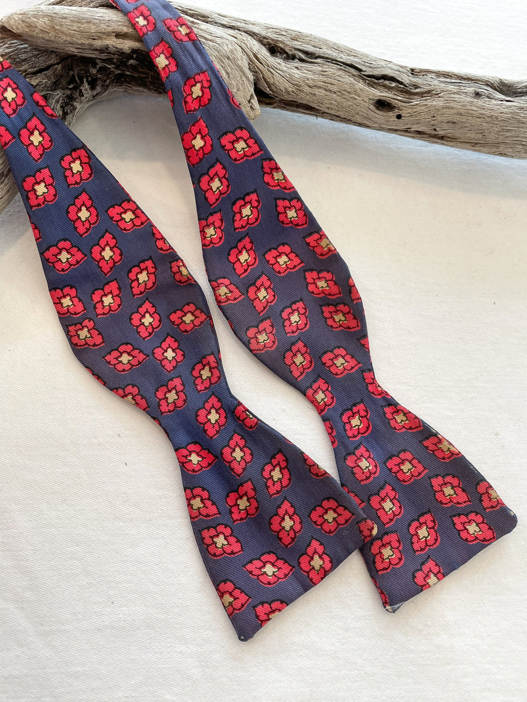Vintage blue and red floral print bowtie. Silky fabric, content unmarked.