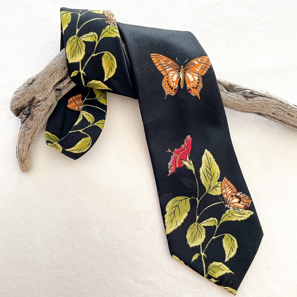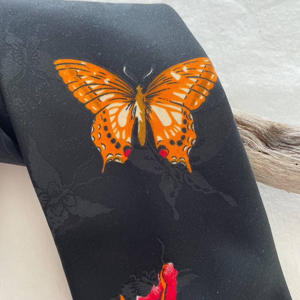 Vintage 70s wide tie with butterflies and flowers.