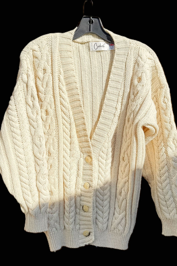 Carducci Cream Wool Cardigan Sweater, Cable Knit Fisherman Sweater M