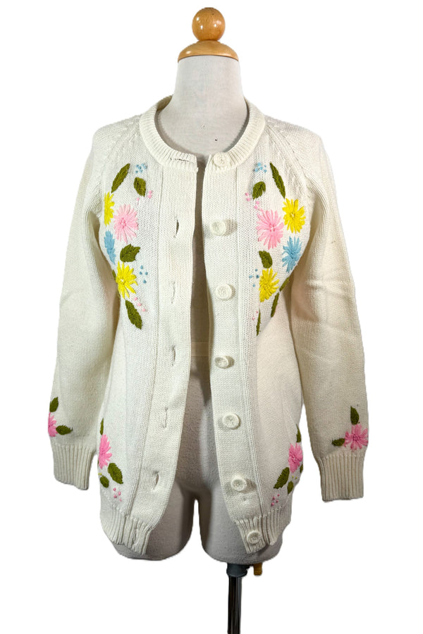 Vintage 60s White Embroidered Cardigan Sweater S