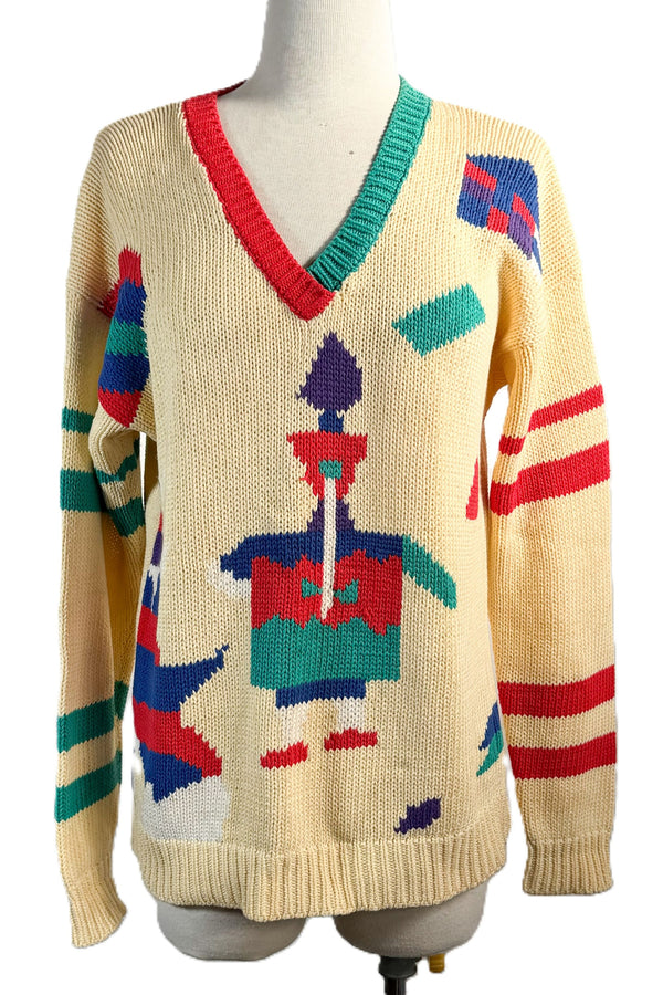 Vintage White Sweater Bear/Heart Patch, Acrylic Novelty Pullover Sweater