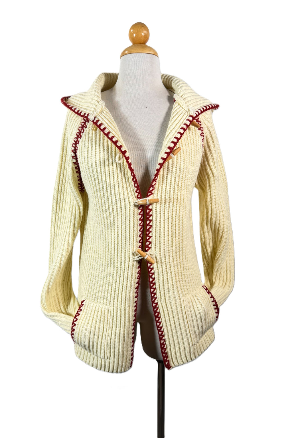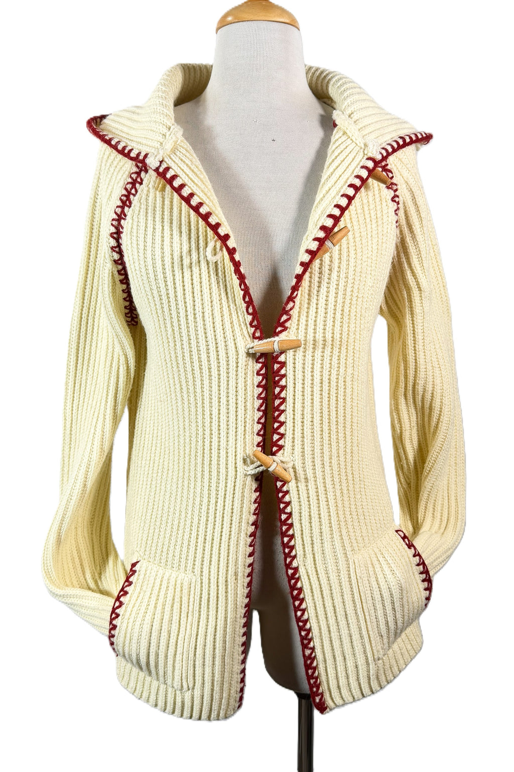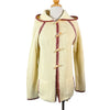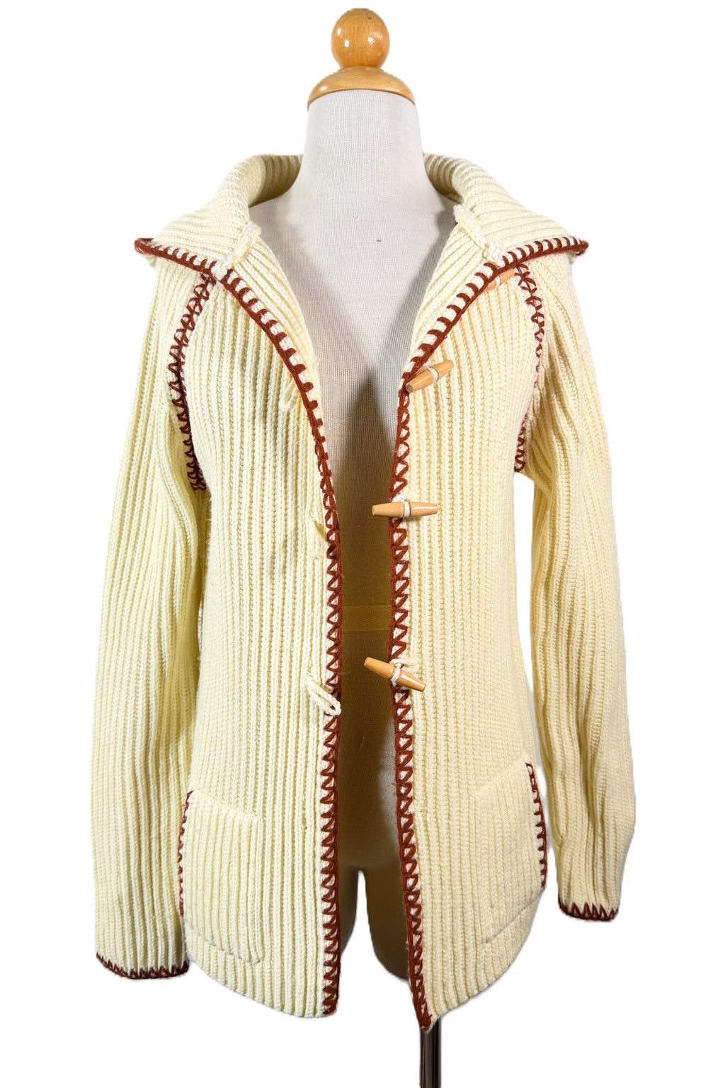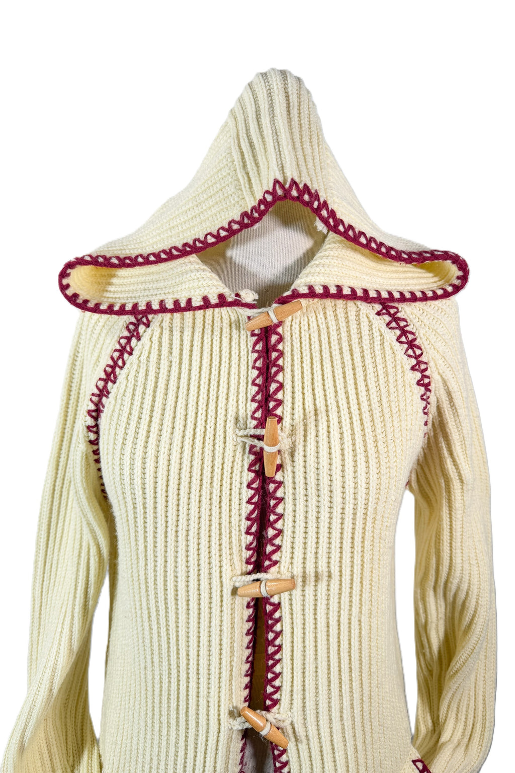 70s off white/cream ribbed cardigan sweater with a hood and wood toggle buttons.
