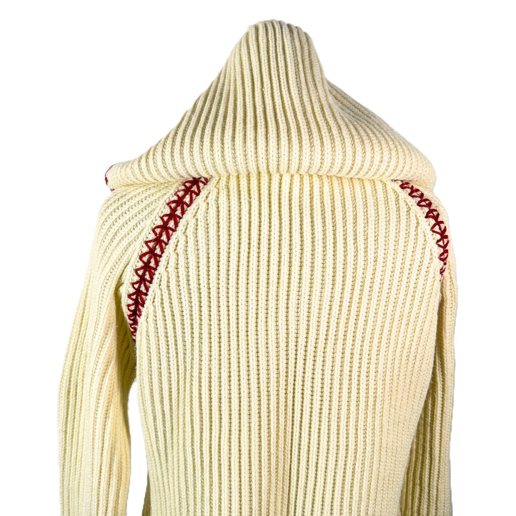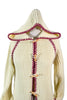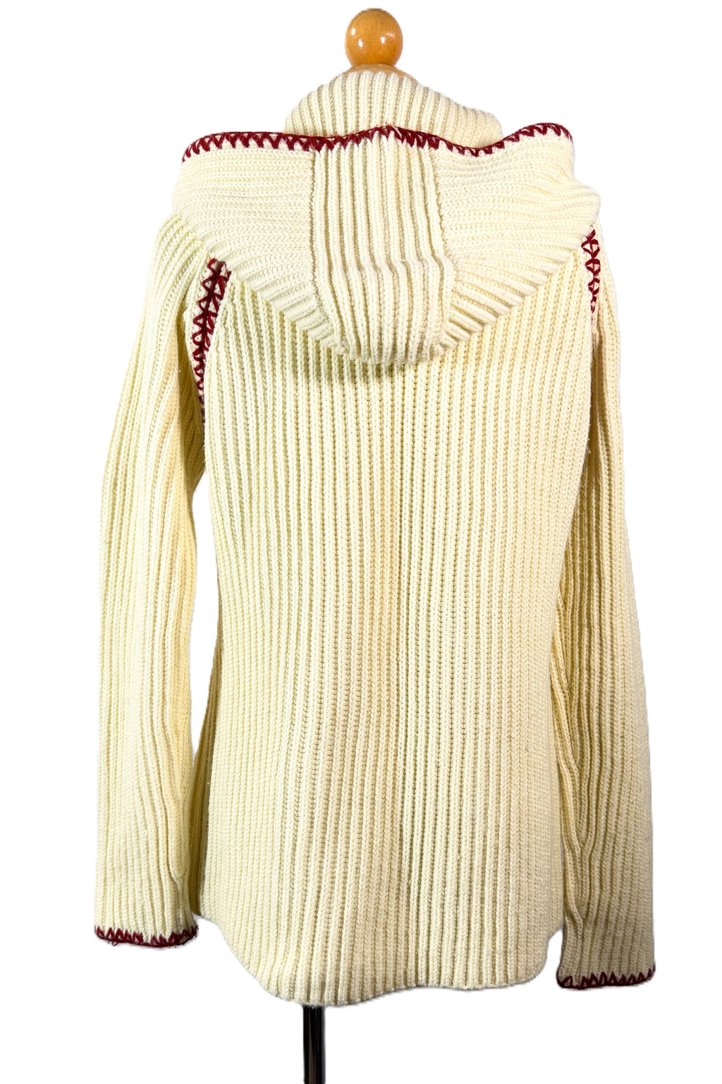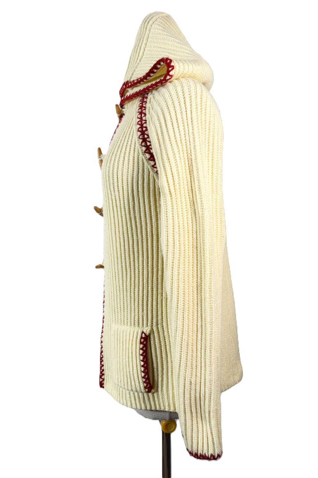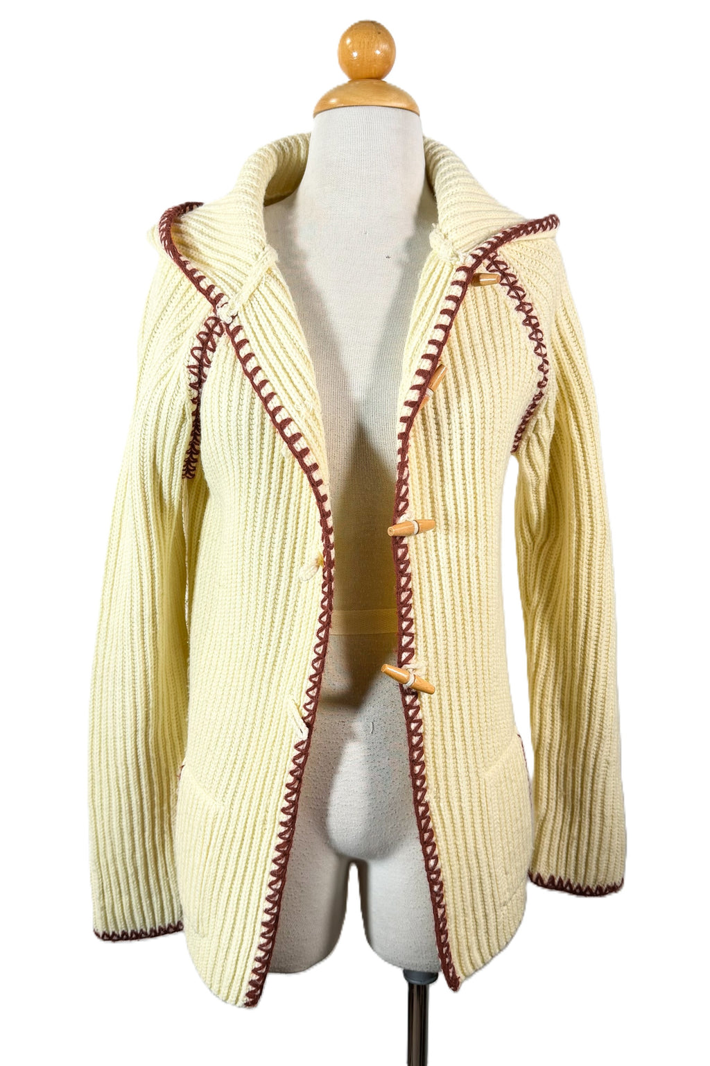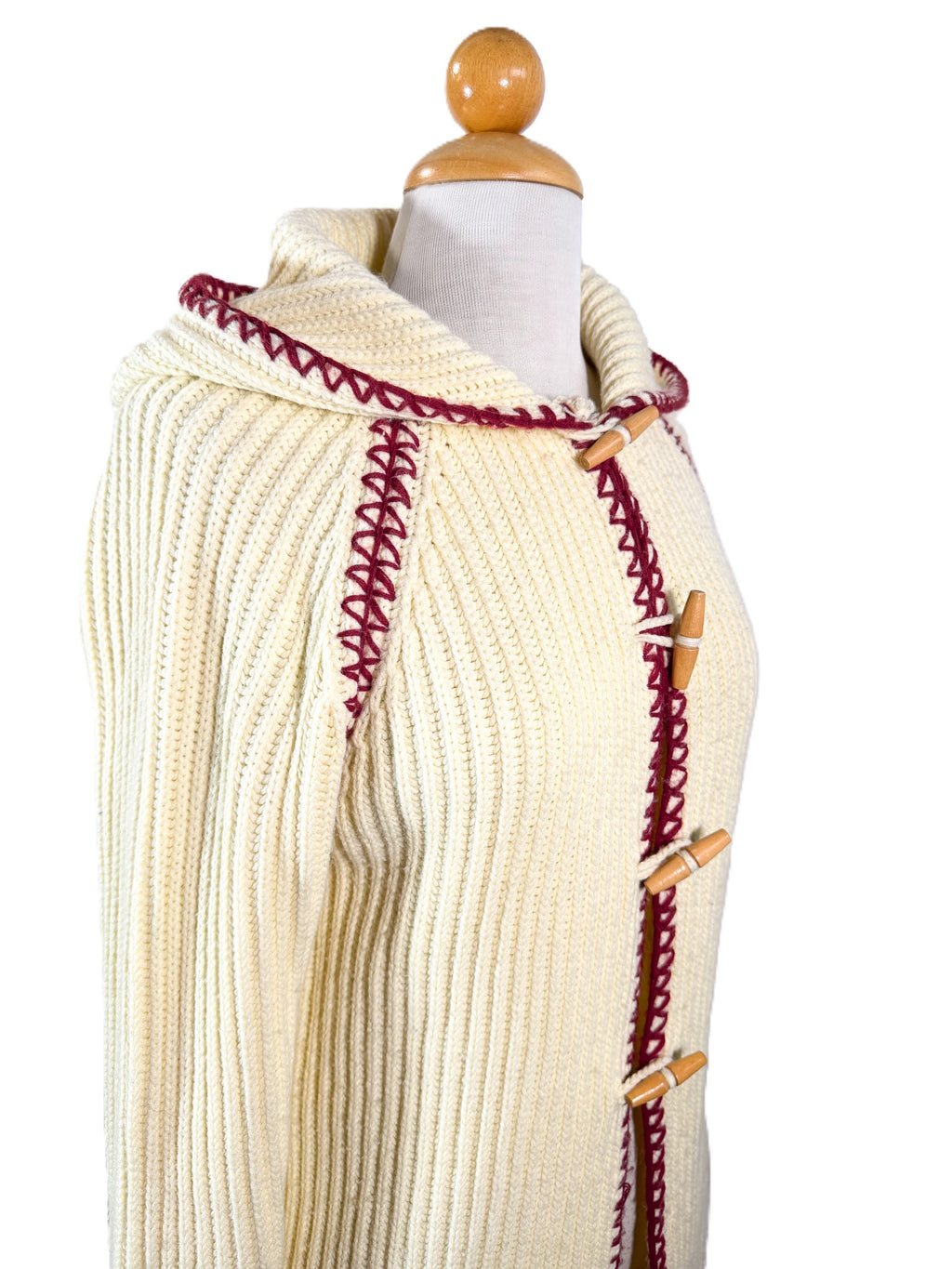 70s off white/cream ribbed cardigan sweater with a hood and wood toggle buttons.
