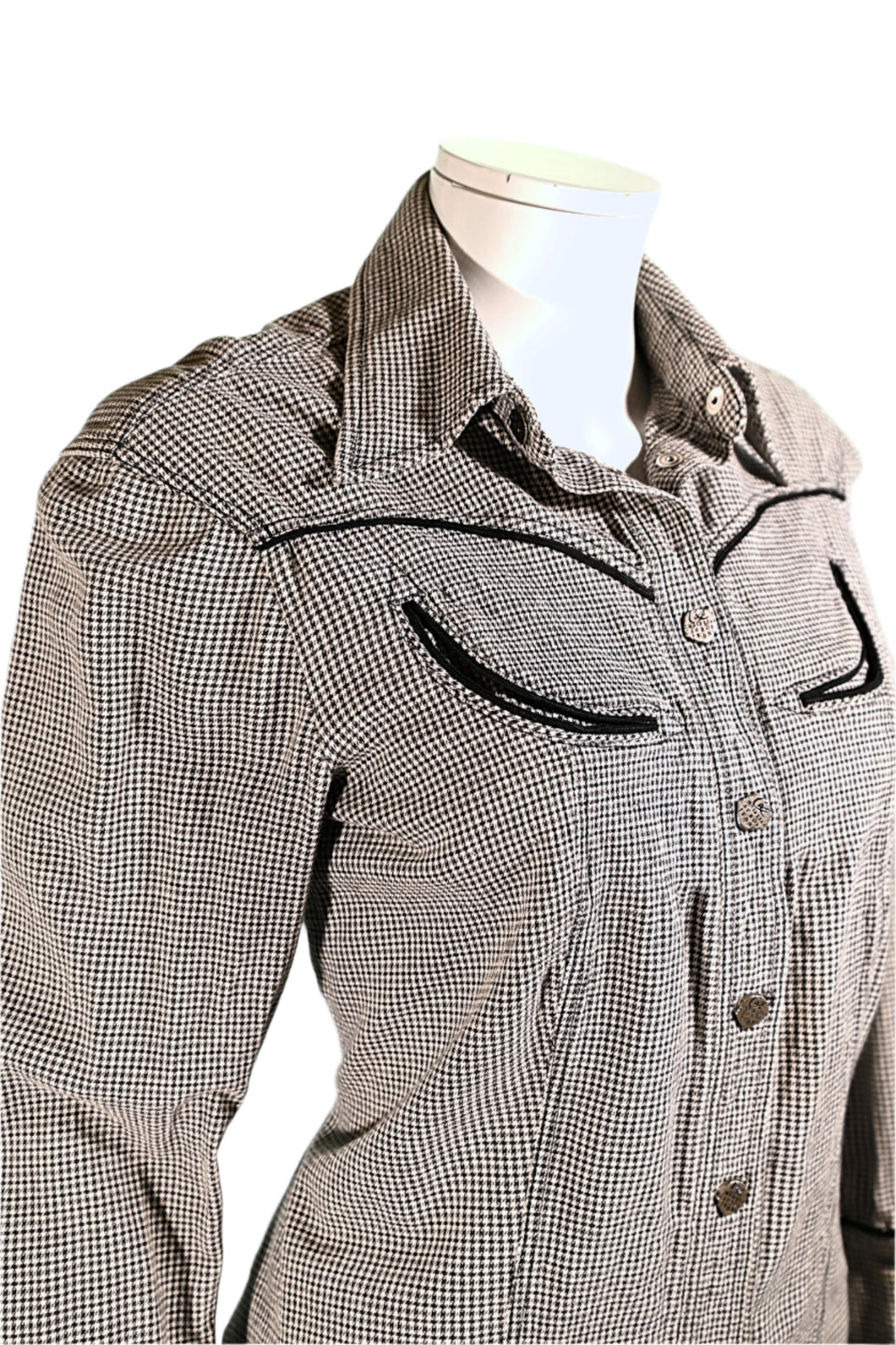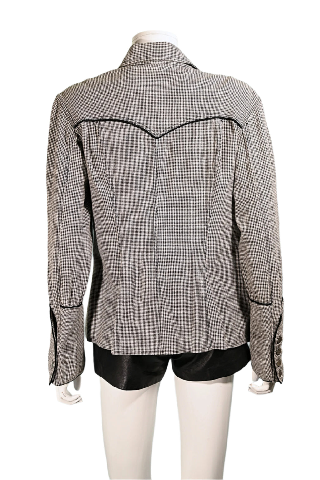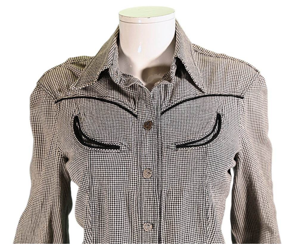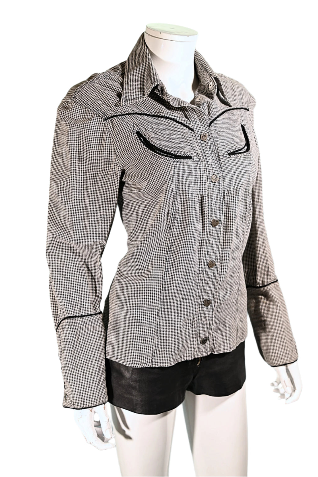 Jeans de Christian Lacroix, tiny black & white check cowboy style shirt with black piping trim.