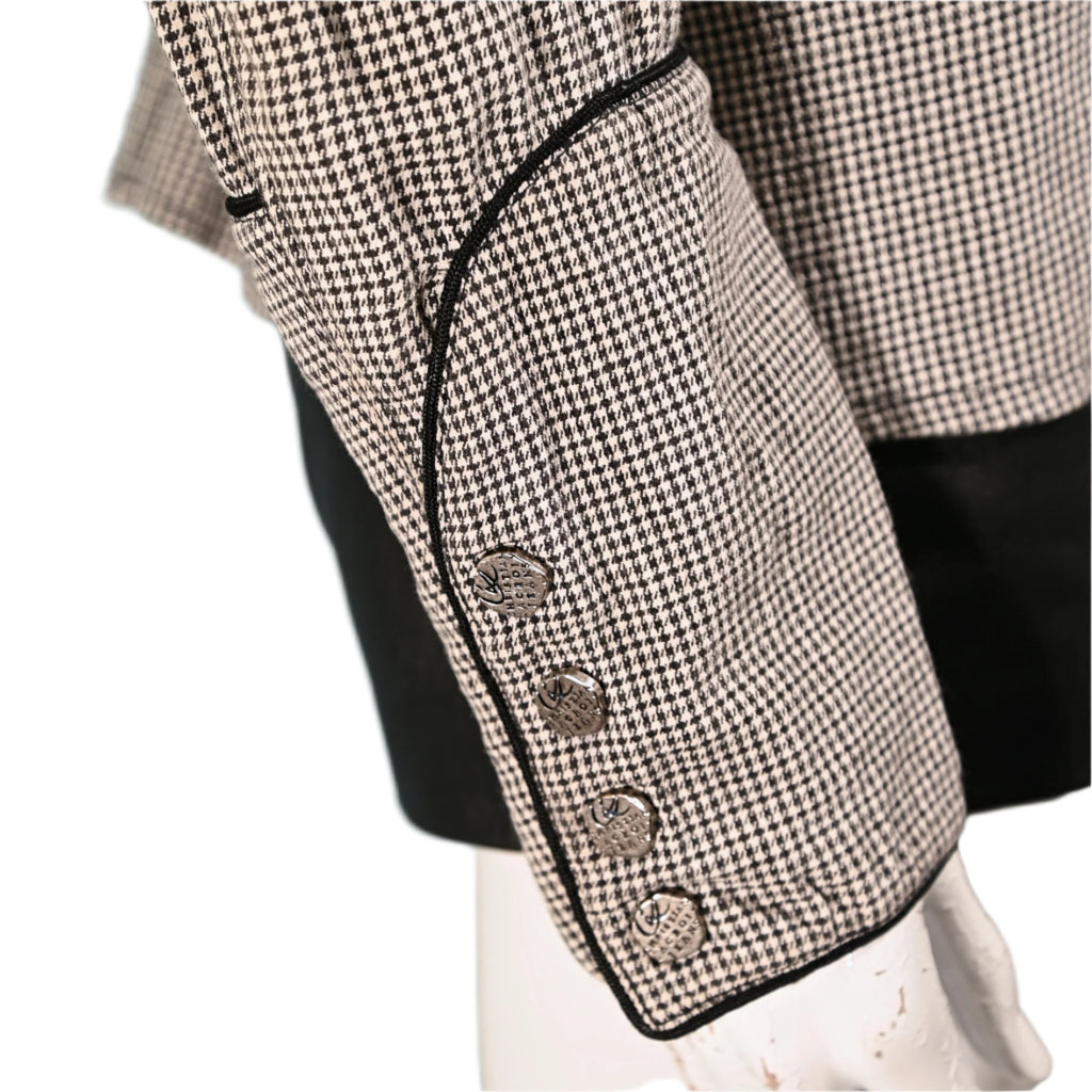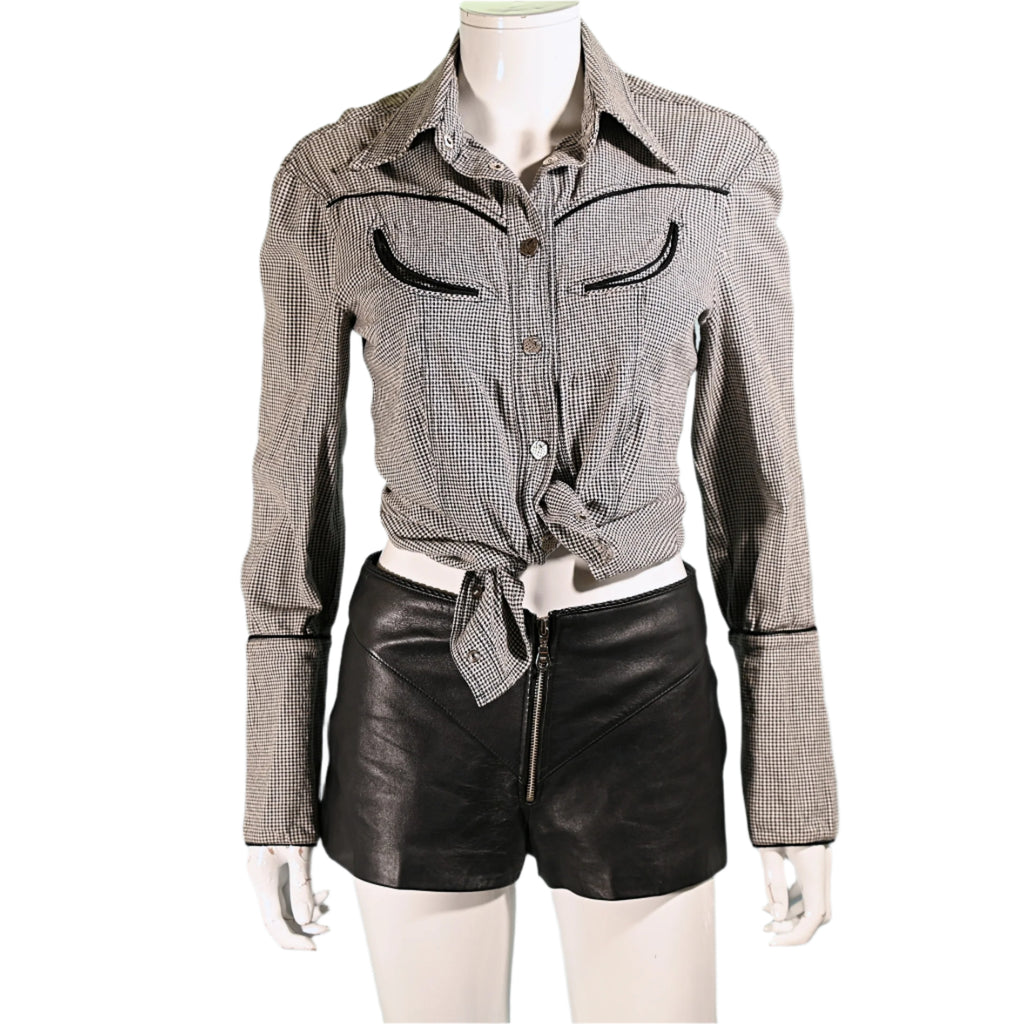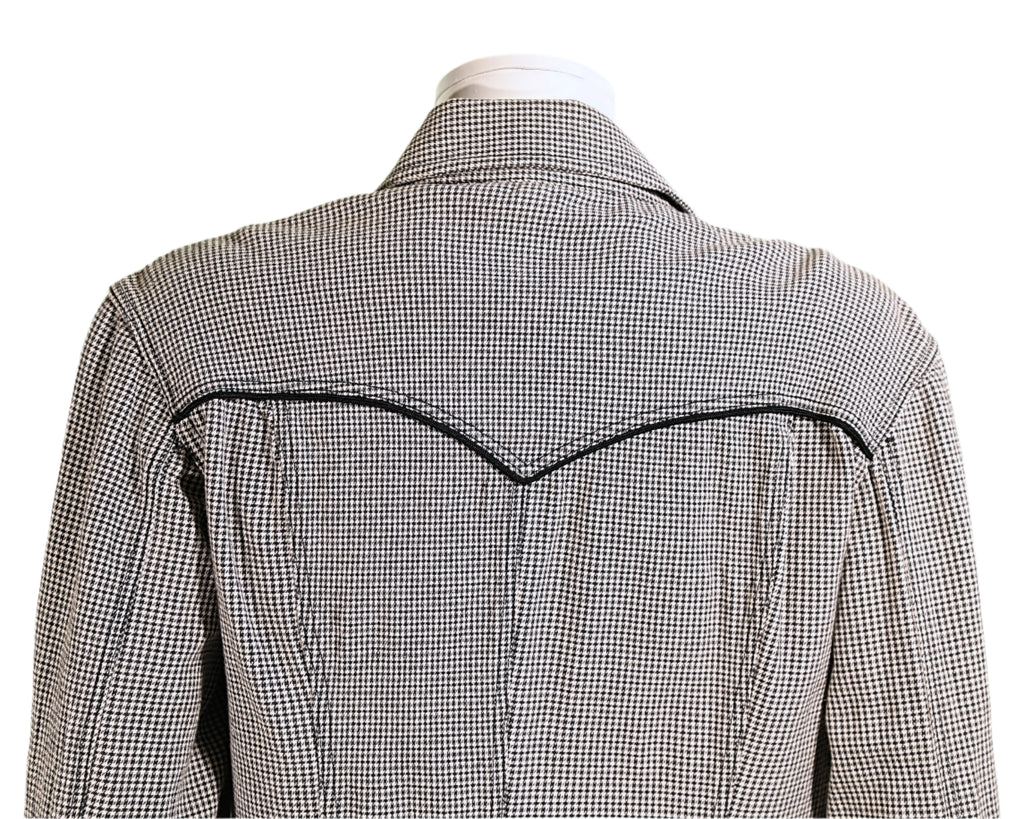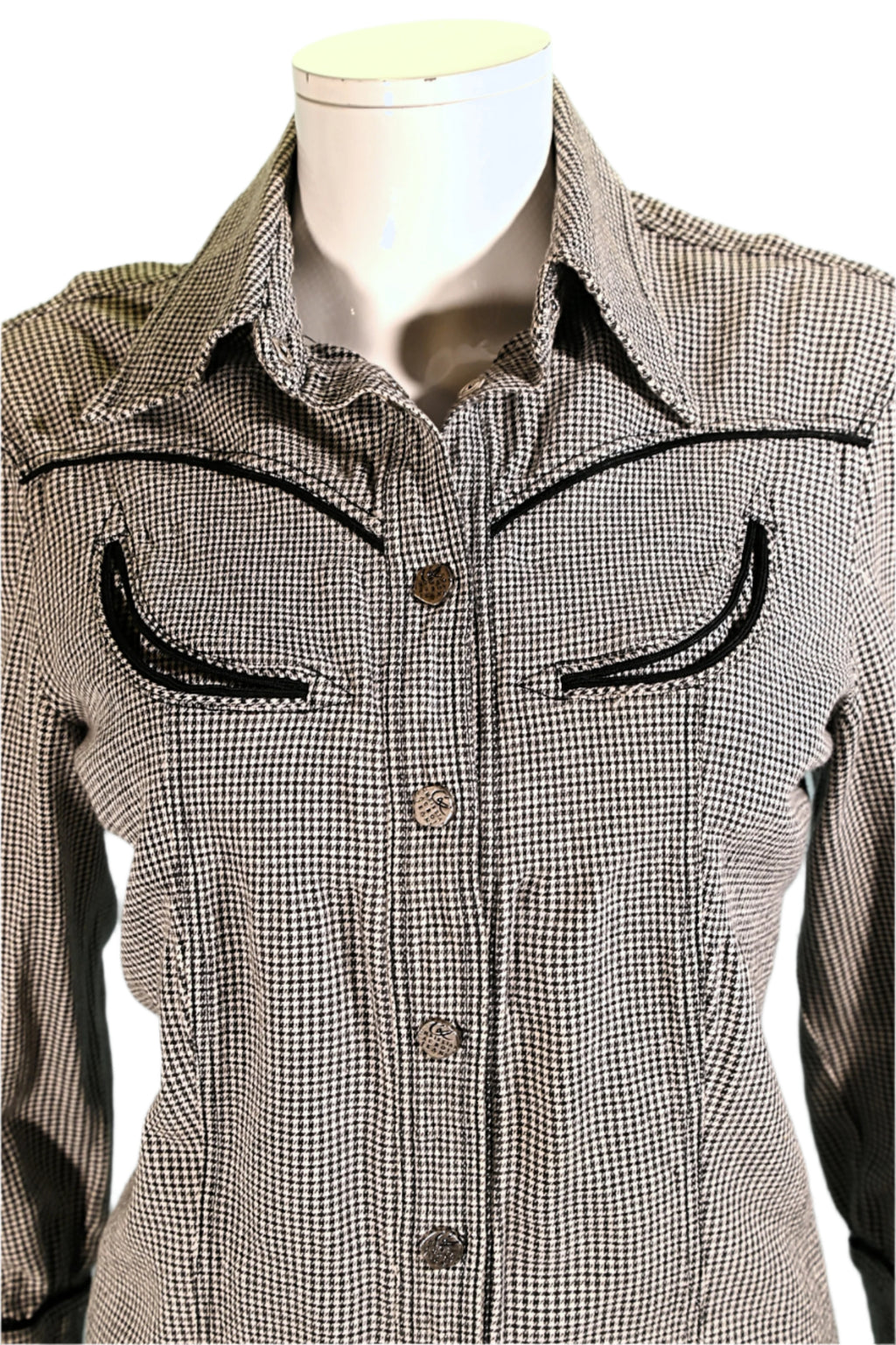 Jeans de Christian Lacroix, tiny black & white check cowboy style shirt with black piping trim.