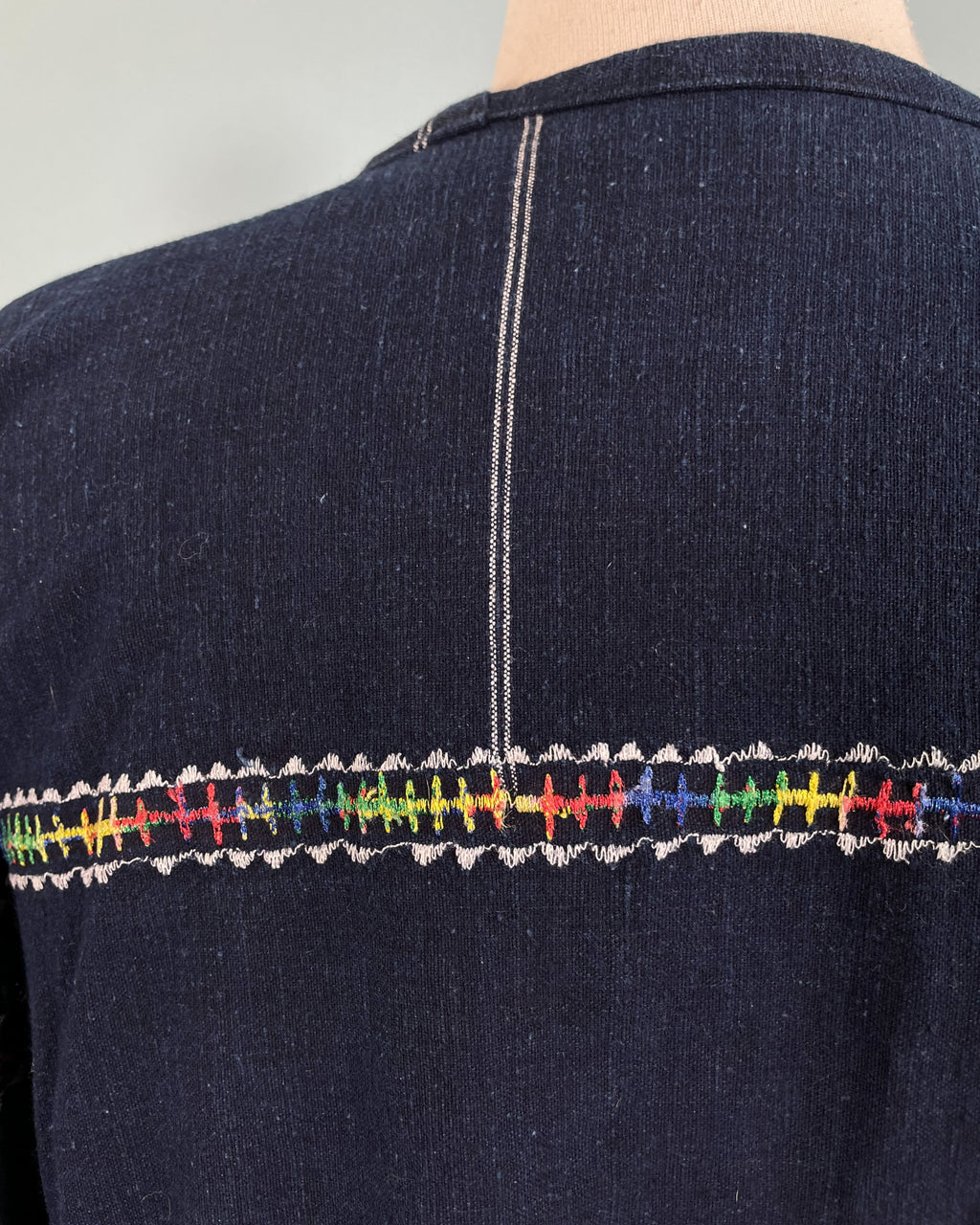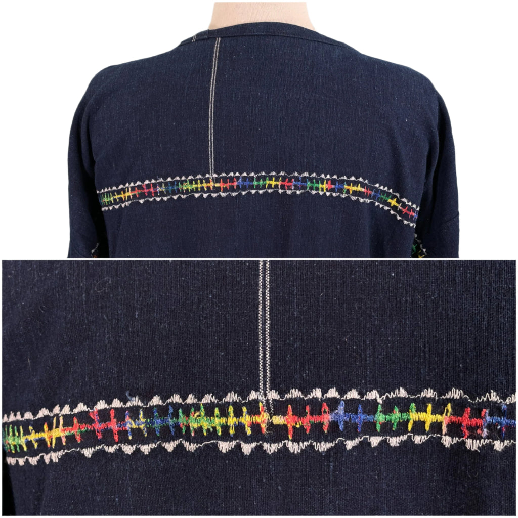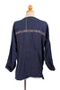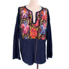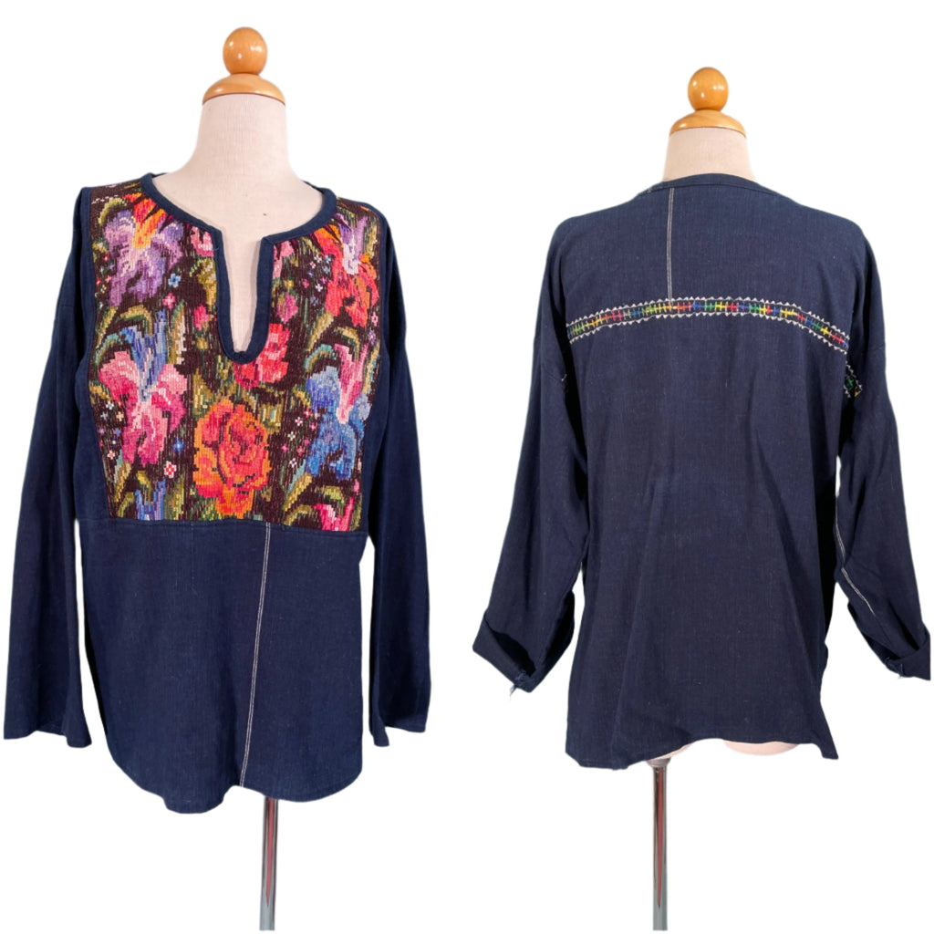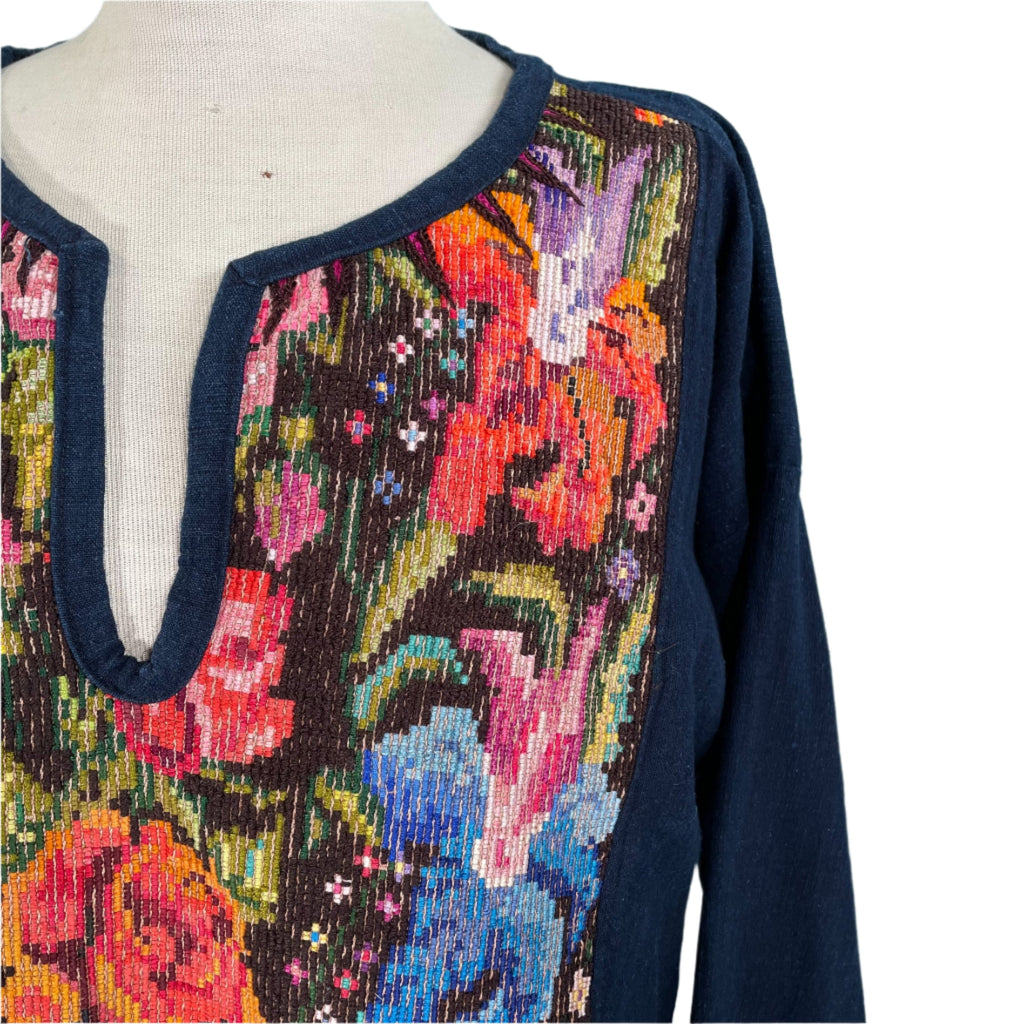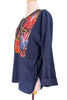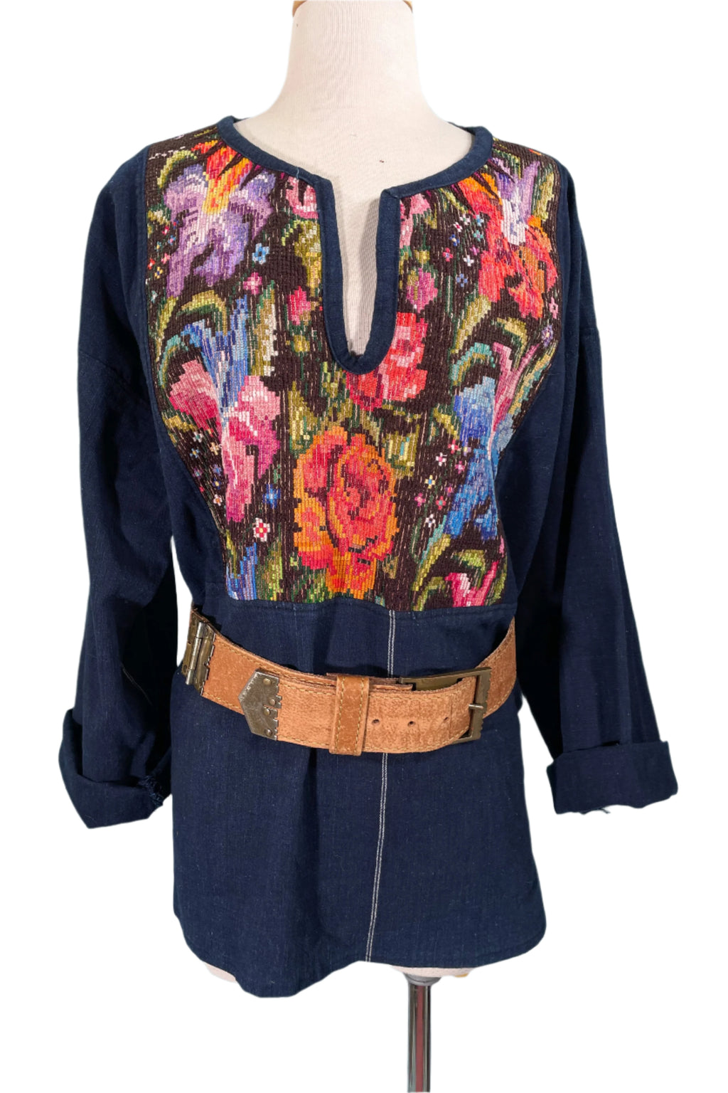 Vintage Indigo cotton woven top with hand embroidered flowers.