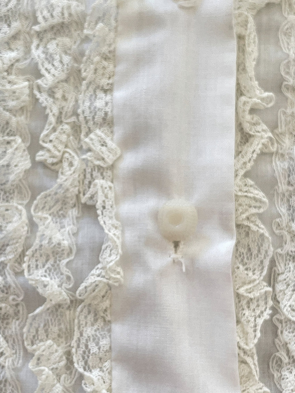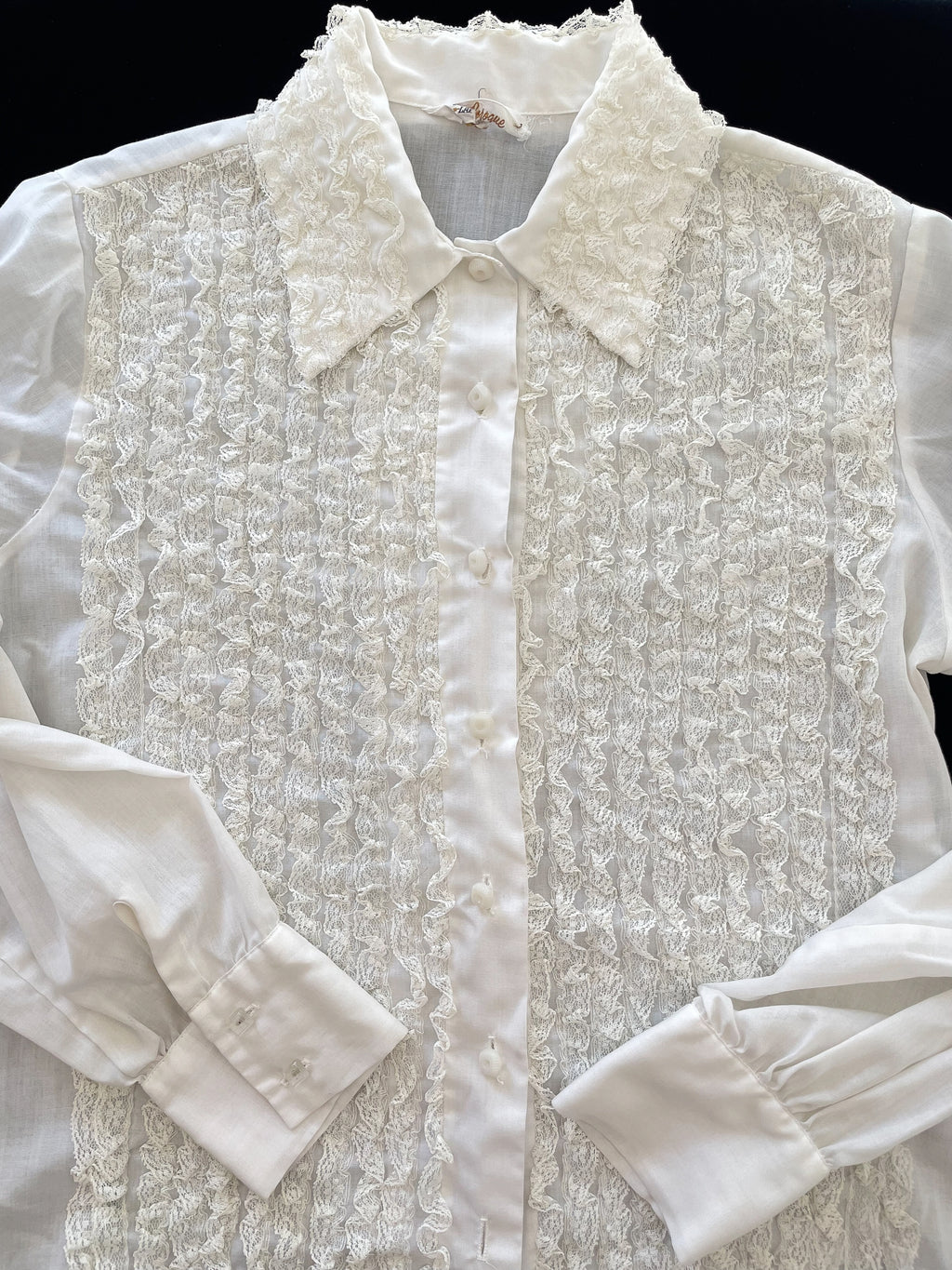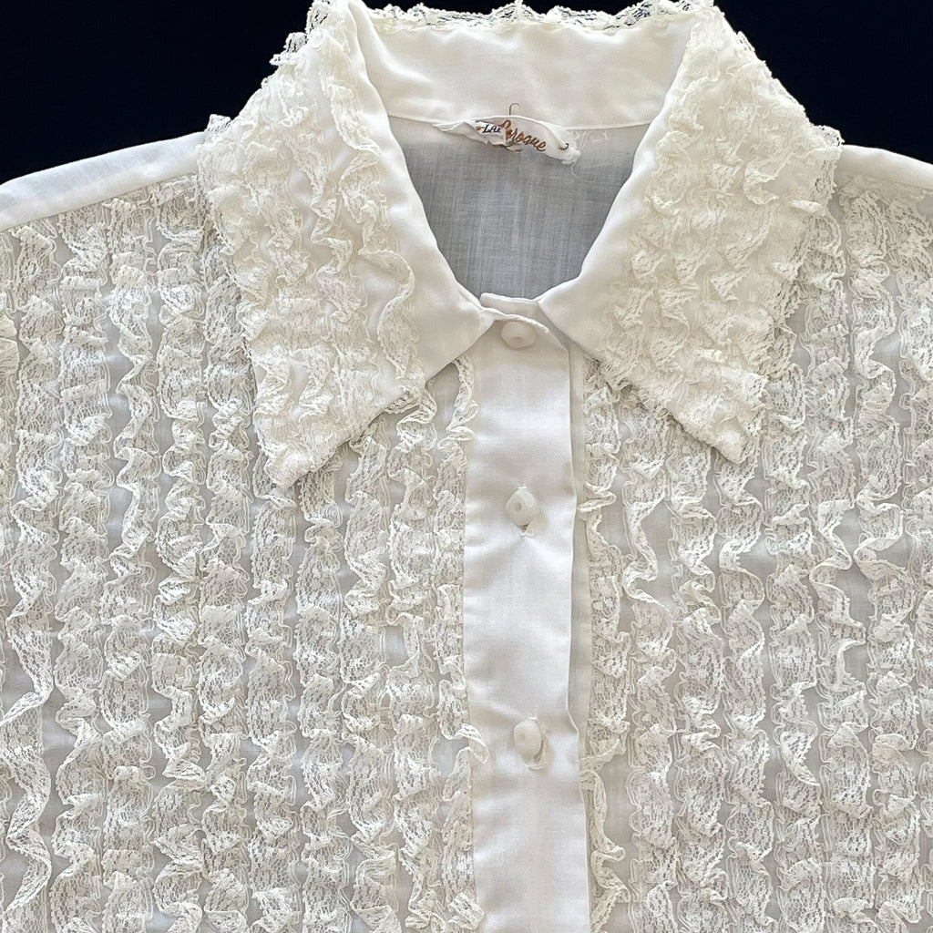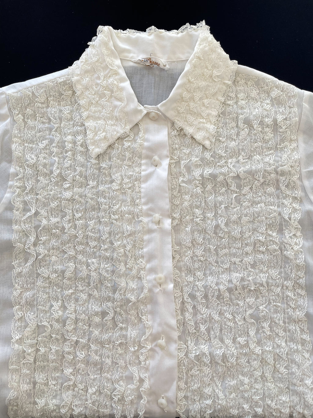 Vintage white cotton/poly blouse with ruffle lace details on the blouse front and collar.