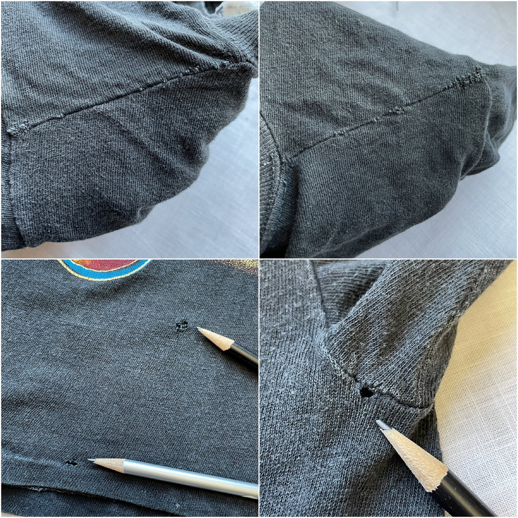 The shirt shows signs of legit wear. Small holes under the arm pits, 2 holes on the front, small holes on the shoulder seams. See photos.