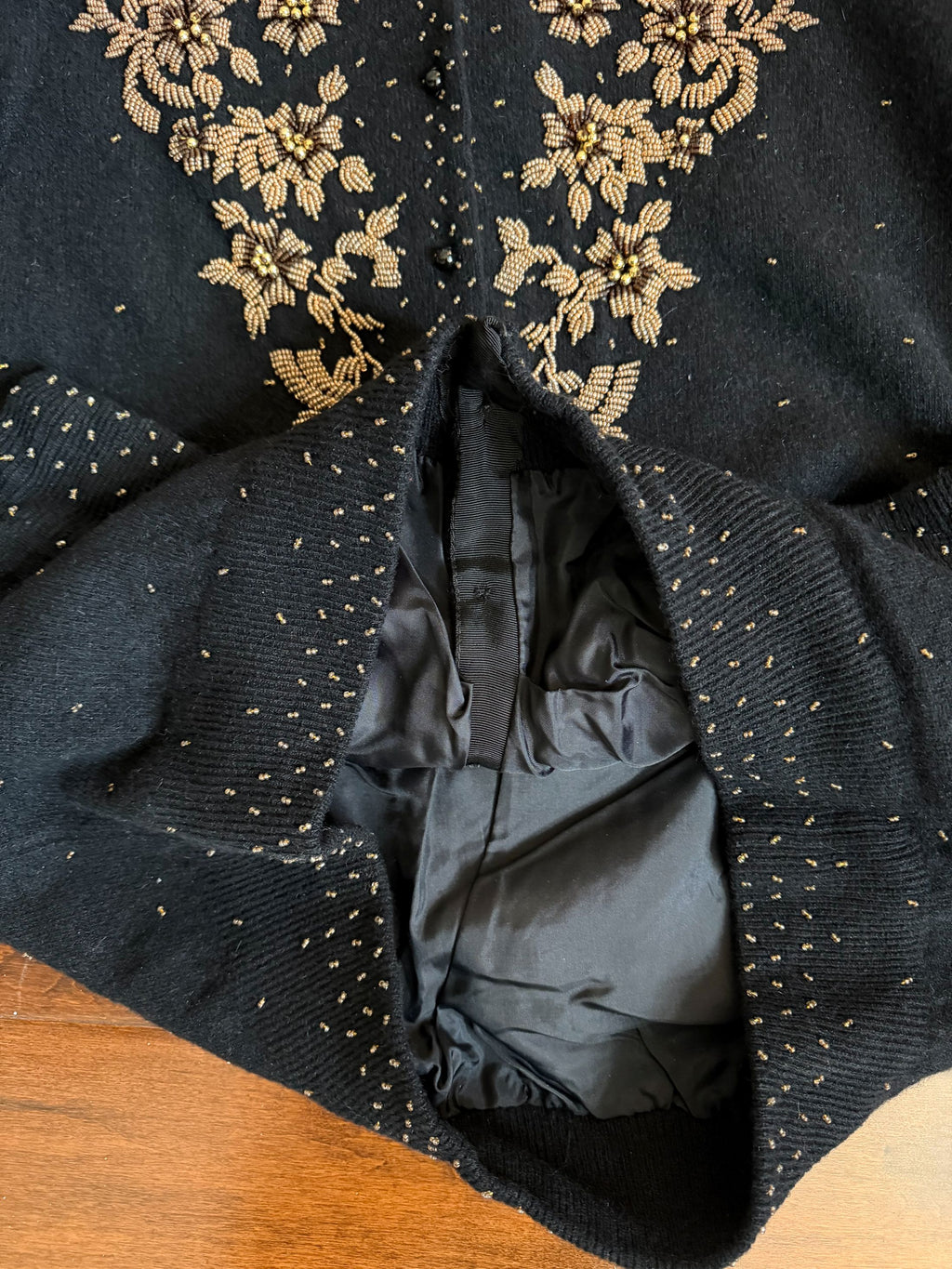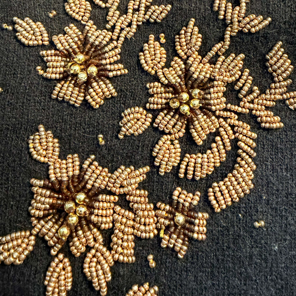 Beautiful black wool evening sweater accented with bronze and gold beads.