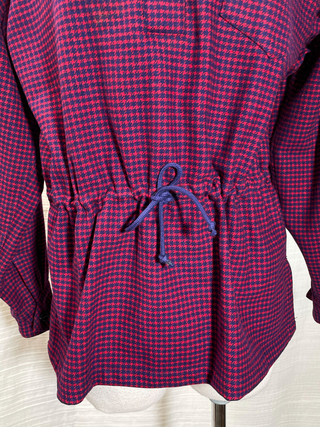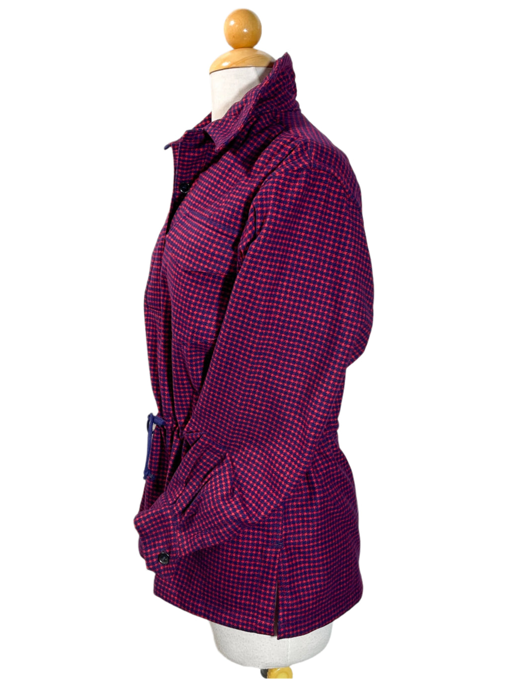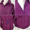 Adjustable cord waistband, concealed button closure, collar neckline, slits at side hem.