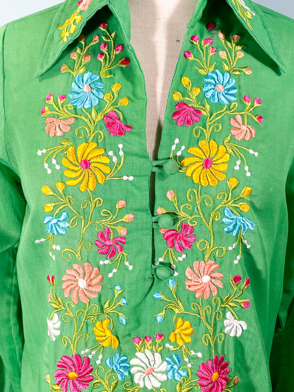 Vintage Green Embroidered Blouse, Hippie Boho Tunic Top M