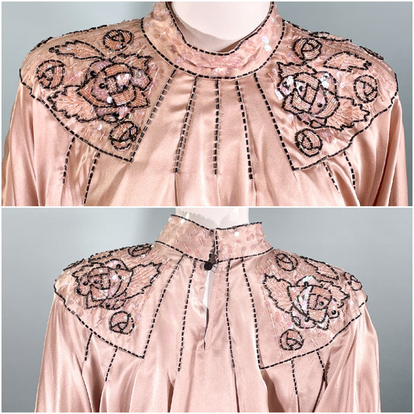 Vintage 80s Does 40s Beaded Blush Satin Blouse, Mercedes & Adrienne SZ 8