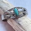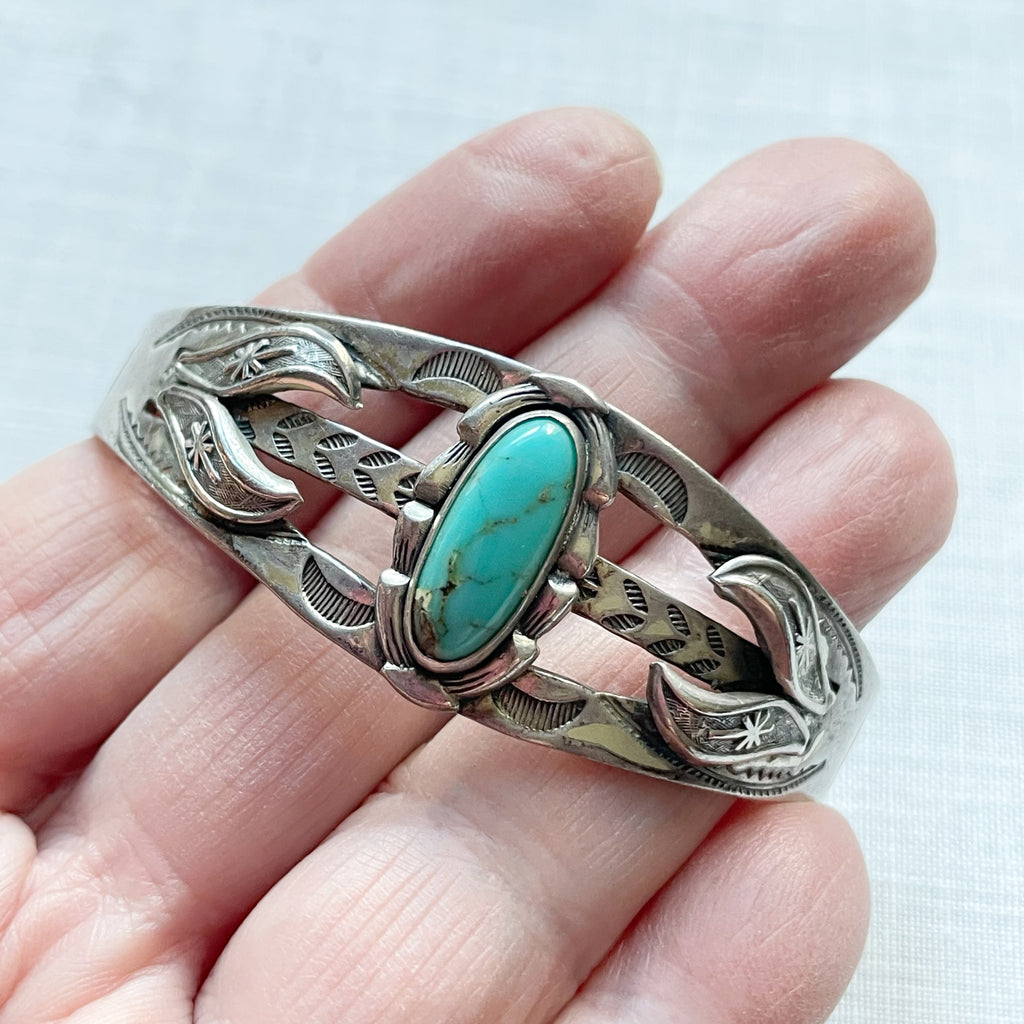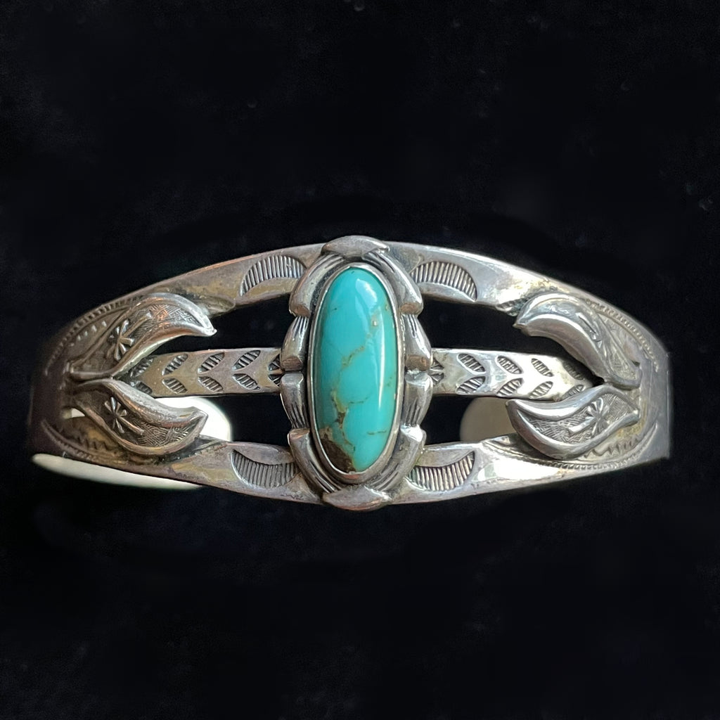 Sterling Silver, turquoise stone in the center. raised details and stamping on the sides: arrows, morning star, sun rays & more.