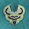 It is a Mayan-style face surrounded by swirls. The piece is from the Mask series.