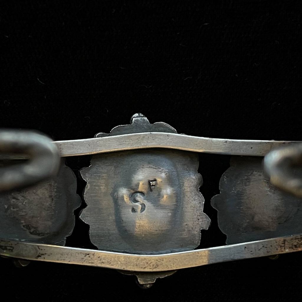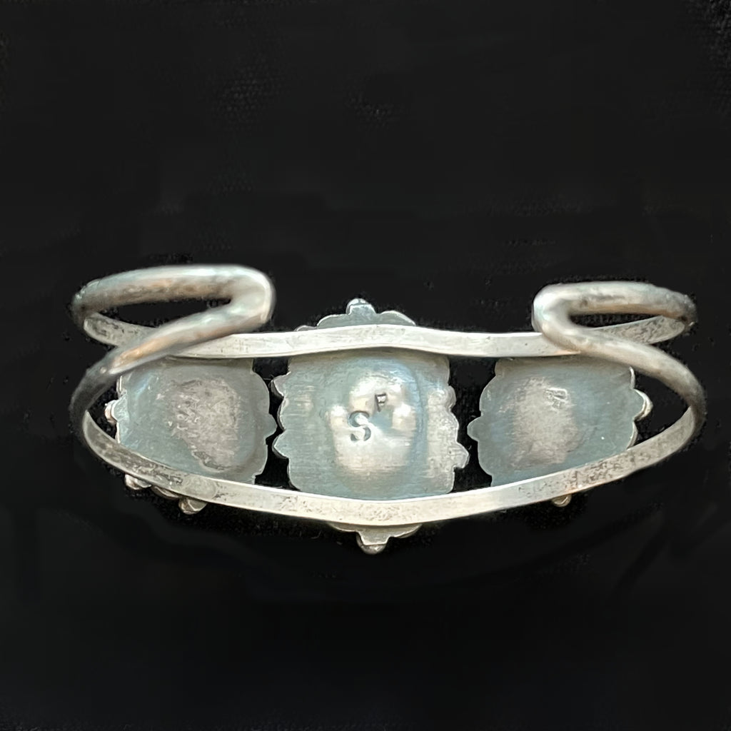 3 bezel set stones on a shank bracelet. Scalloped and ball details.