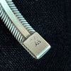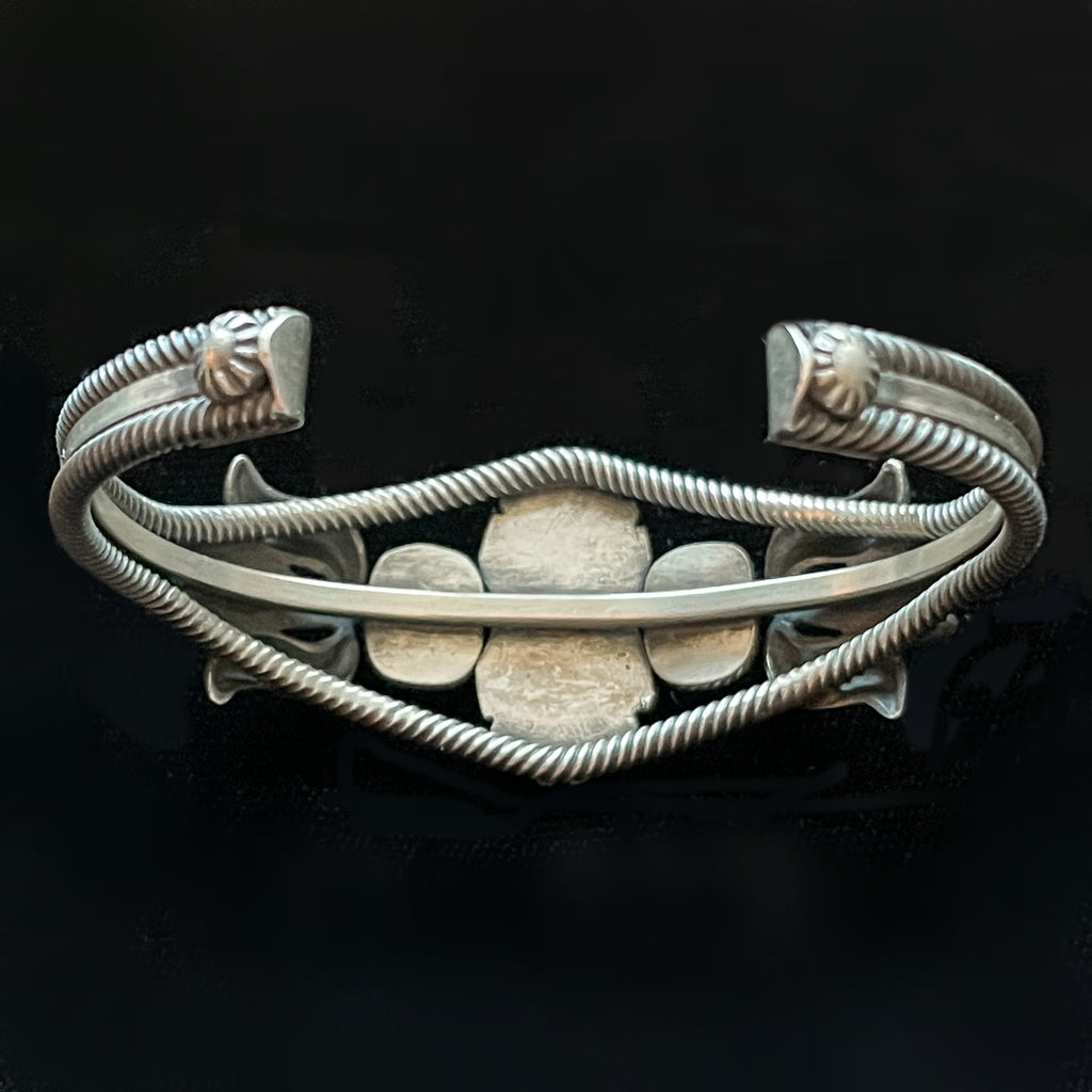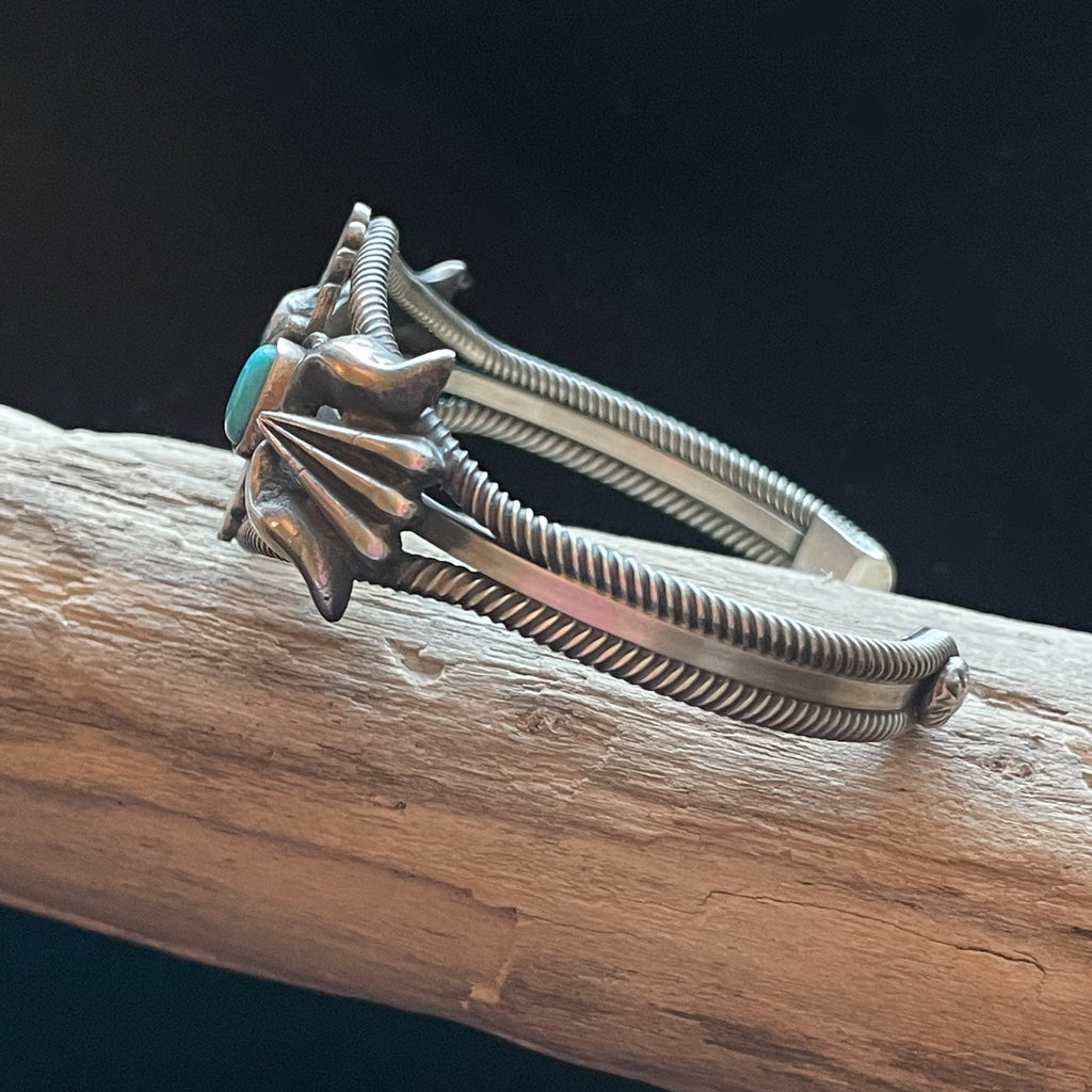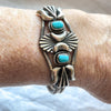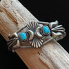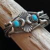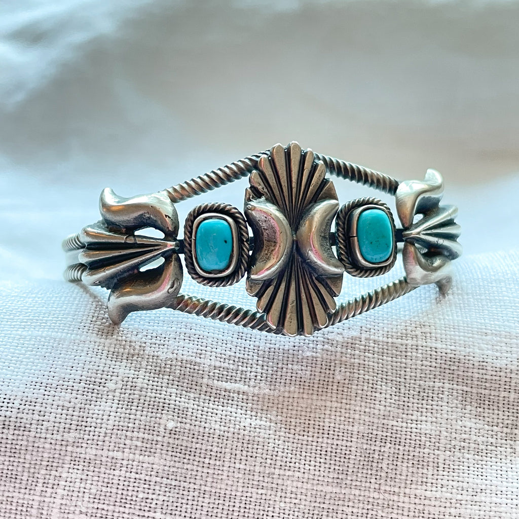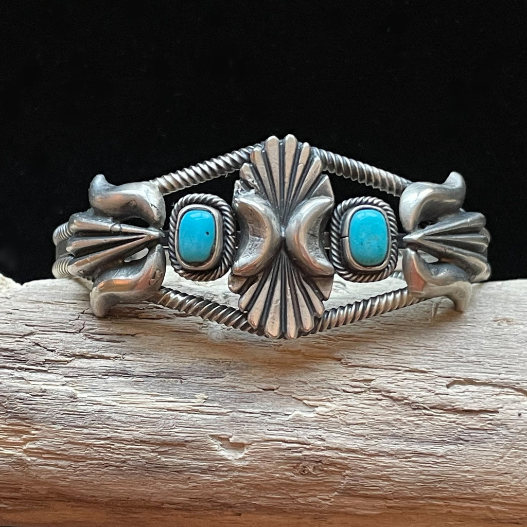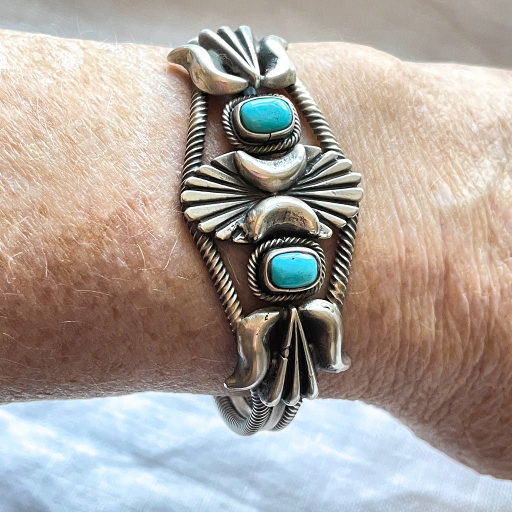 Measures 1 inch wide with two Natural Turquoise stones accenting the Sterling Crescent shape design.