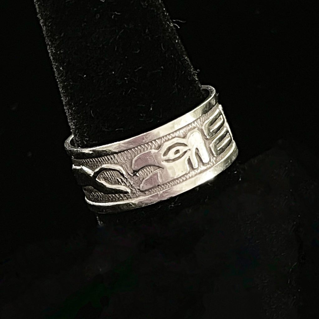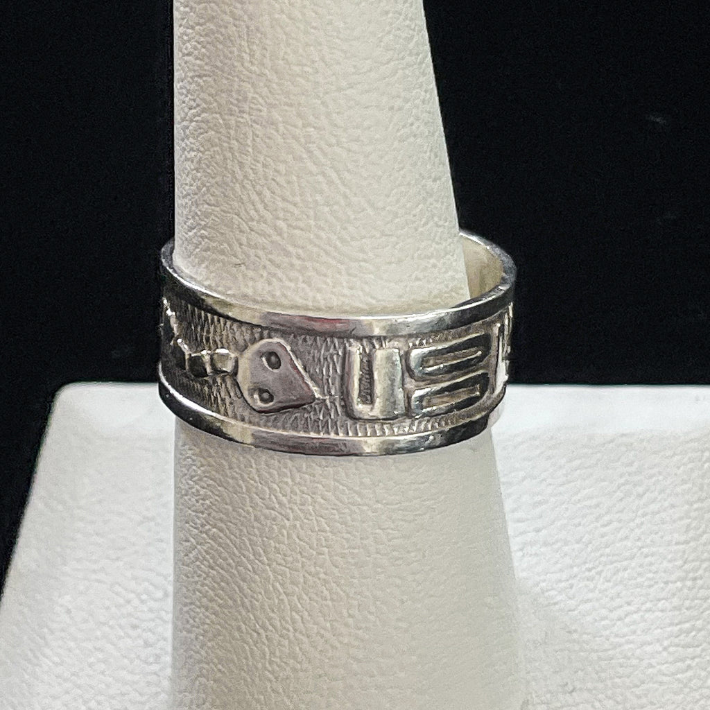 Vintage sterling silver band ring with all over southwestern Mayan pattern.