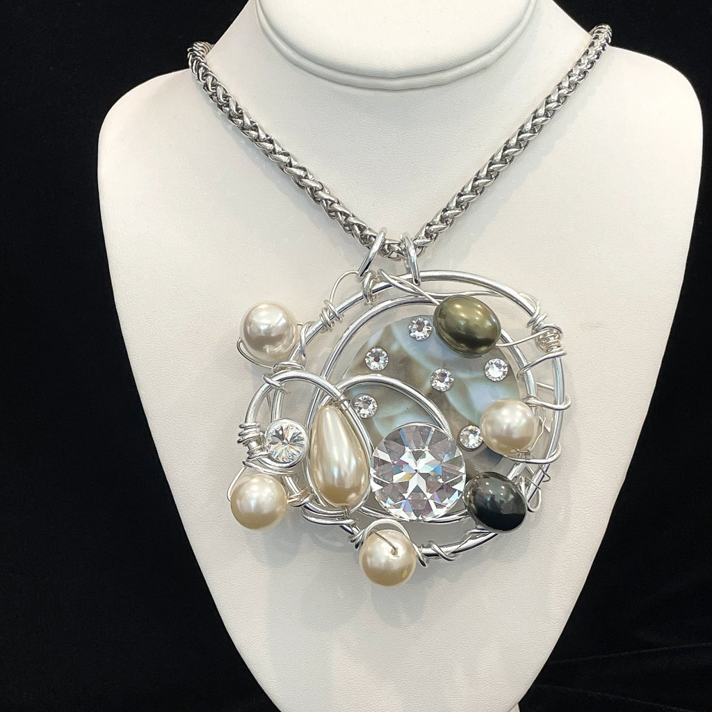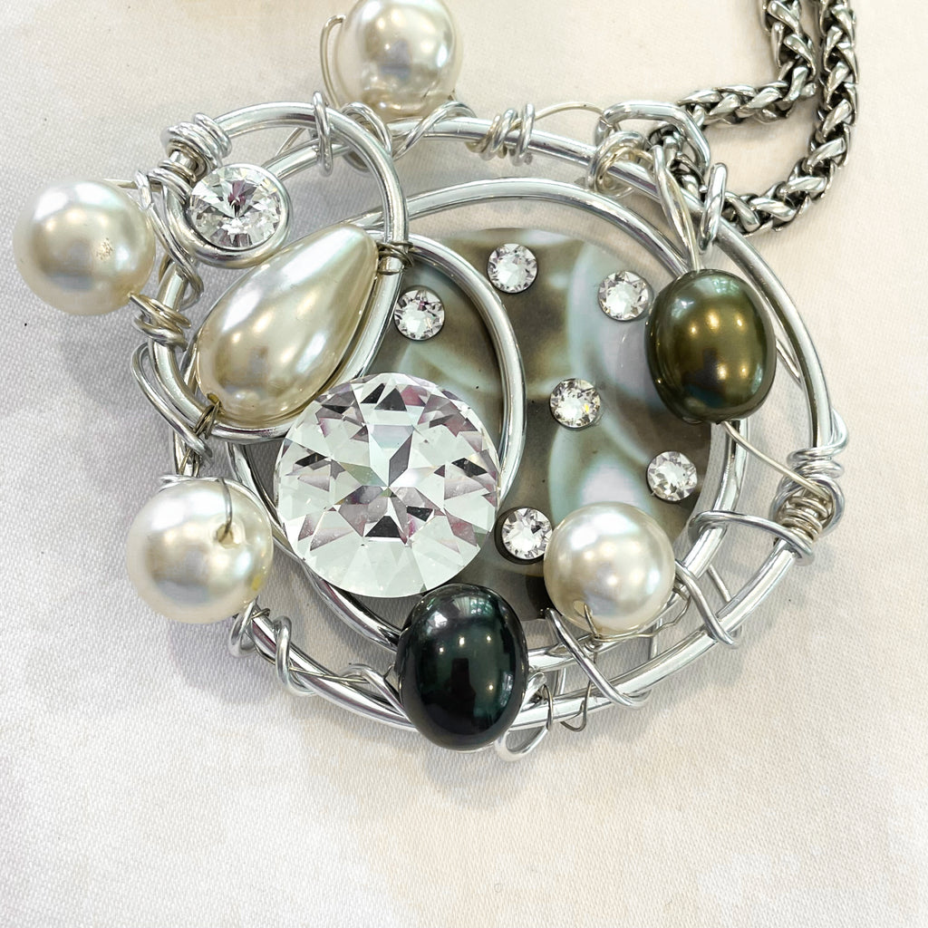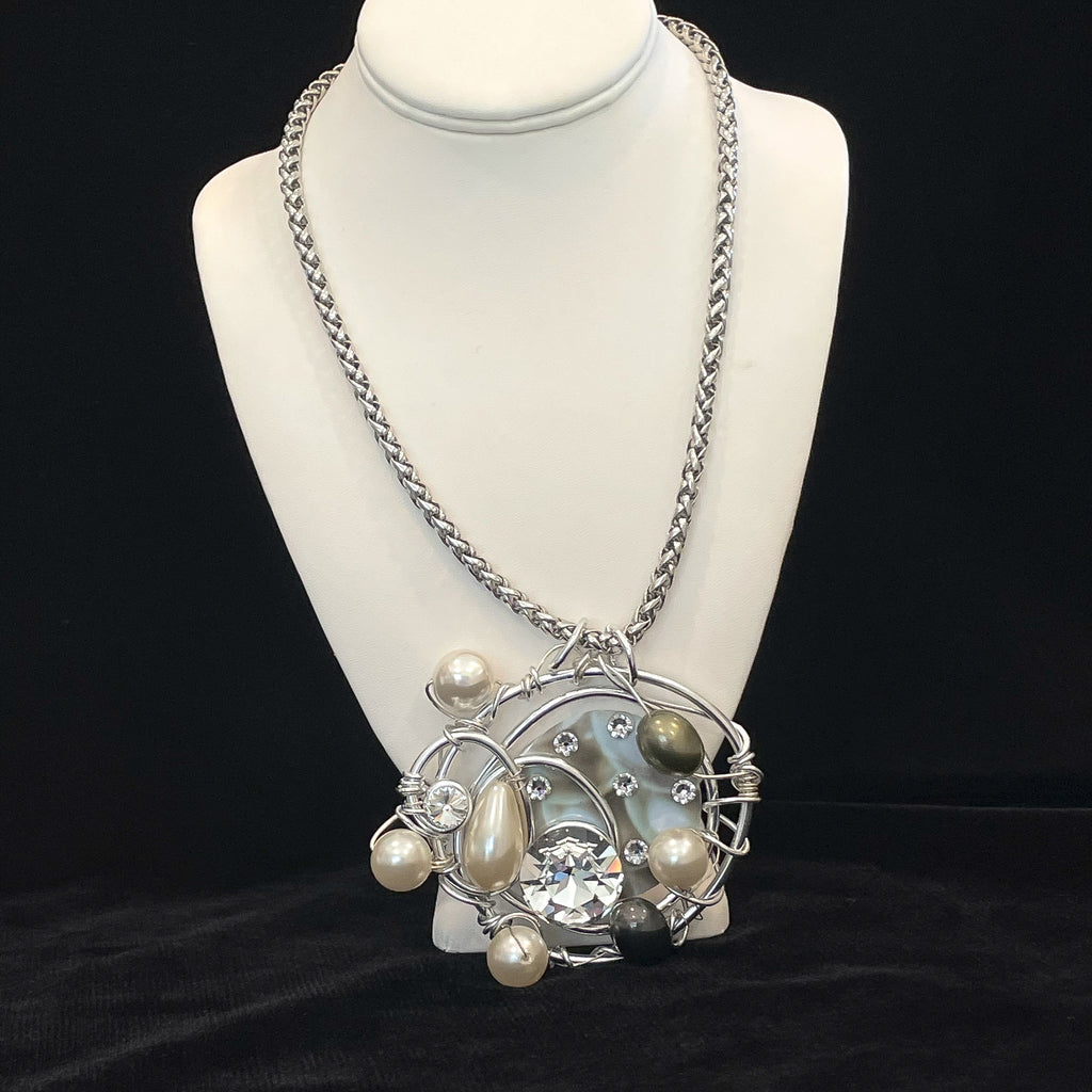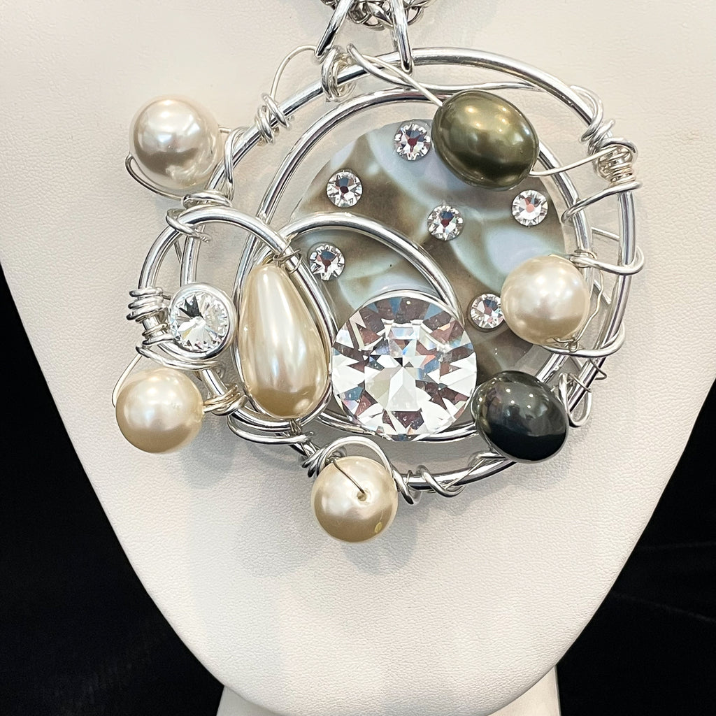 Materials: Swarovski crystals, faux pearls, faux MOP. Silver tone metal & chain.