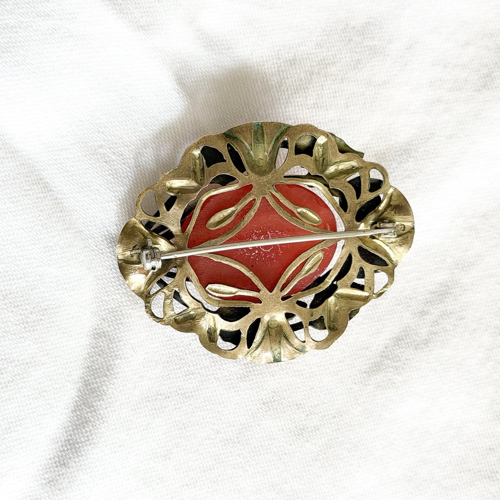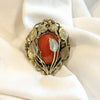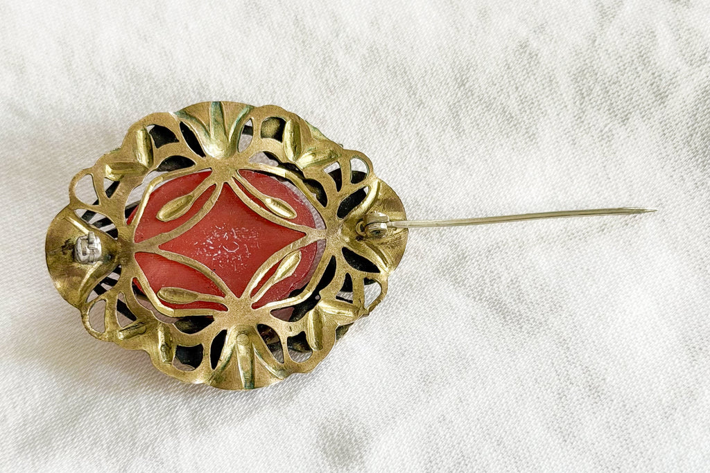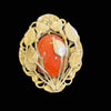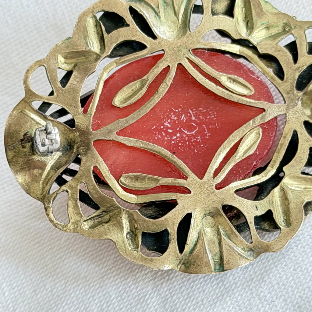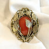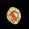 The stone may be carnelian or glass. Gold tone metal either brass or bronze.