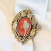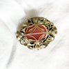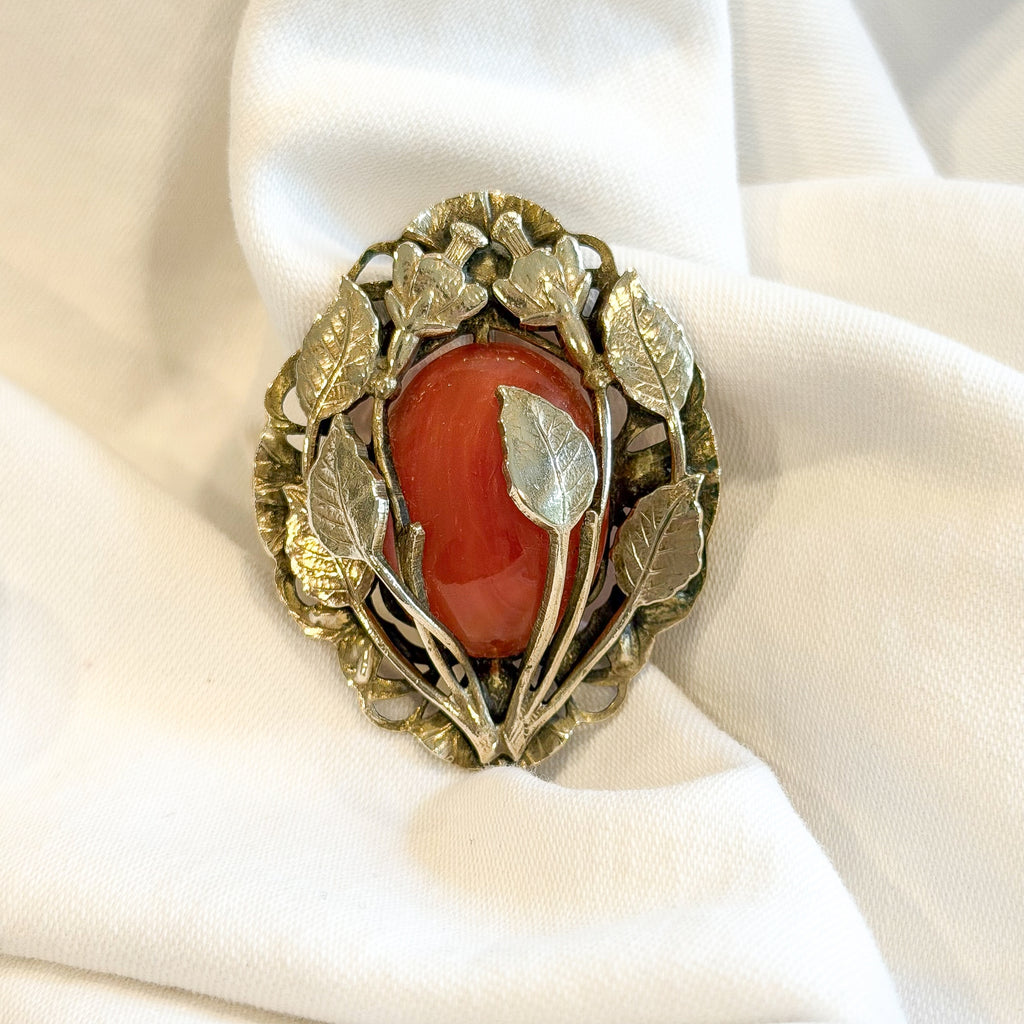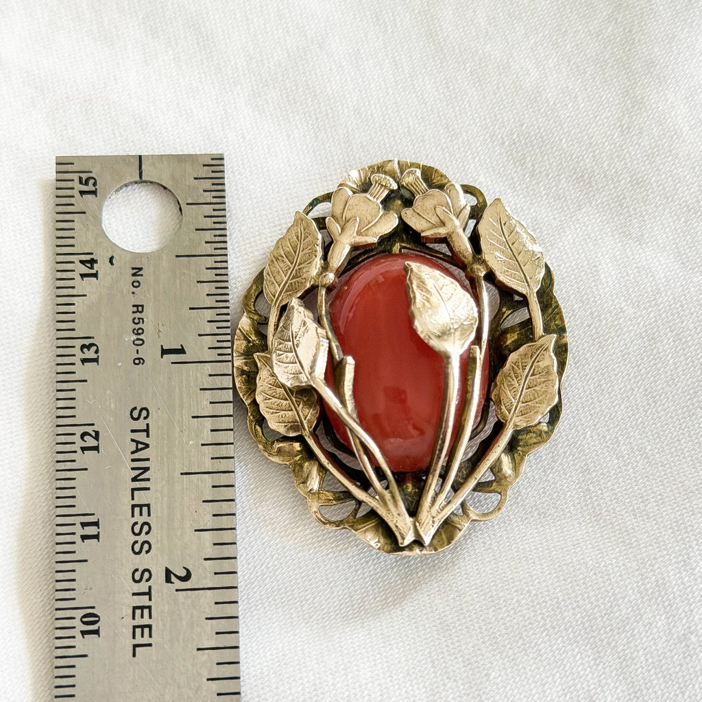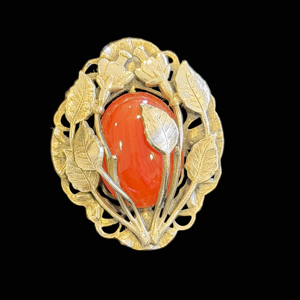 Antique brooch with orange stone. Leaves wrap around the stone, thistle flowers on top.