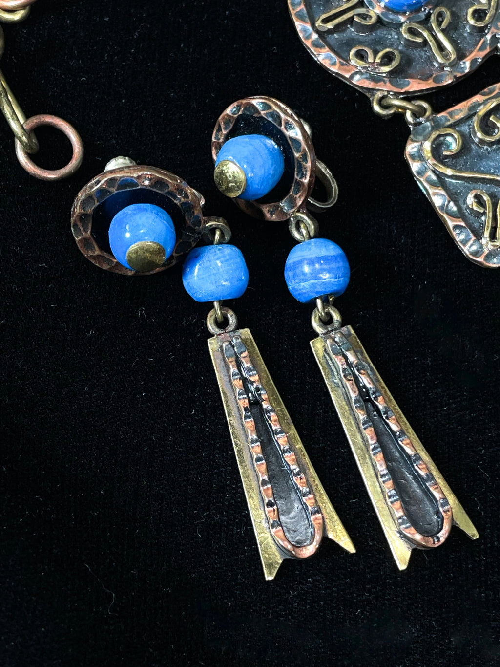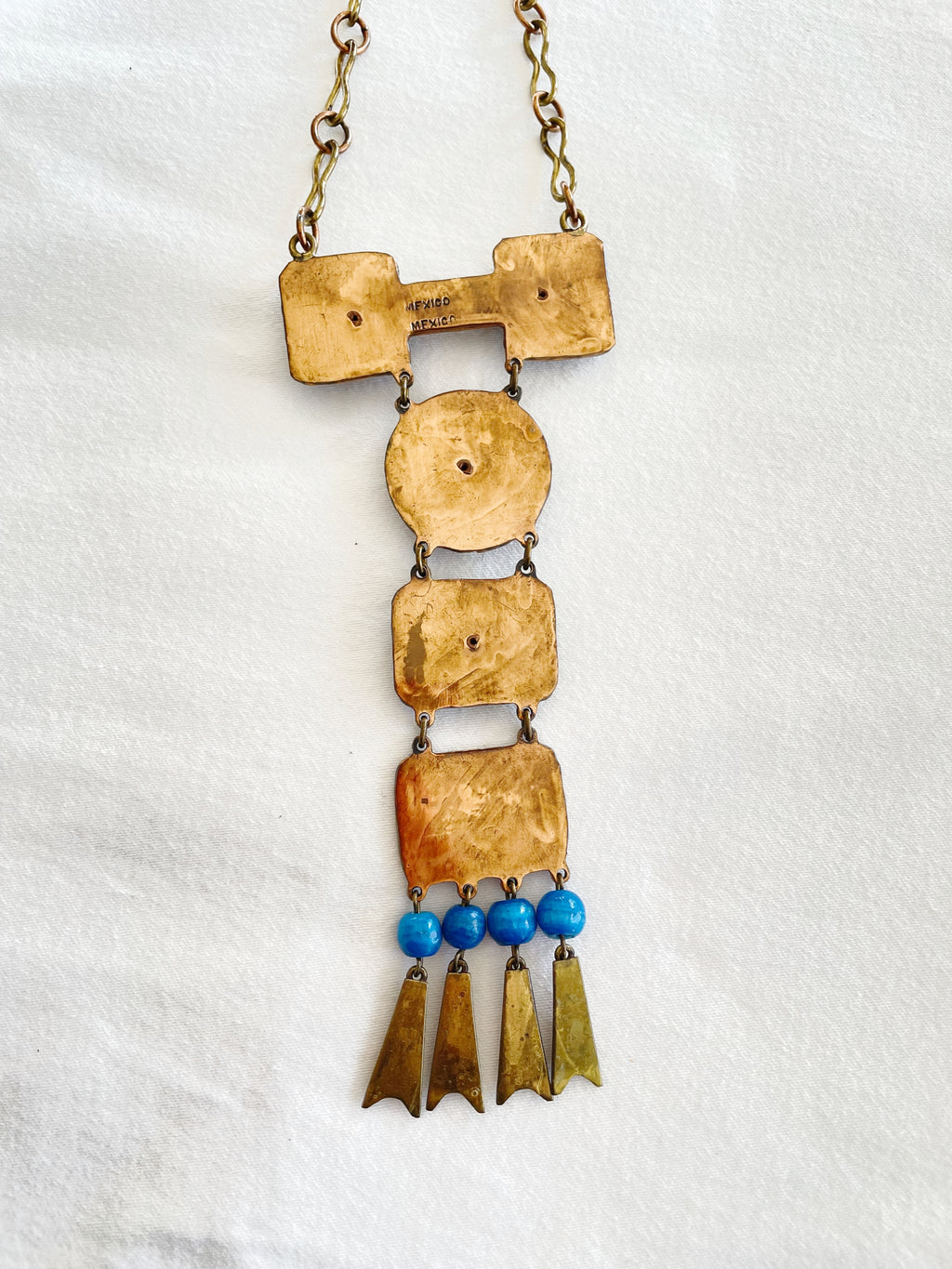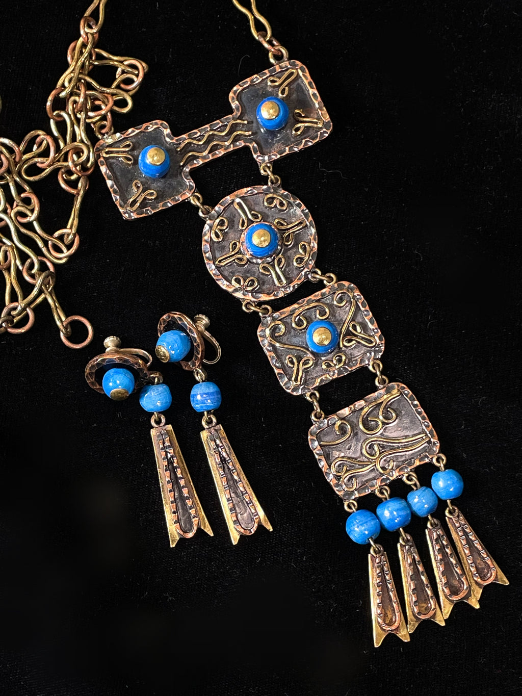 Vintage Casa Maya Aztec/Mayan style long segmented pendant necklace and a pair of earrings.