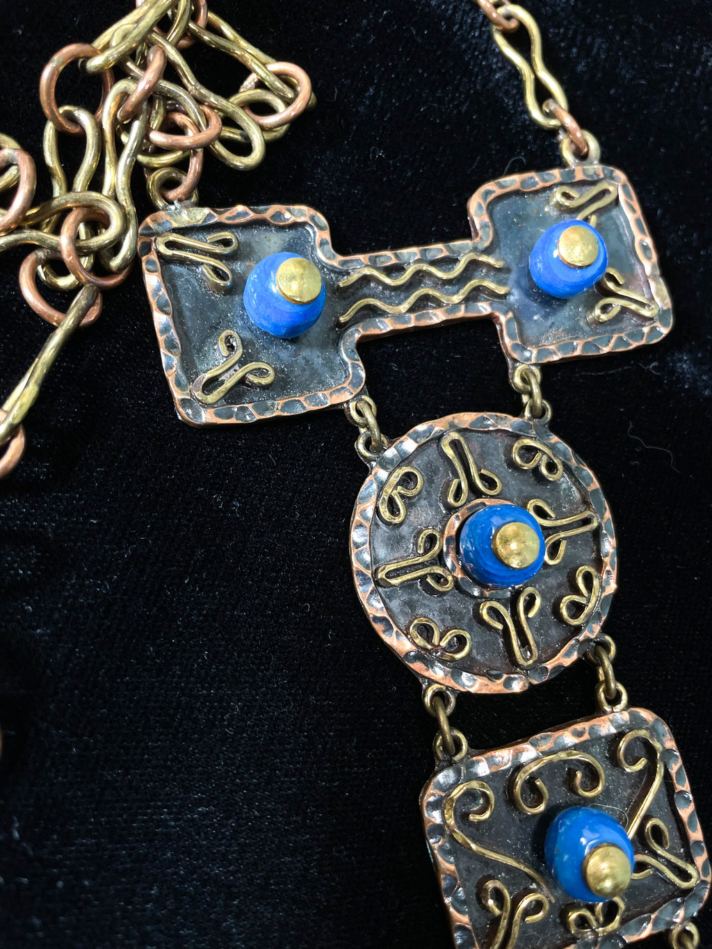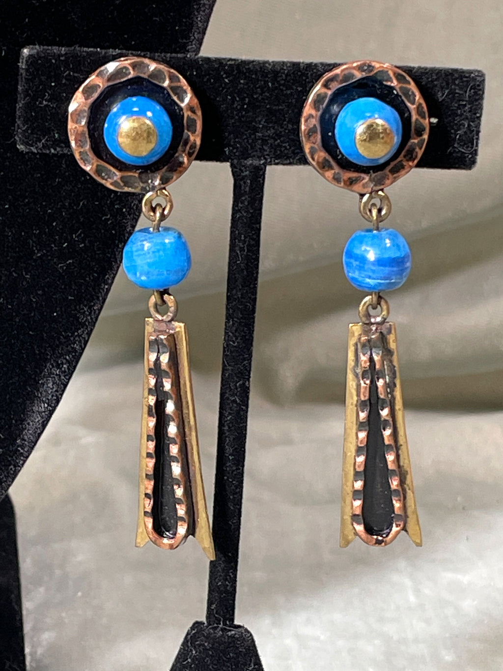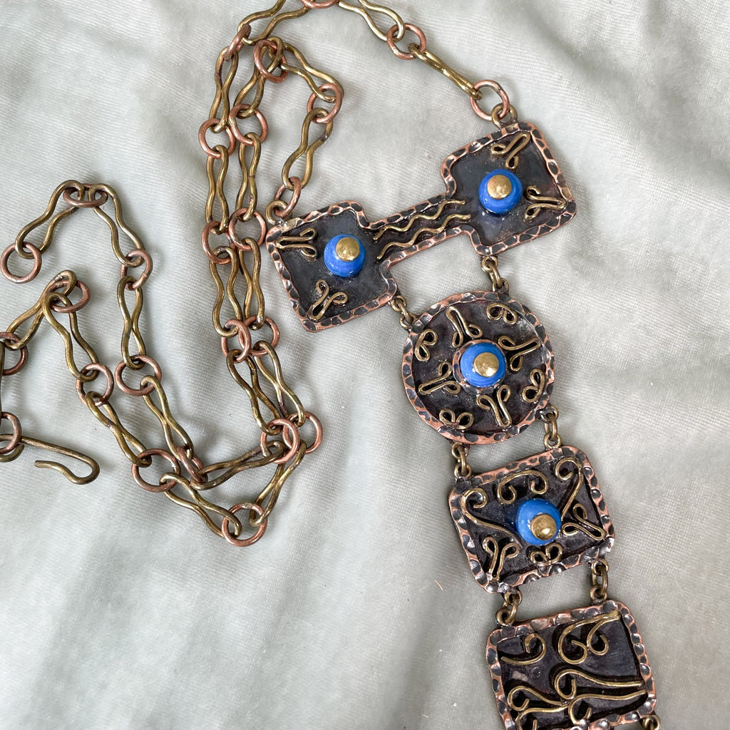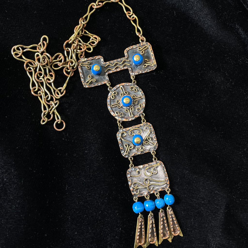 Vintage Casa Maya Aztec/Mayan style long segmented pendant necklace and a pair of earrings.