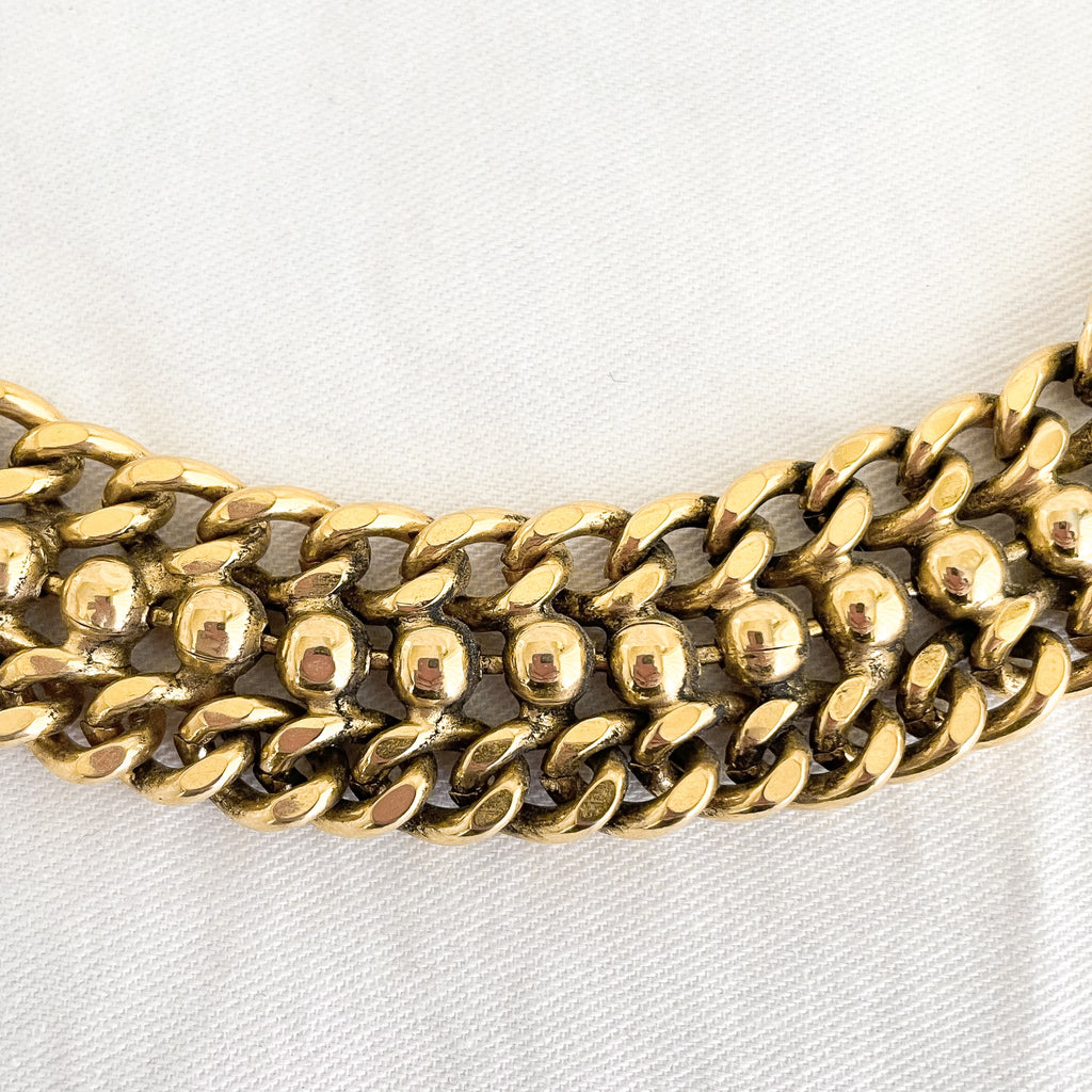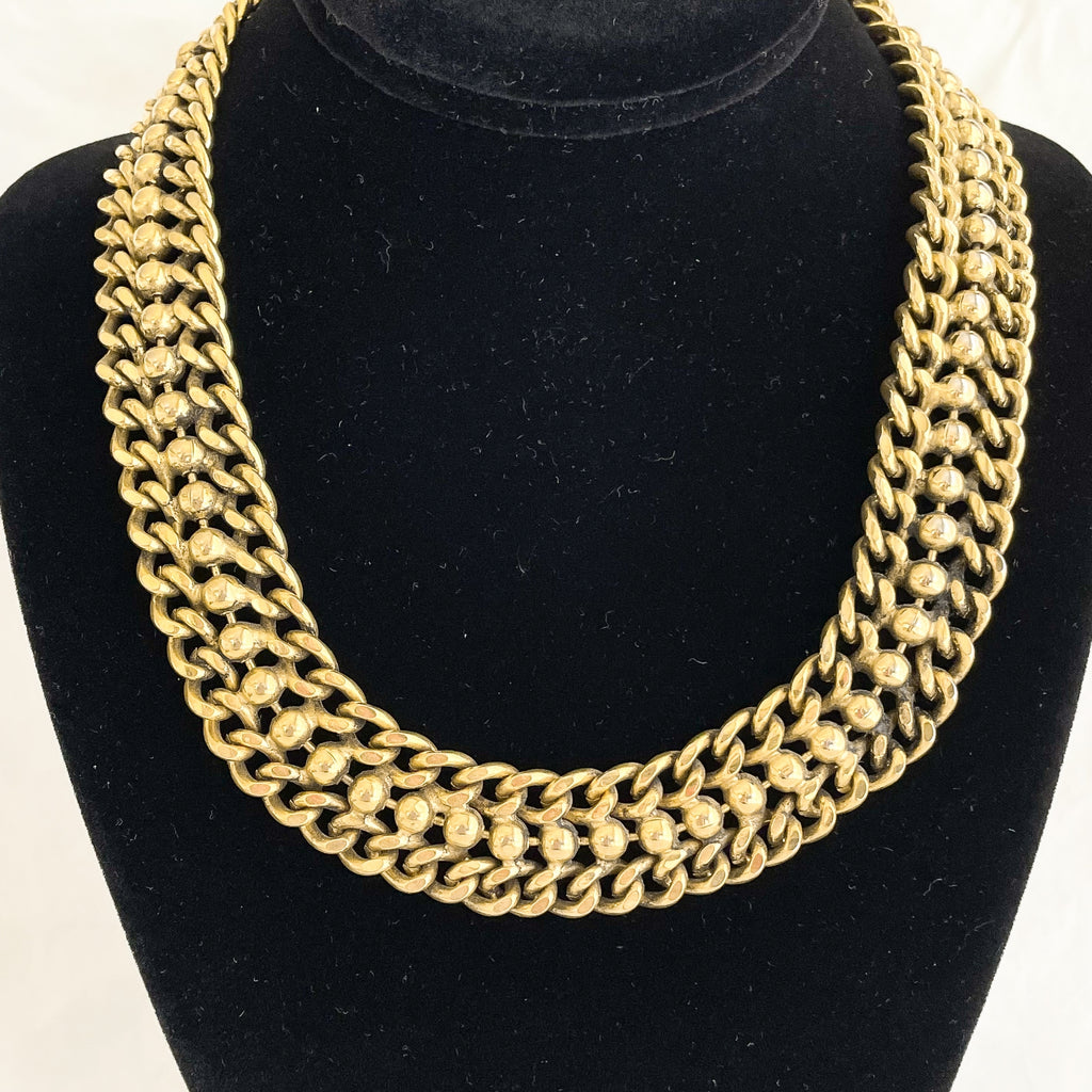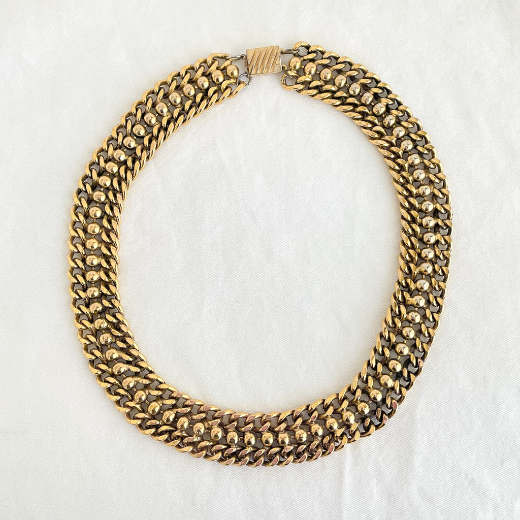 Vintage gold tone double link chain necklace with ball detail in the center.