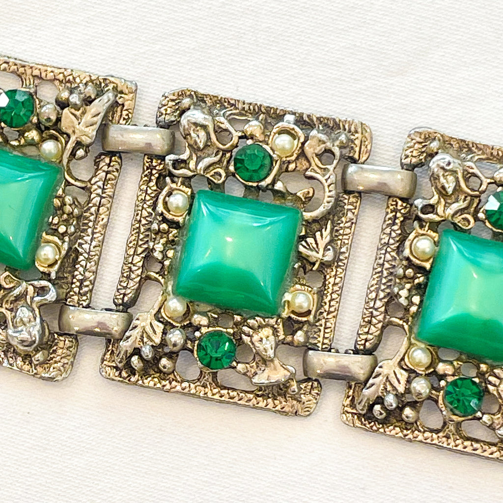 5 panel bracelet, large panels, gold tone, green rhinestones, raised Lucite green moonstones/moonglow, faux pearls women's faces and leaf details. Clasp closure. Great details!