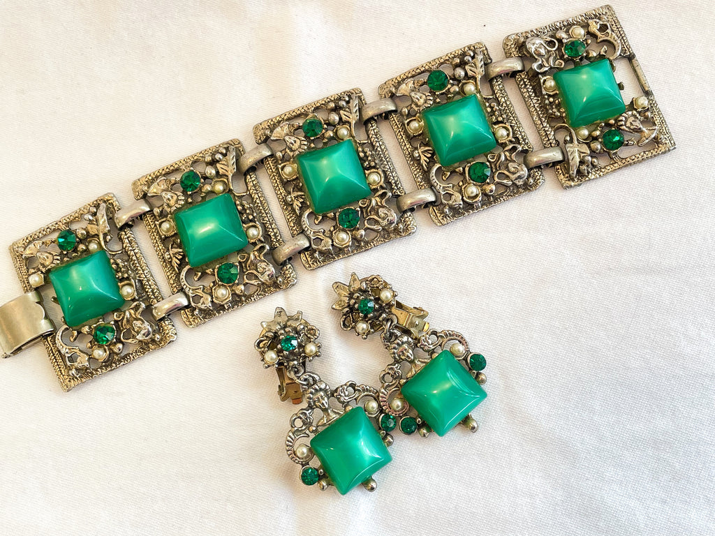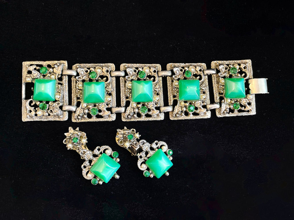 Amazing Vintage gold tone green Lucite moonglow bracelet set with 1 pair matching earrings.