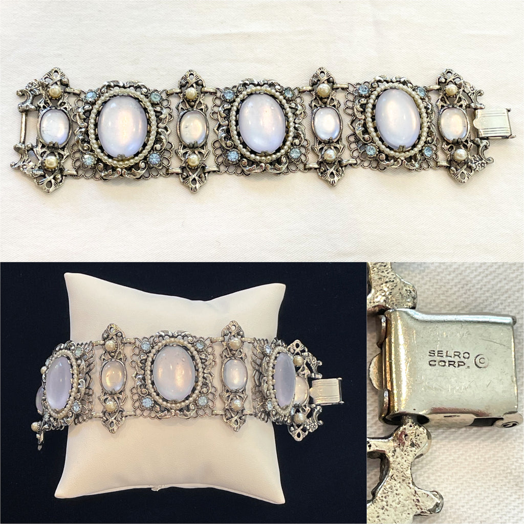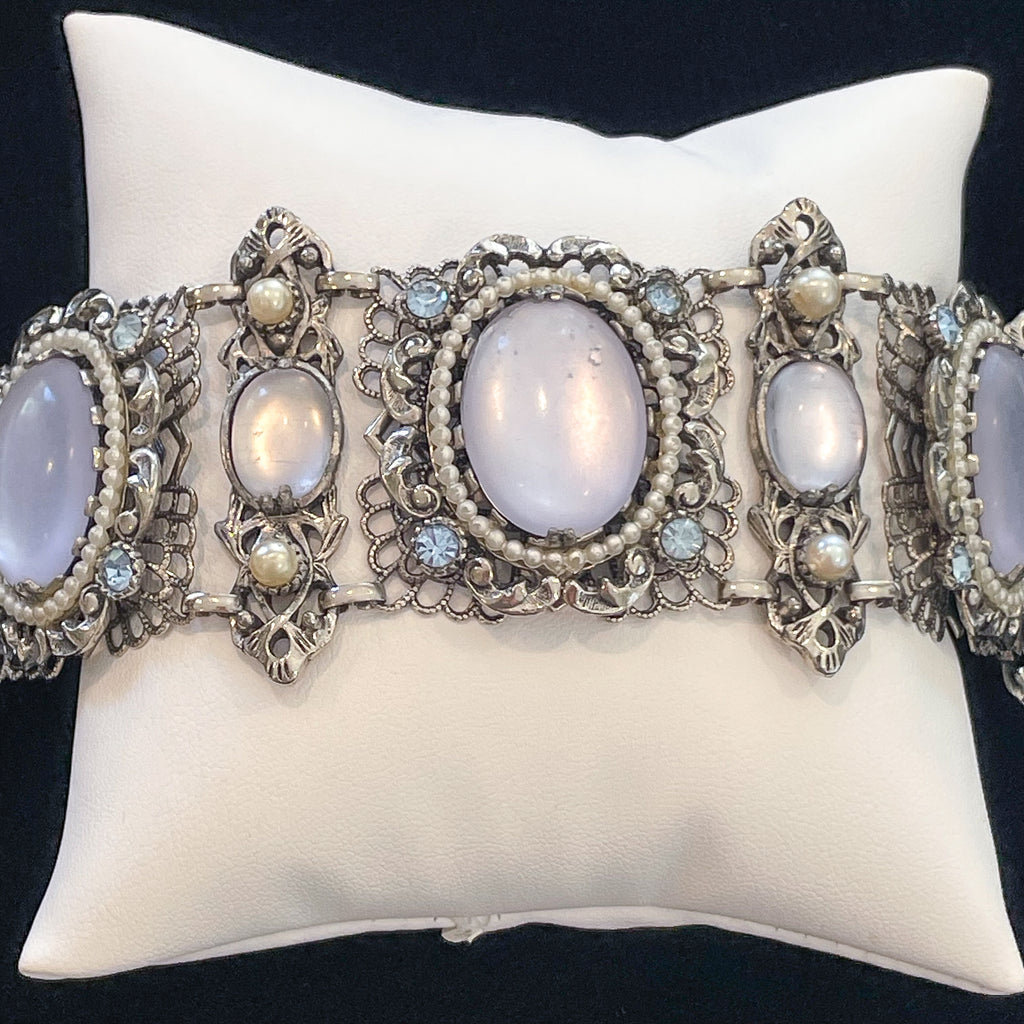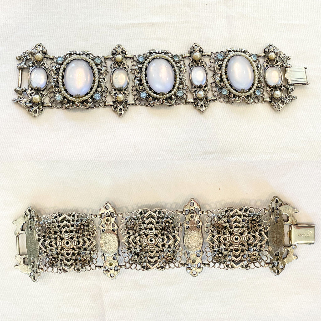 Vintage elaborate silver tone Selro bracelet with 3 large & 4 smaller 'moonglow moonstones, faux pearls, blue rhinestones.