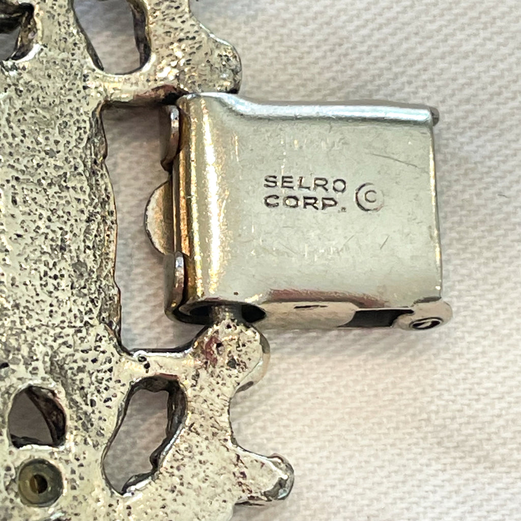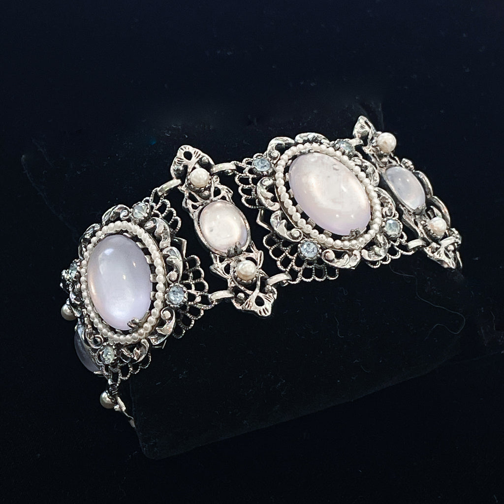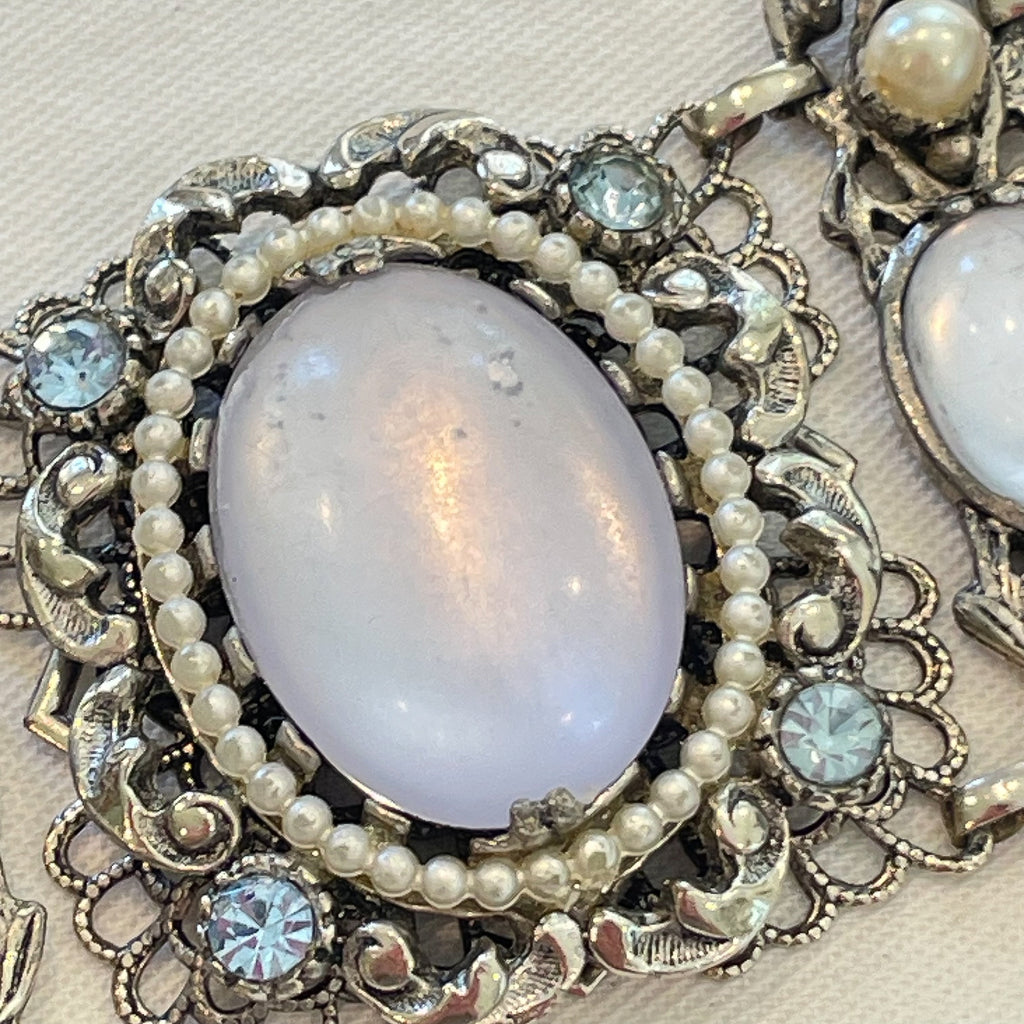 Vintage elaborate silver tone Selro bracelet with 3 large & 4 smaller 'moonglow moonstones, faux pearls, blue rhinestones.