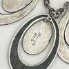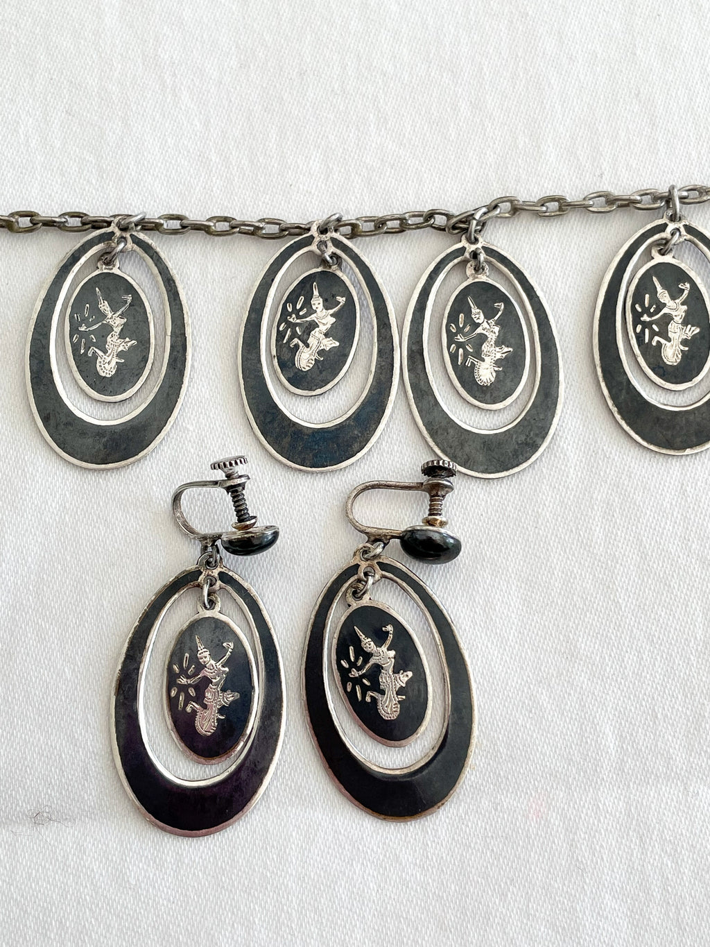 7 etched discs on a silver chain necklace with matching pair of earrings. Articulated discs.