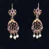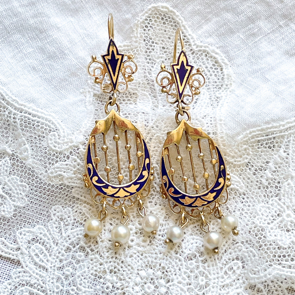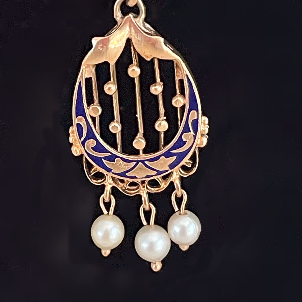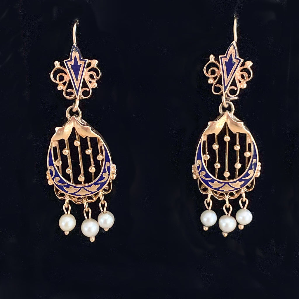 Beautiful Victorian 14K gold earrings with pearls and blue enamel accents.