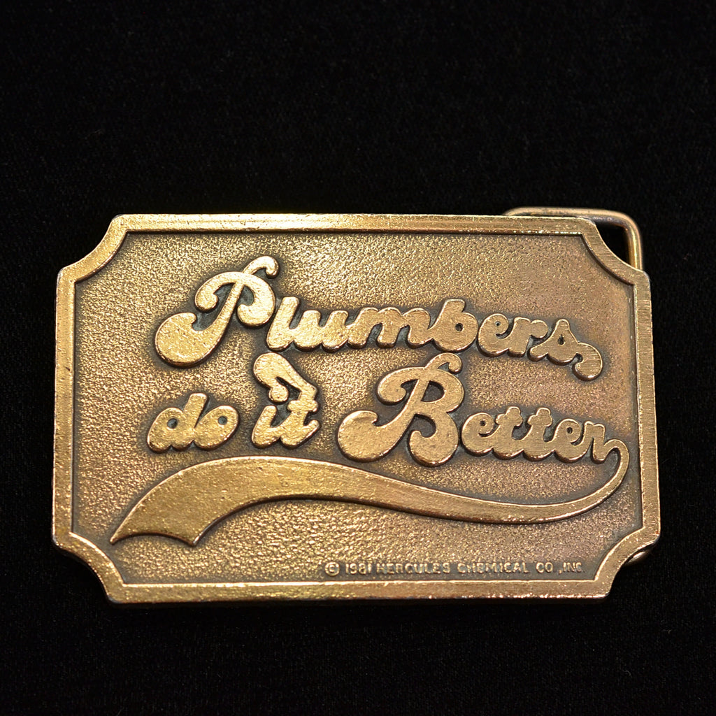 Vintage 80s "Plumbers Do It Best" brass belt buckle.