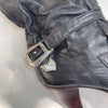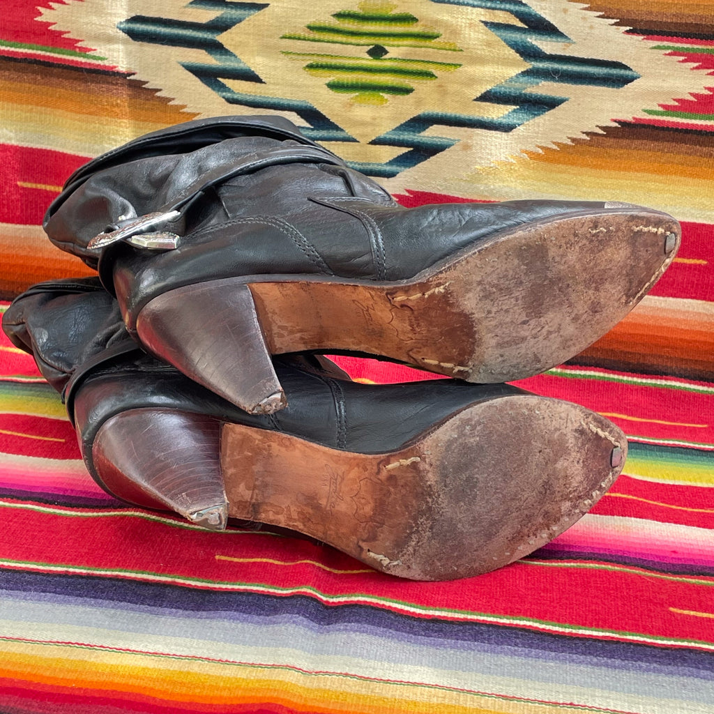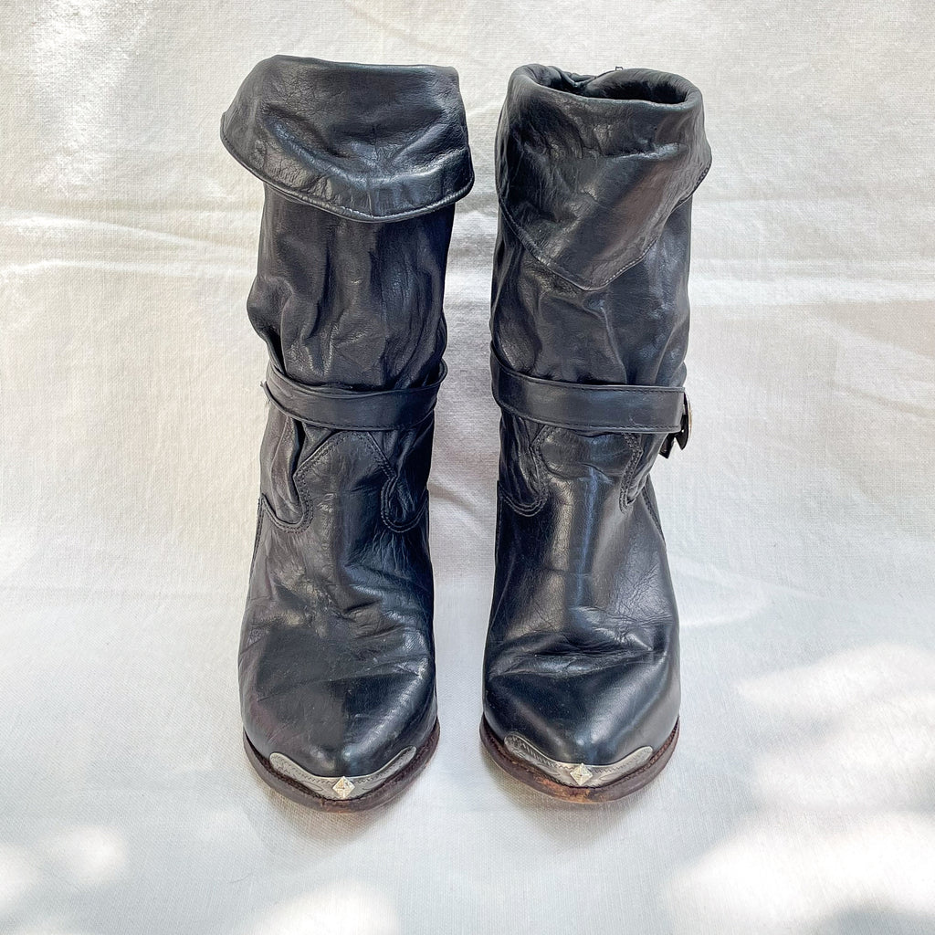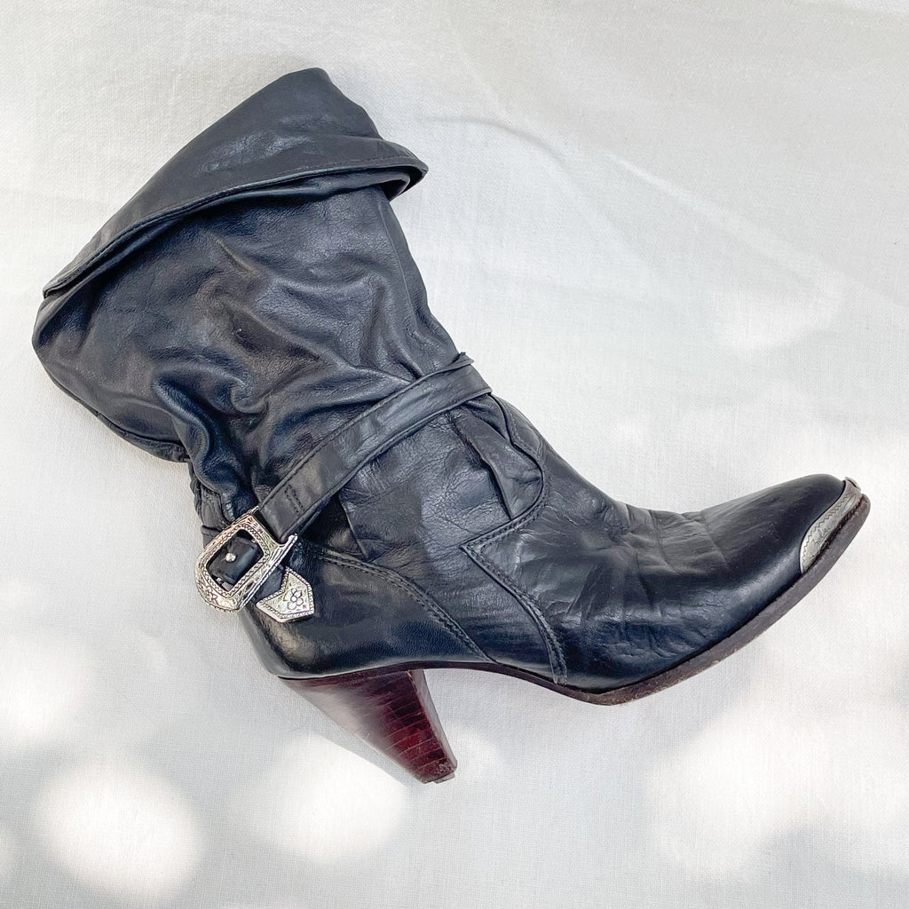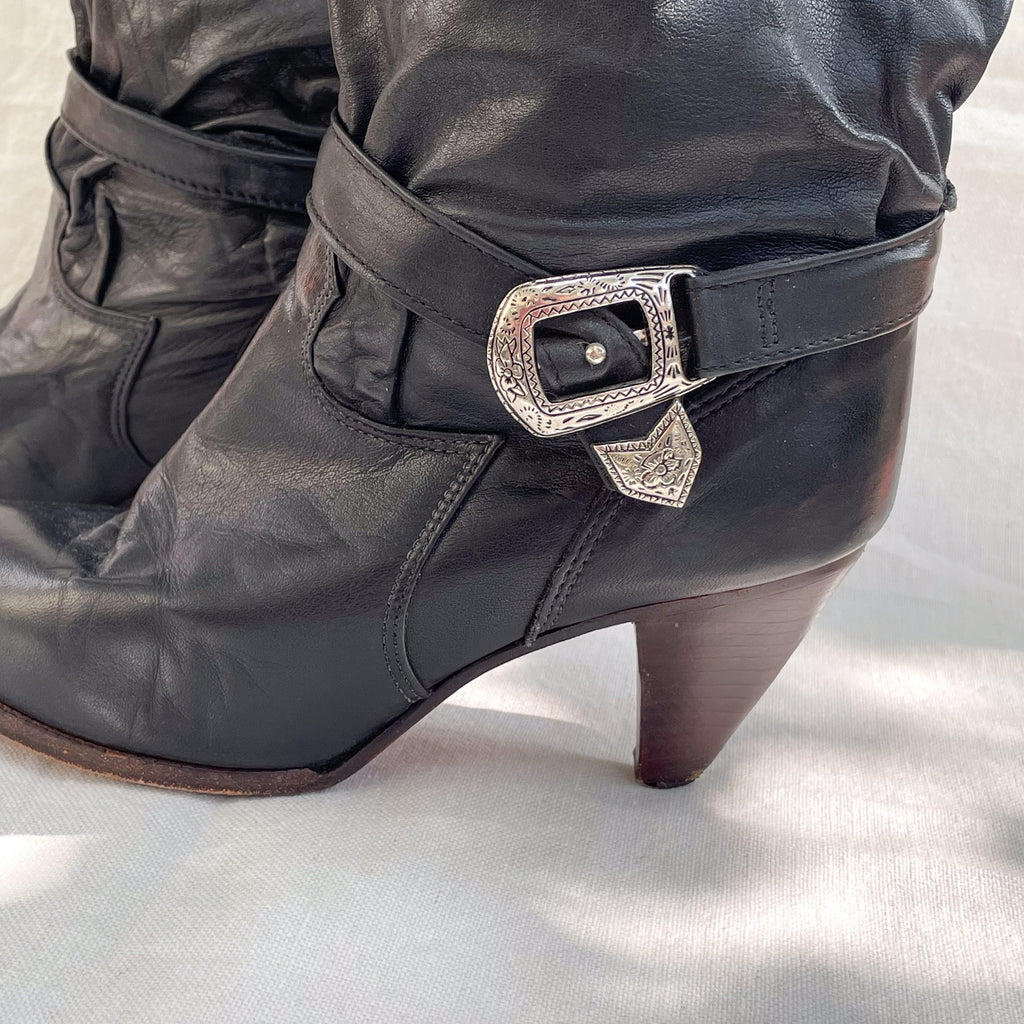 Vintage 80s black leather ankle booties.Slouchy style, ankle straps with a buckle, metal toe caps.Stacked high heels.Slip on boots. LABEL: Zodiac CONDITION: Overall, very good, the heel caps need to be replaced.