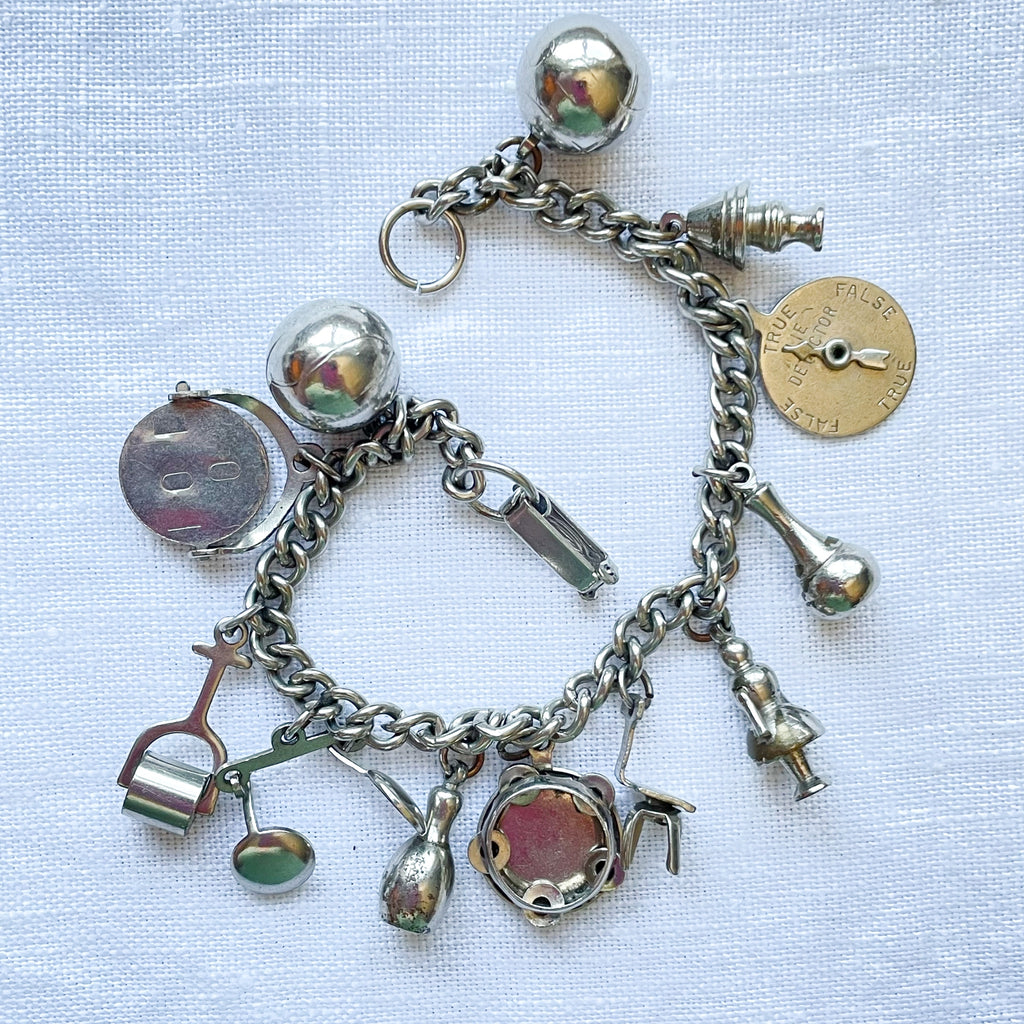 SOLD Vintage Silver Tone Charm Bracelet, MCM Costume Jewelry Bracelet, 12 Charms