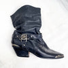 Pull on boots, with decorative metal caps & stars on the heels, toes and buckle.