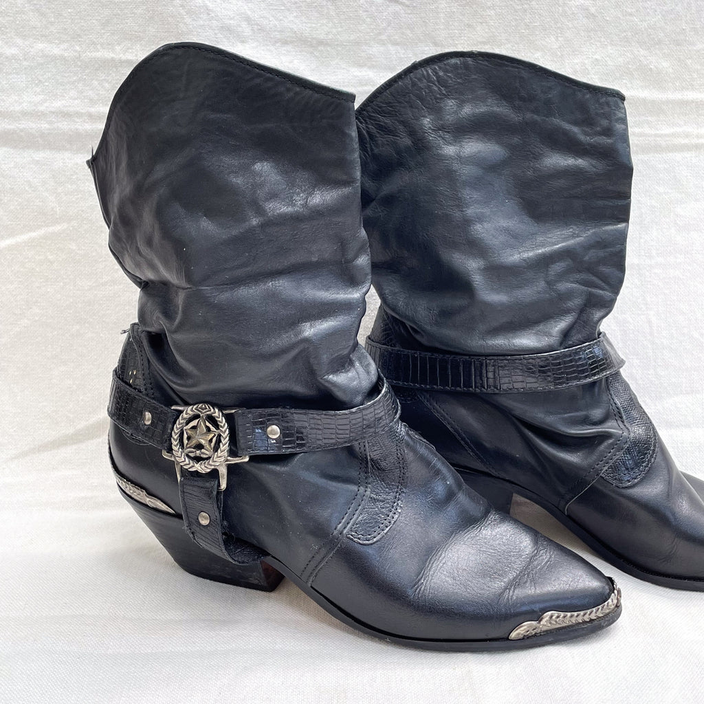 Black leather 80s slouchy black leather ankle boots with straps.