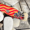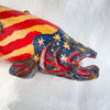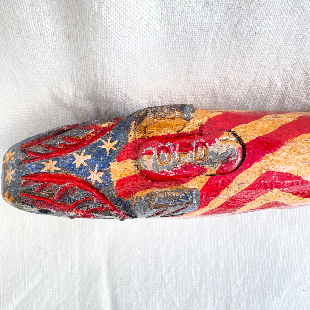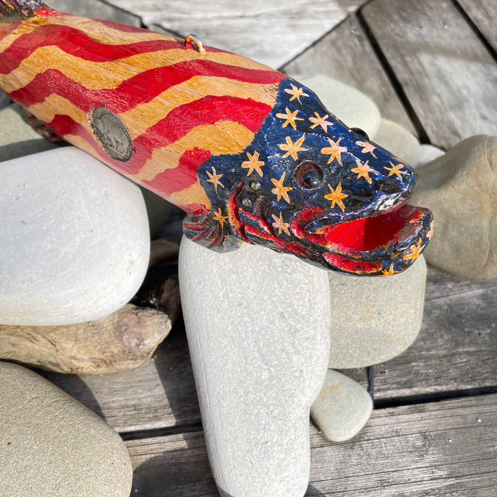 Handmade painted wood with inset Indian head penny & Indian head nickel, and glass eyes.