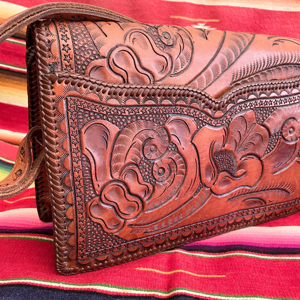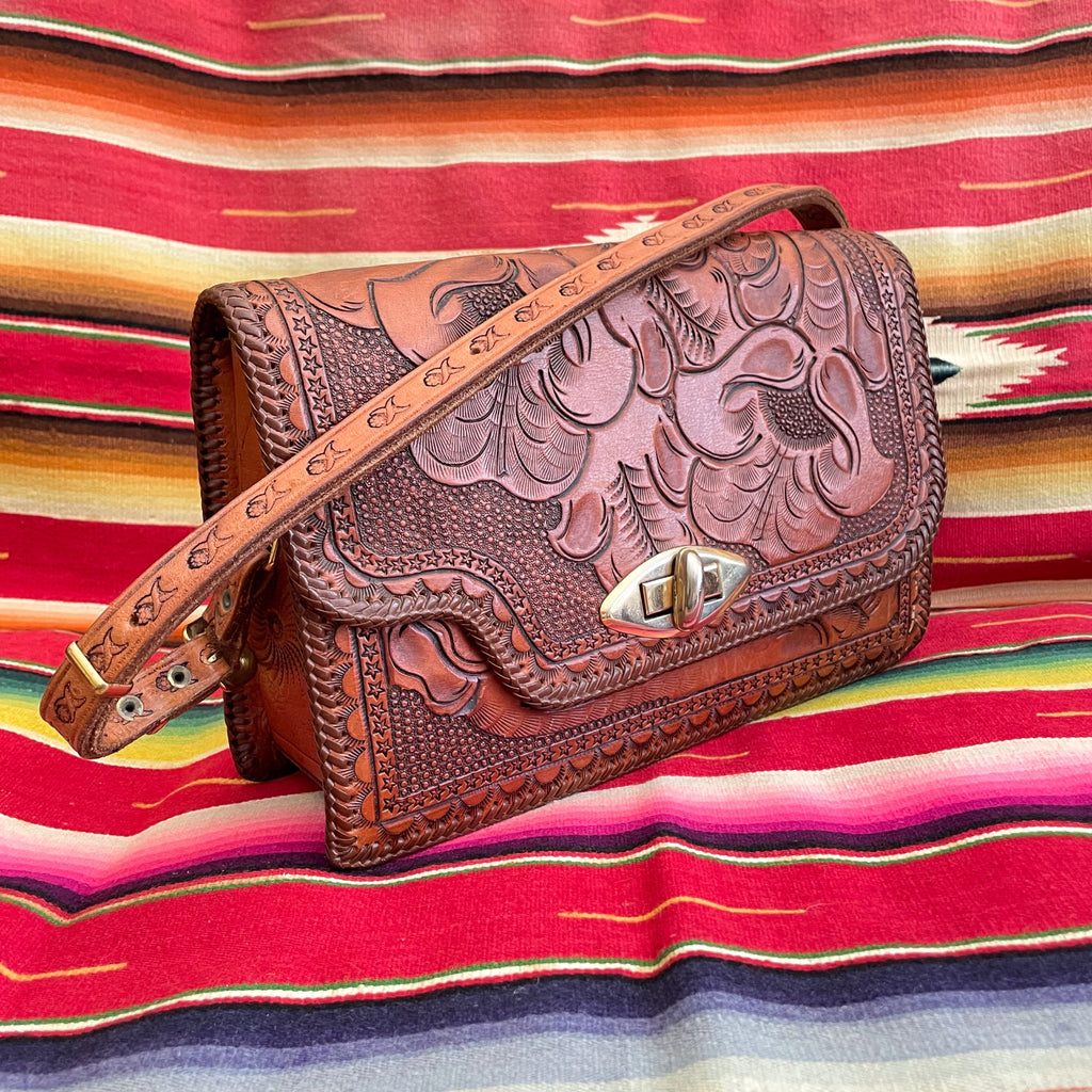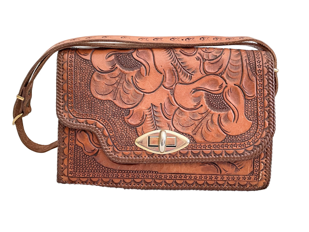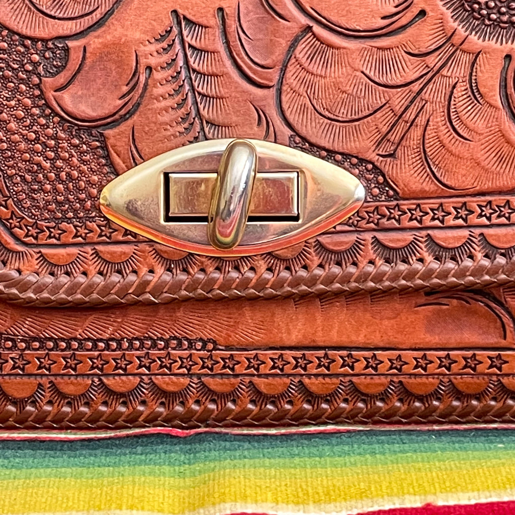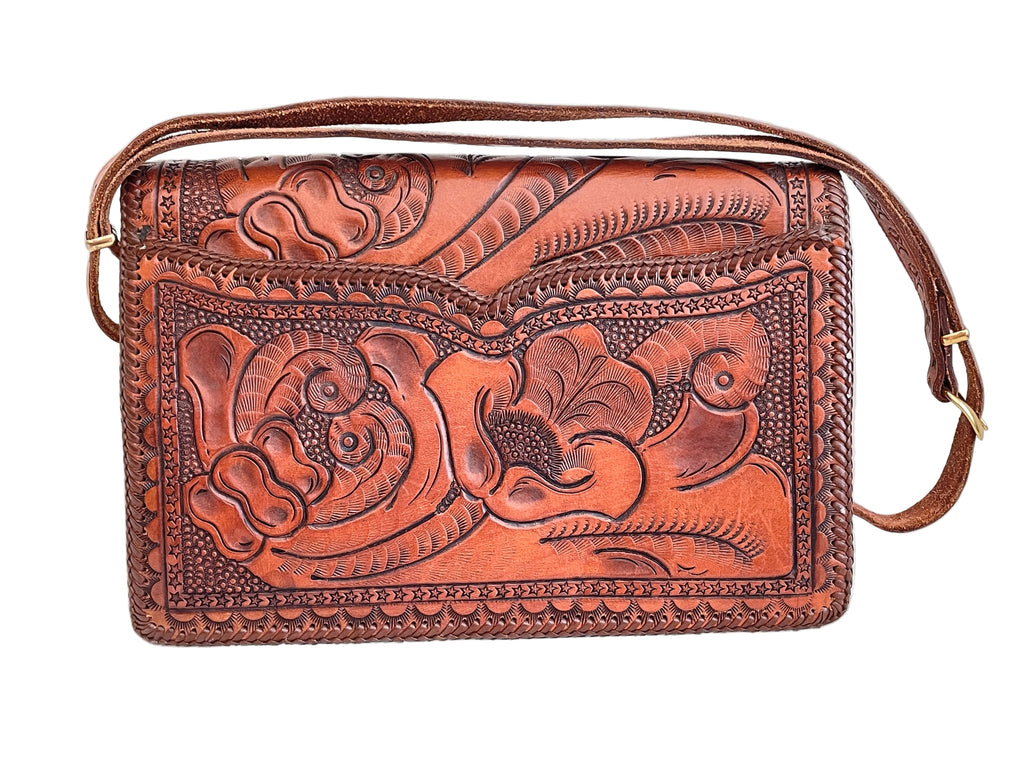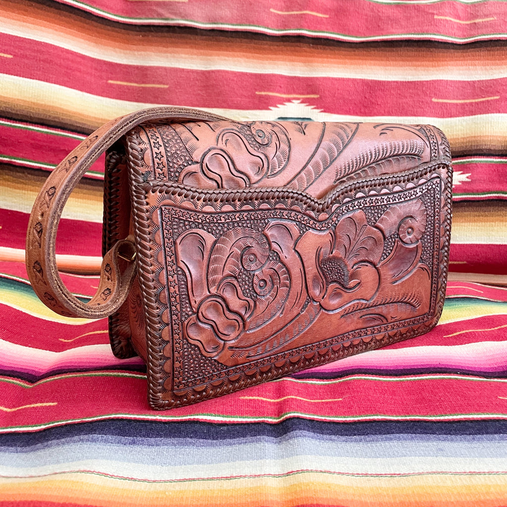 Vintage tooled leather handbag with gorgeous hand tooled flowers and other details.