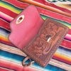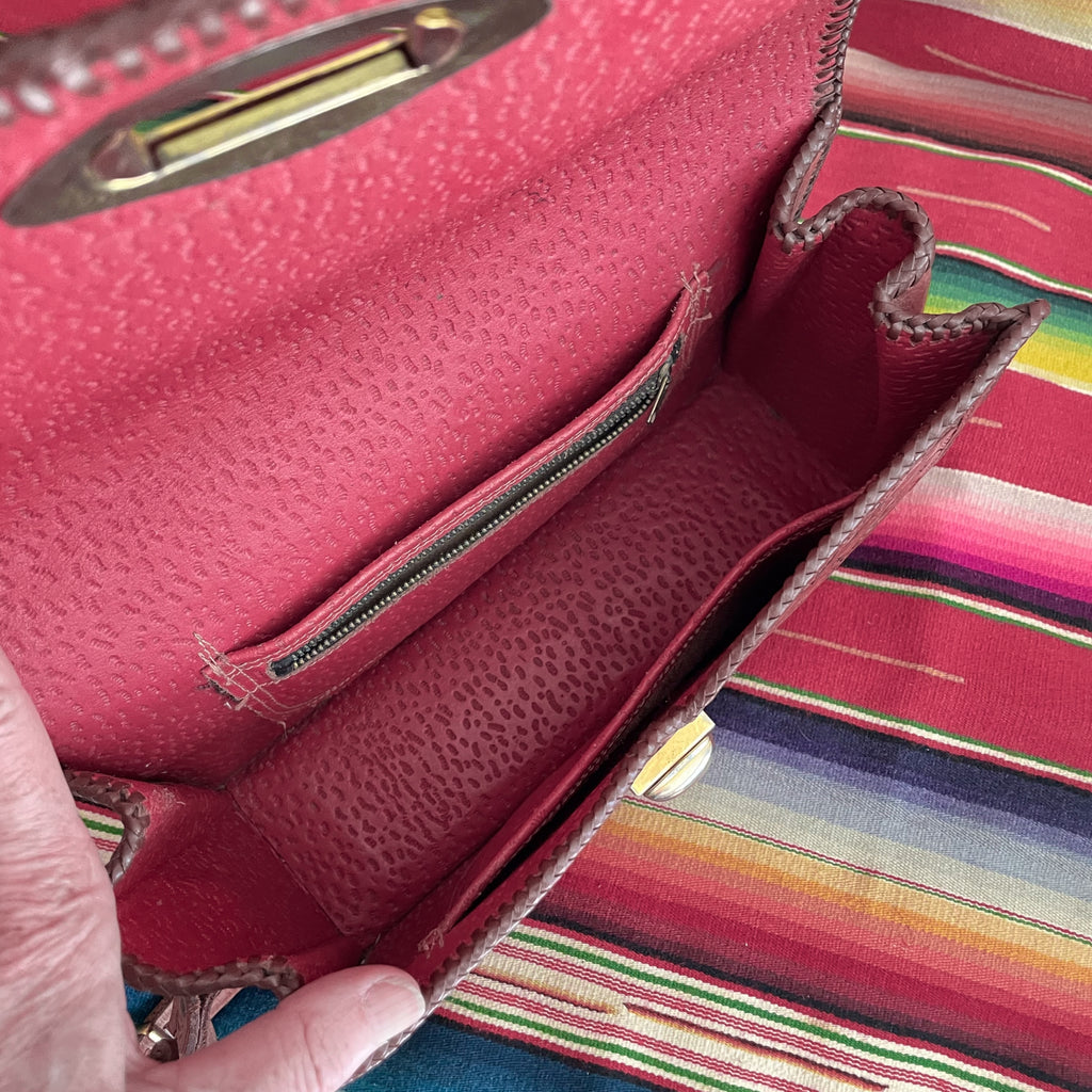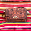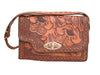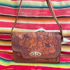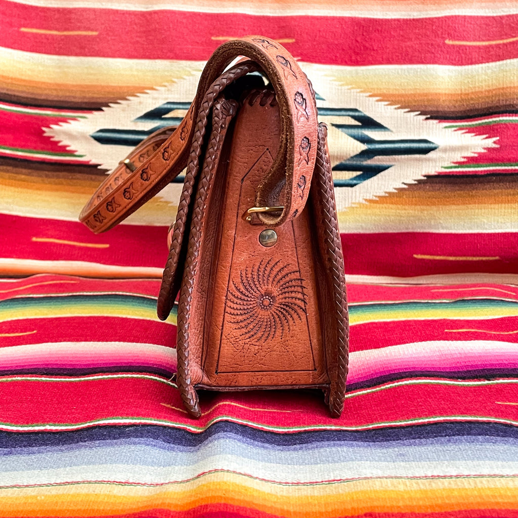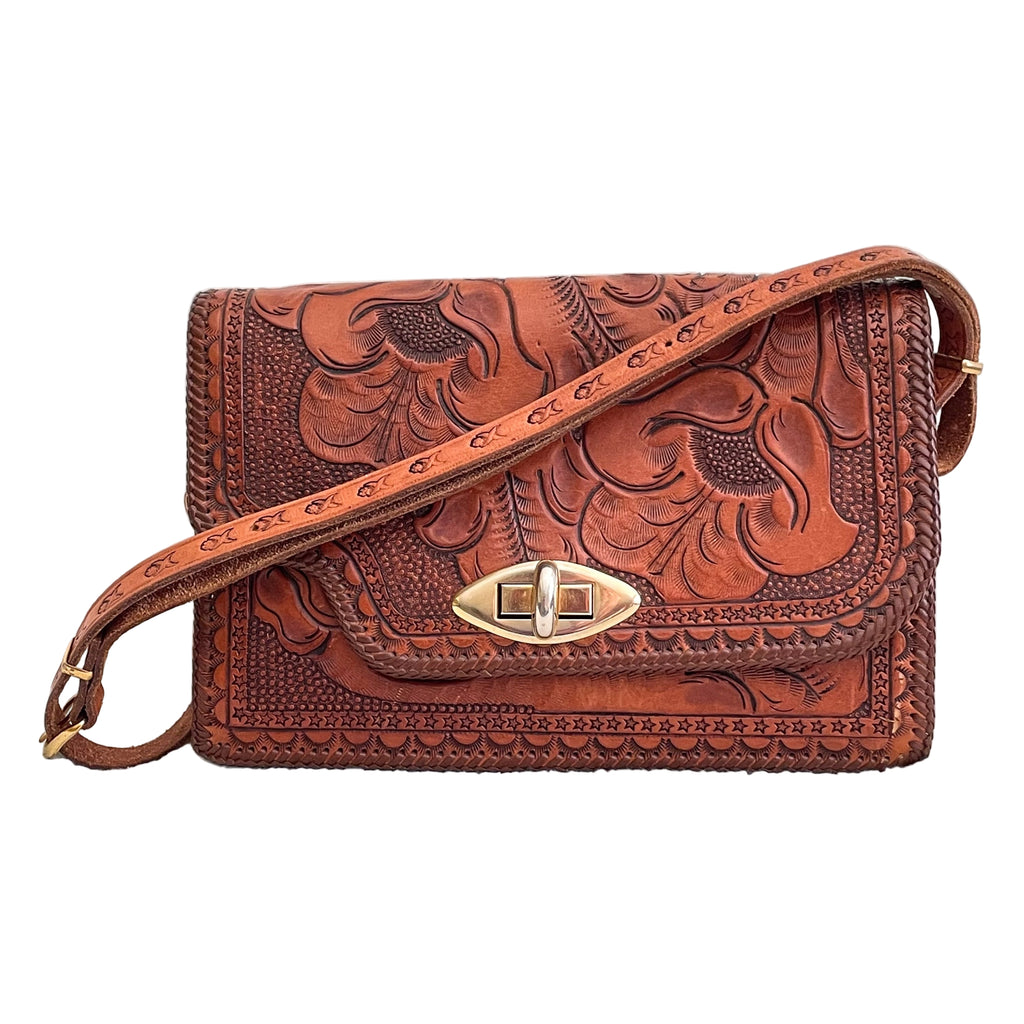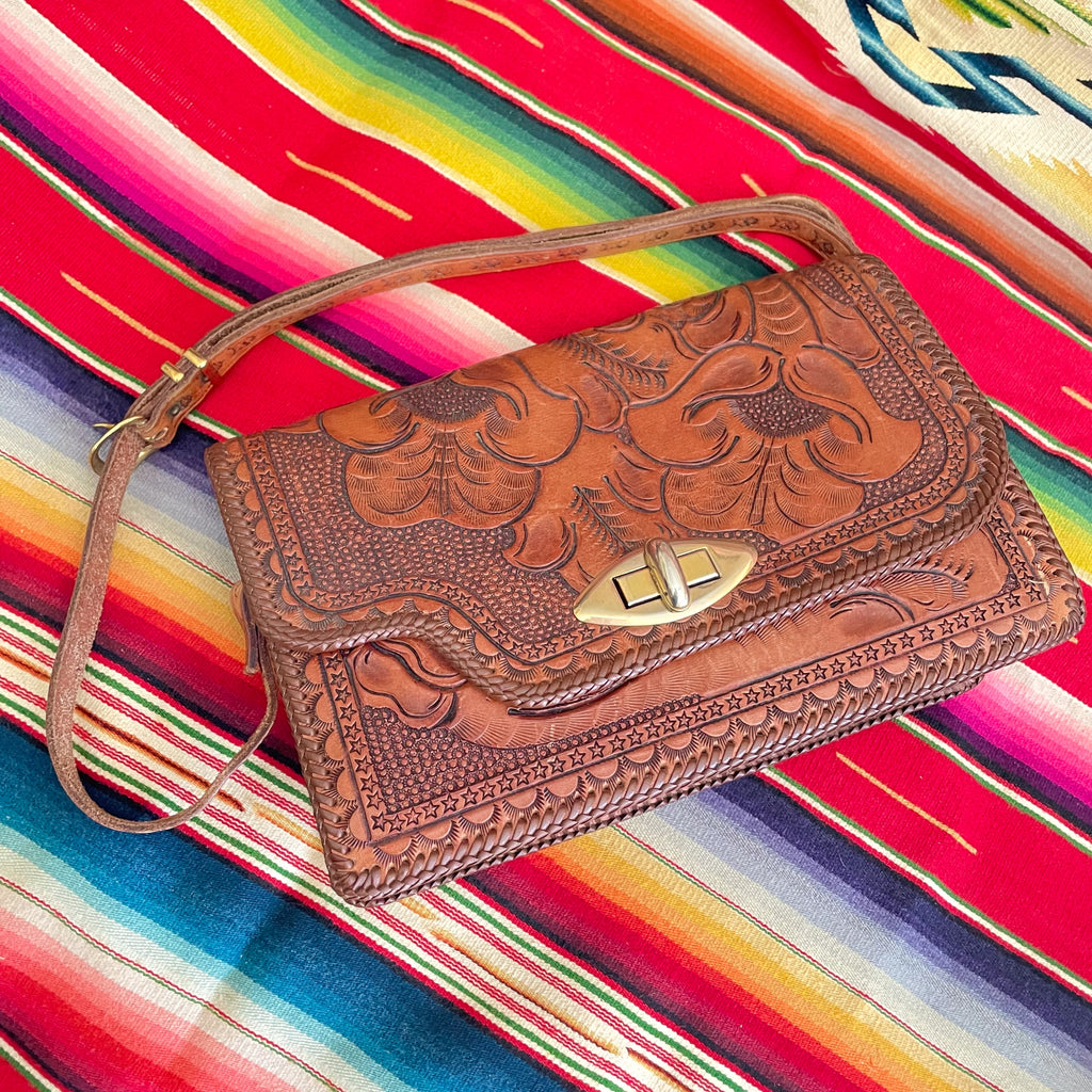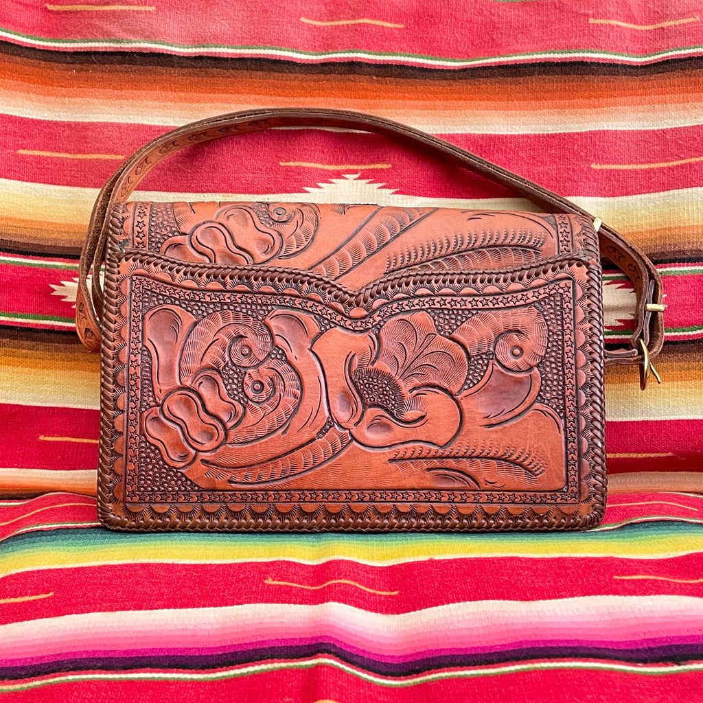 Vintage tooled leather handbag with gorgeous hand tooled flowers and other details.