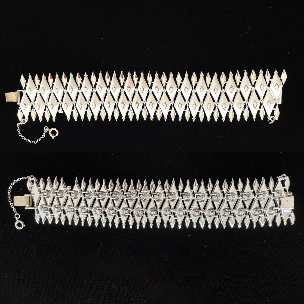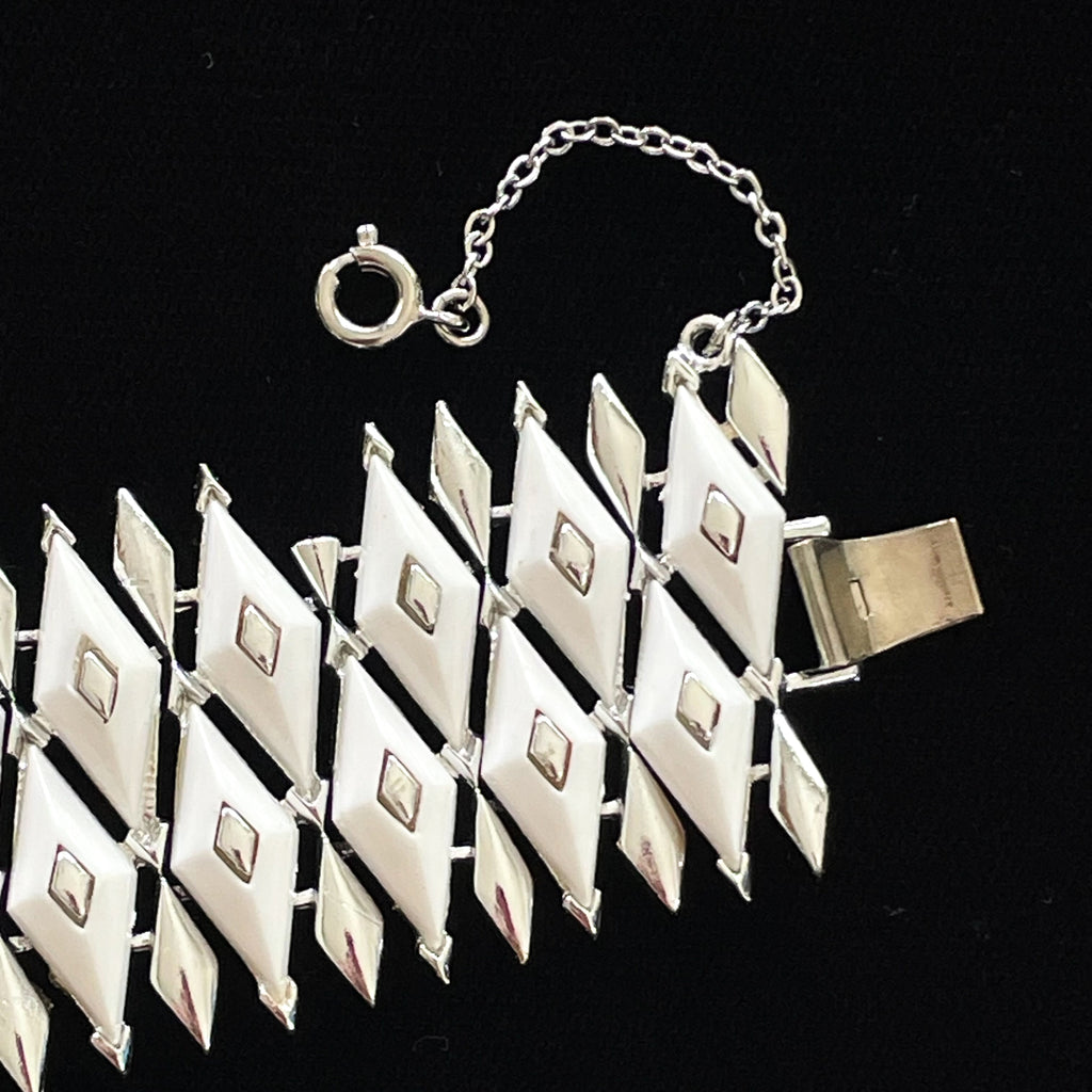 Vintage 50s white Lucite & silver tone MCM bracelet with safety chain.