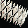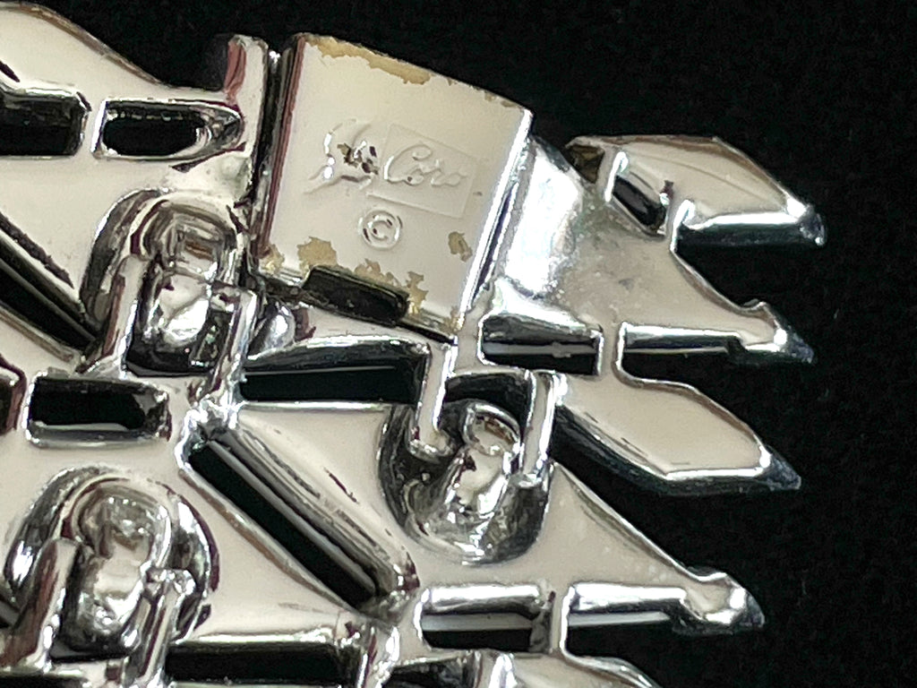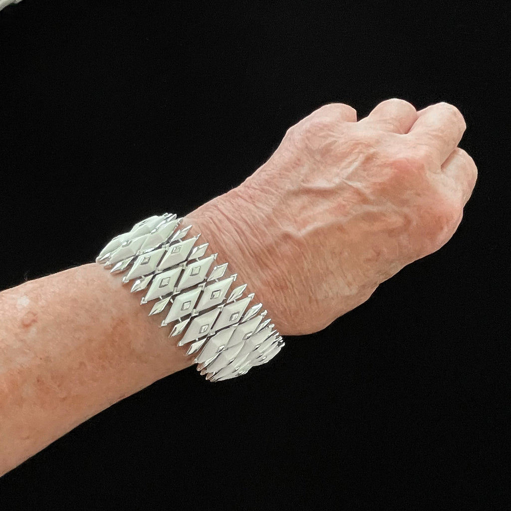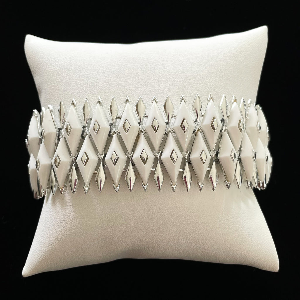 White Lucite, silver tone accents, small triangles with silver triangle dots, box closure.