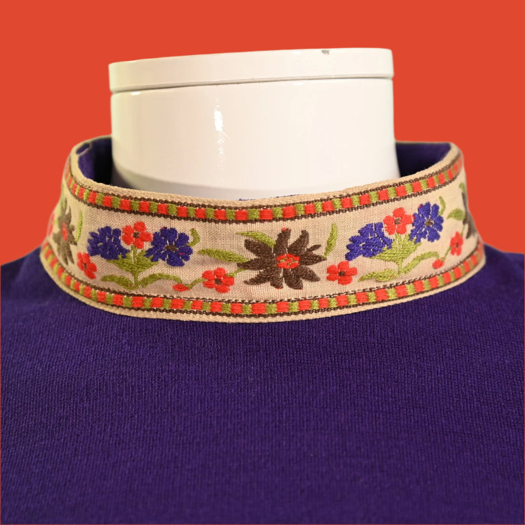 MATERIAL: Double knit, embroidered trim. Content not marked.