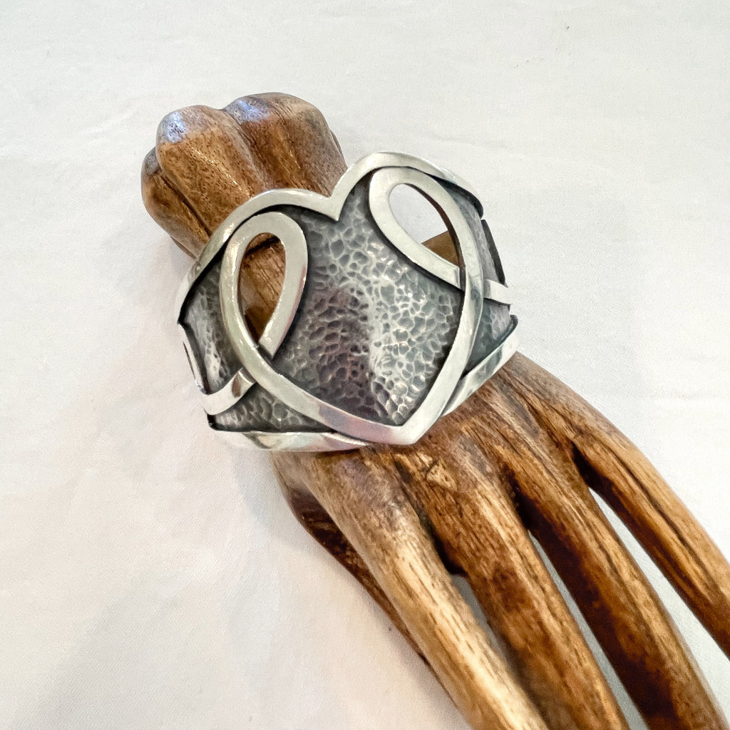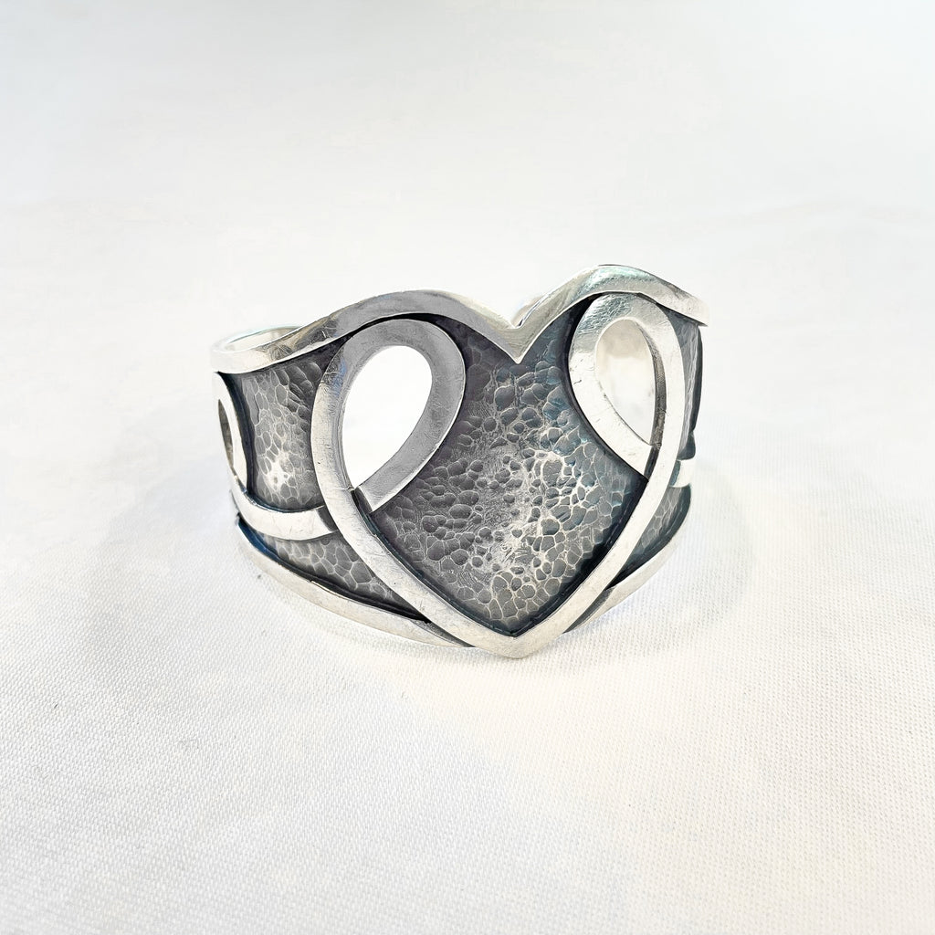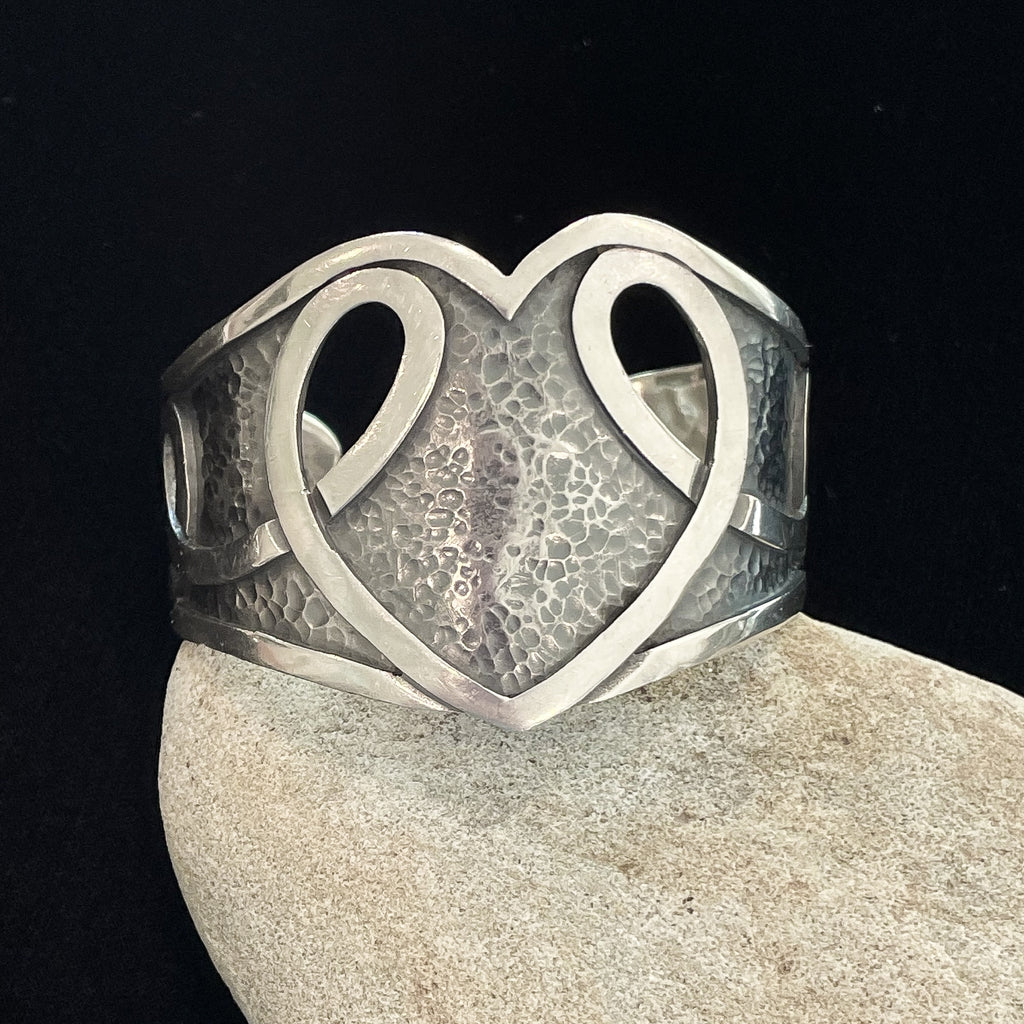 Margot De Taxco Sterling Cuff Heart Bracelet, Hammered & Polished Silver #5195