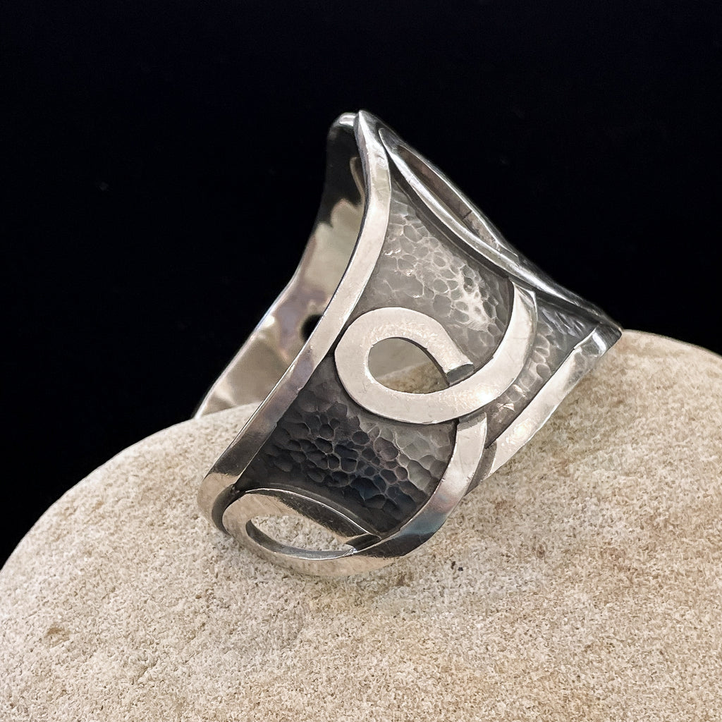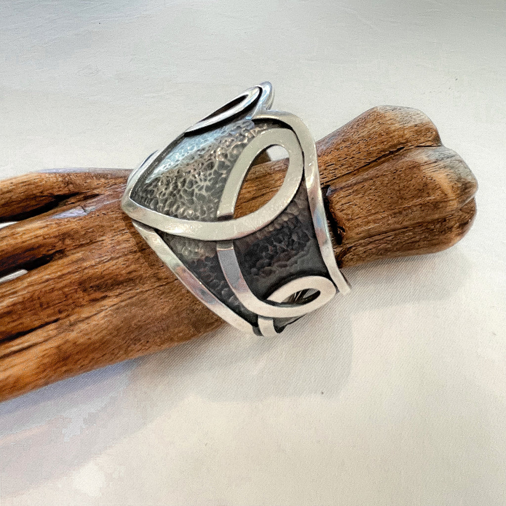 The hammered areas are slightly darker with an oxidized finish contrasted by the polished silver banding.