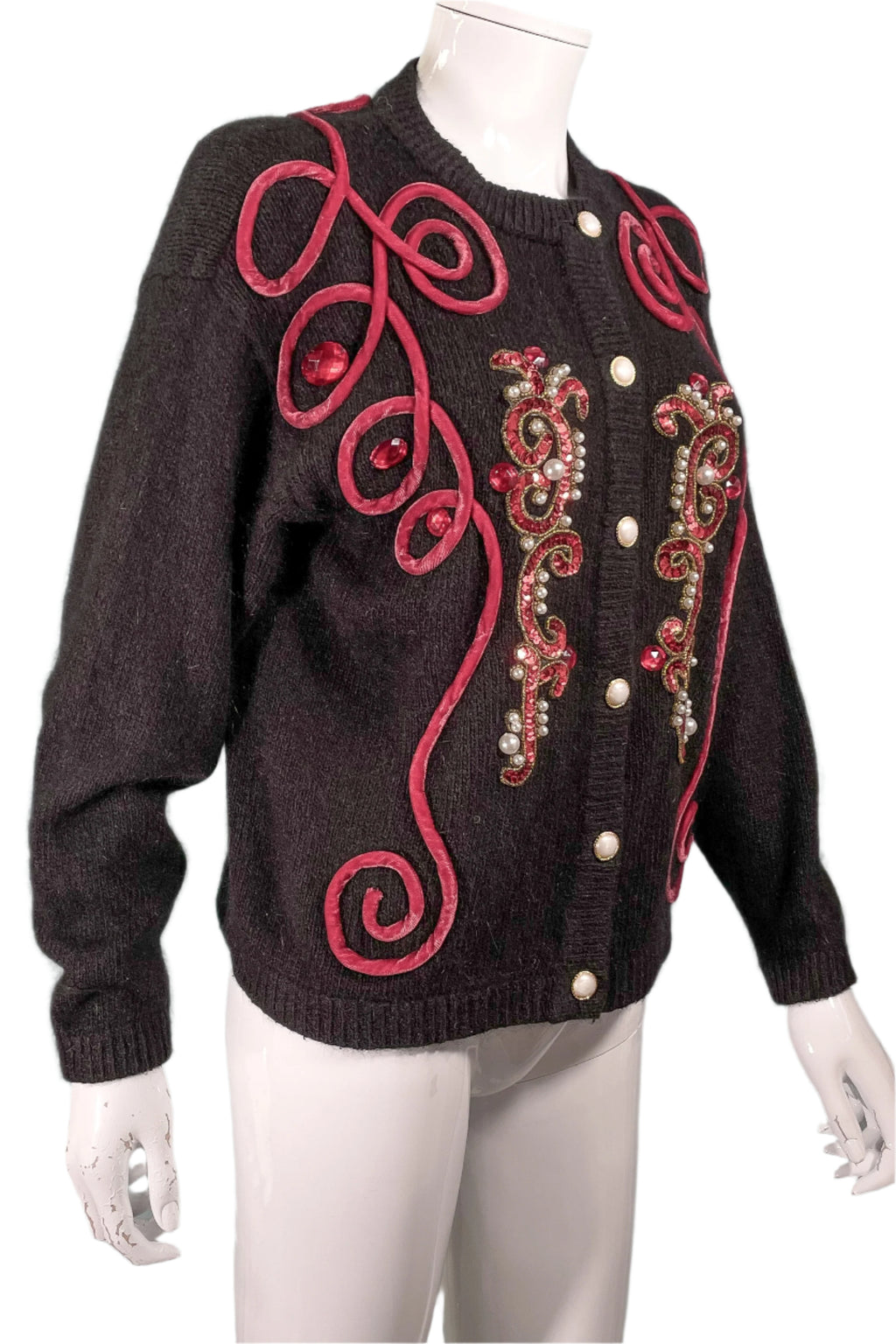 Tony Lambert Collection black angora sweater with jewels & velvet trim.