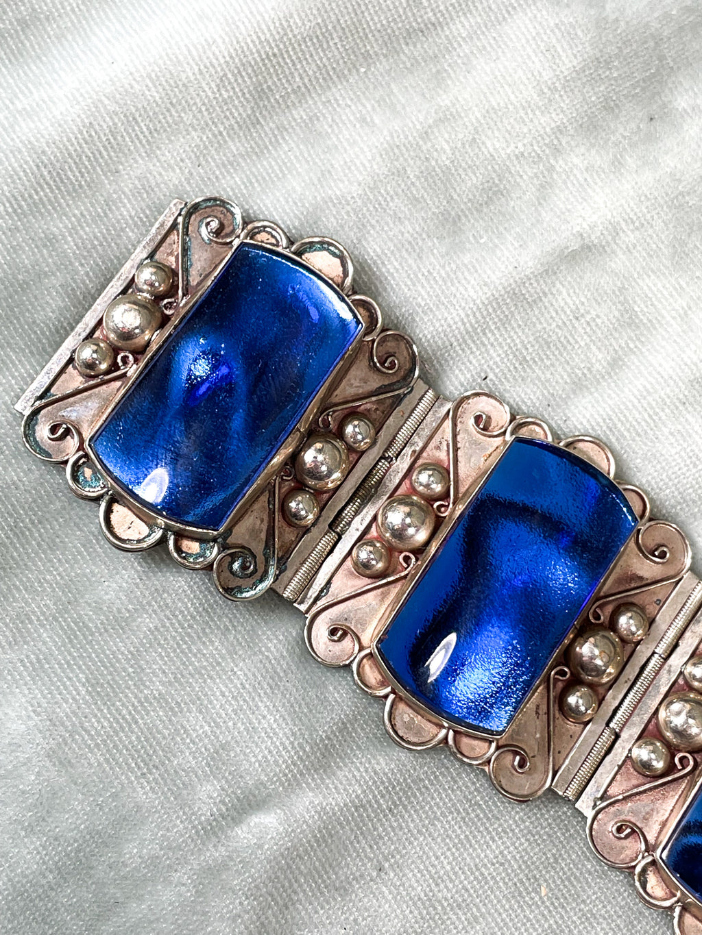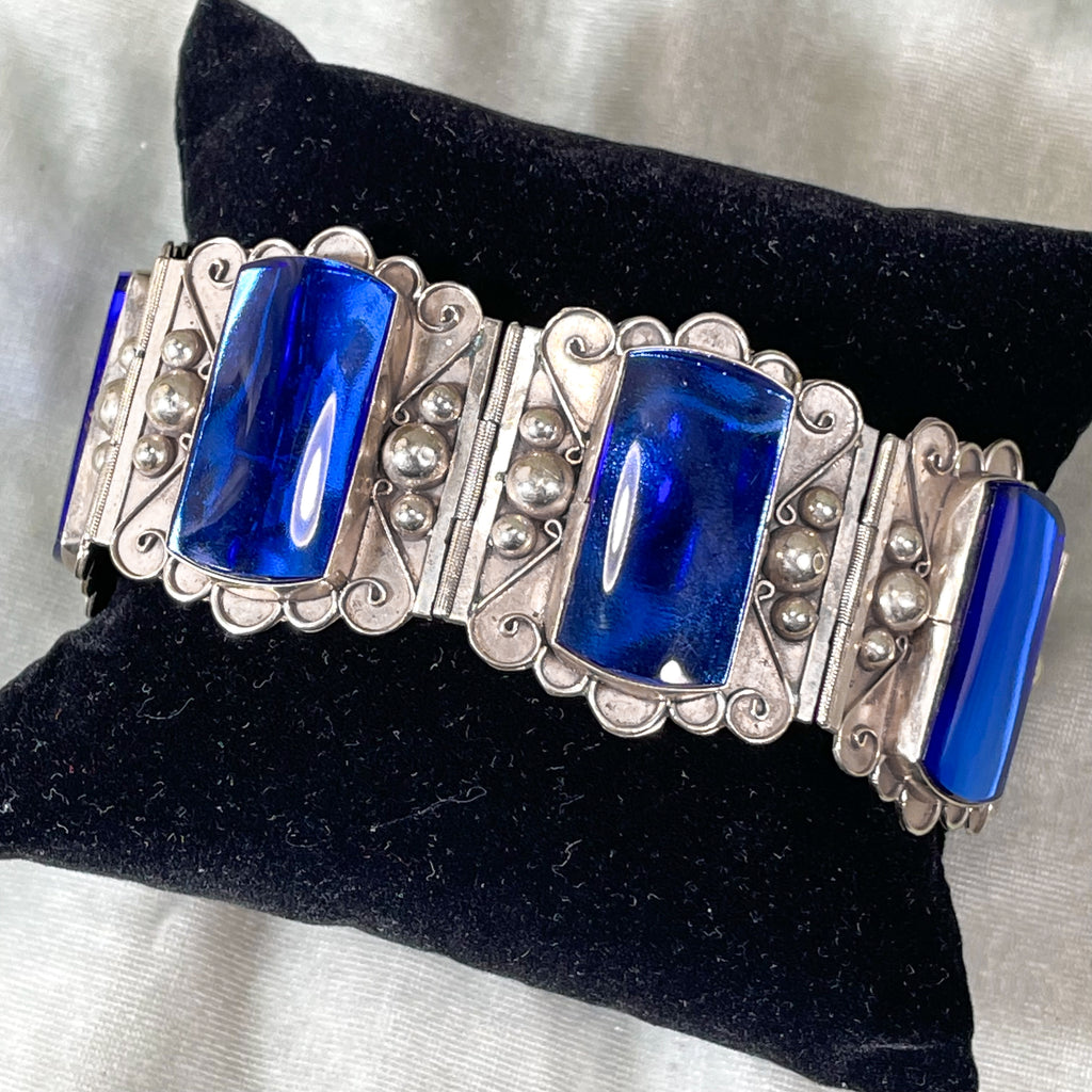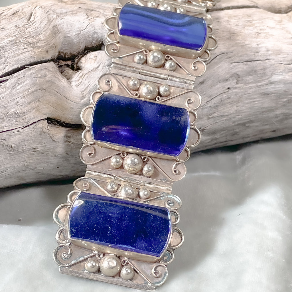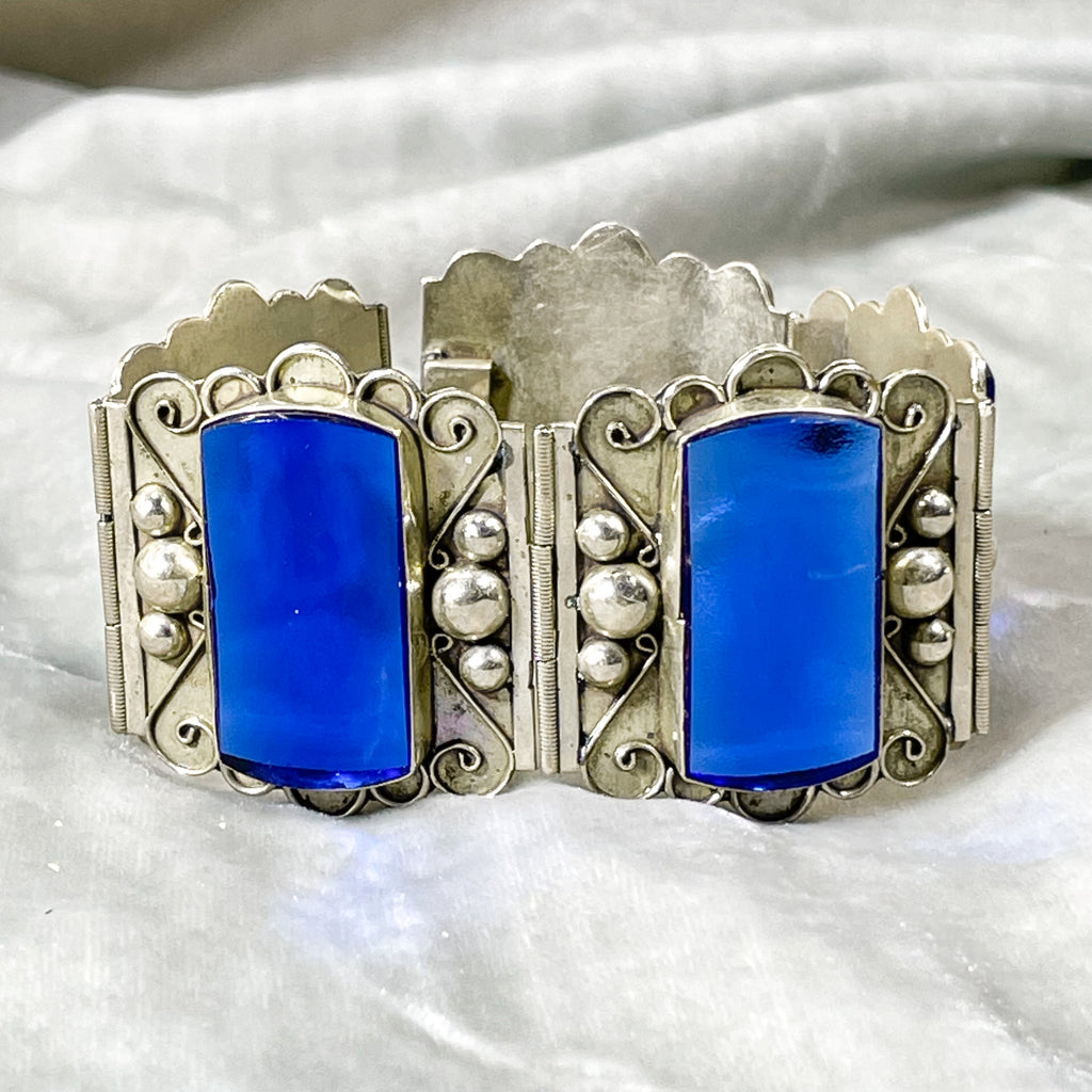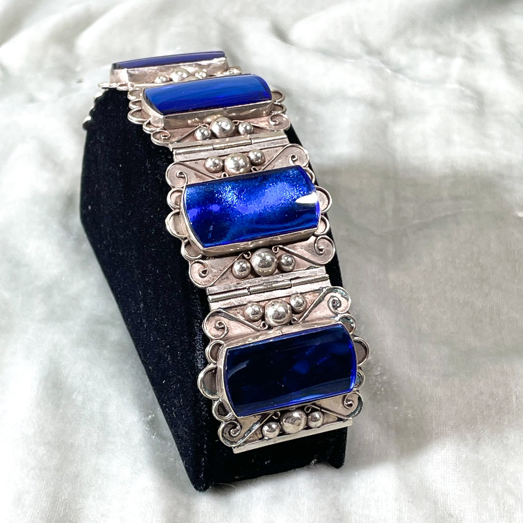 Vintage 40s silver and deep cobalt blue glass bracelet in the Mexican colonial style.