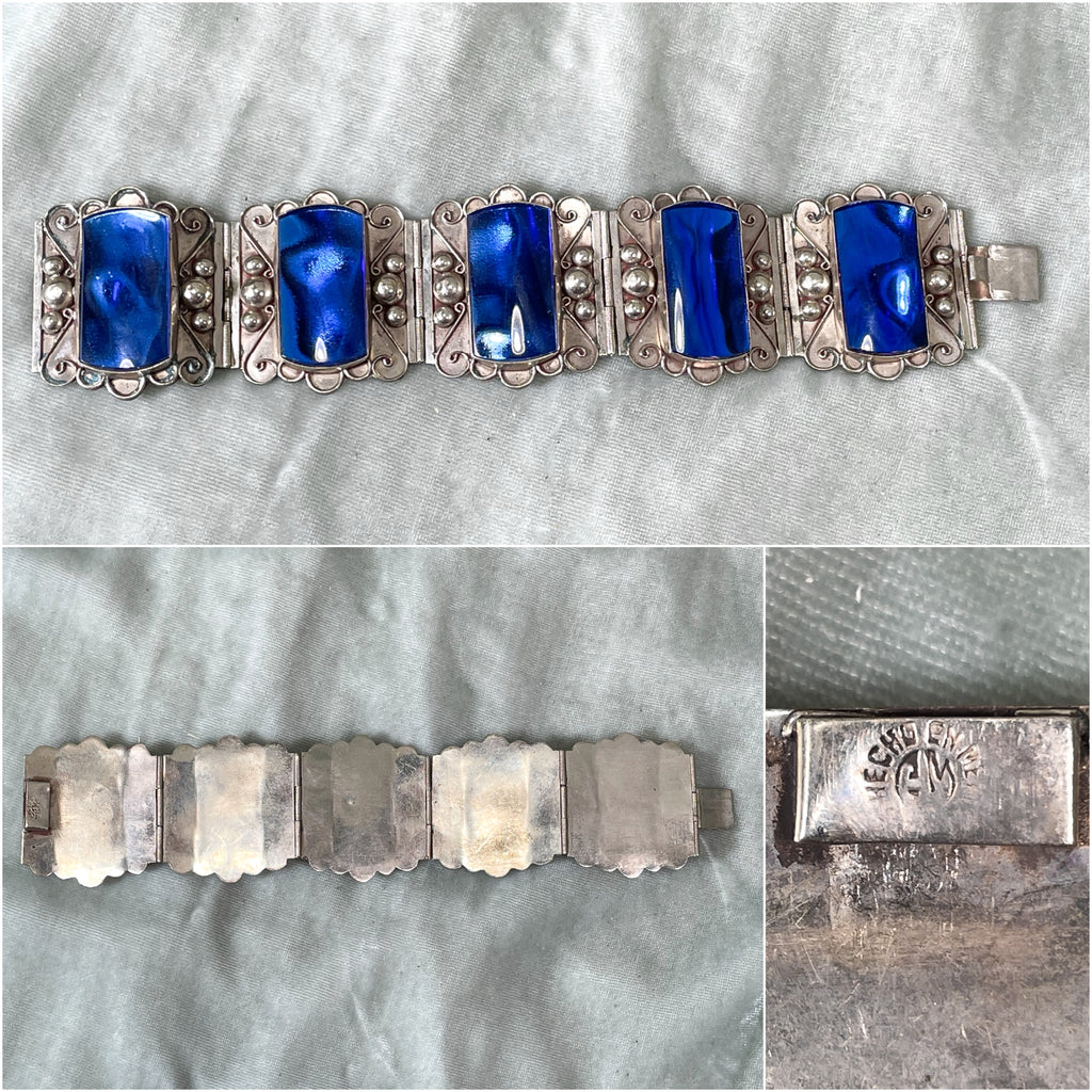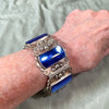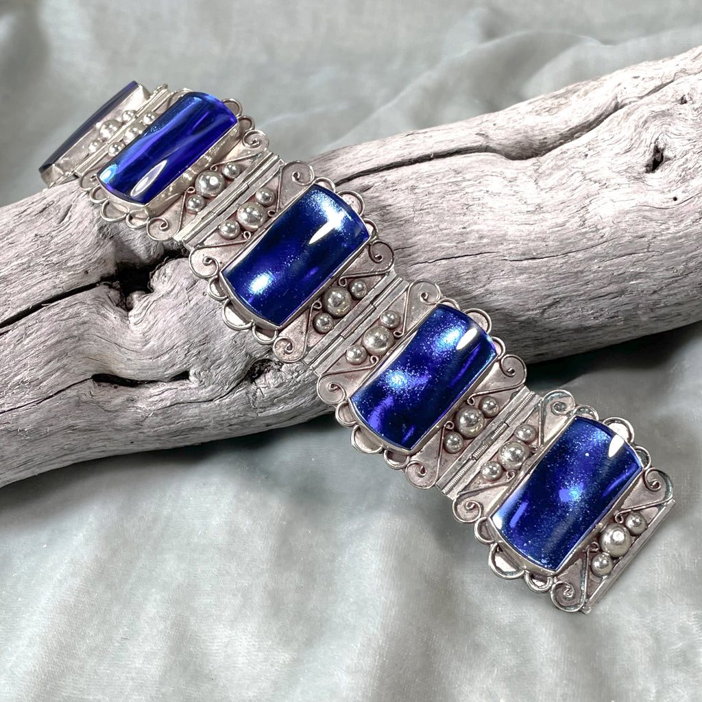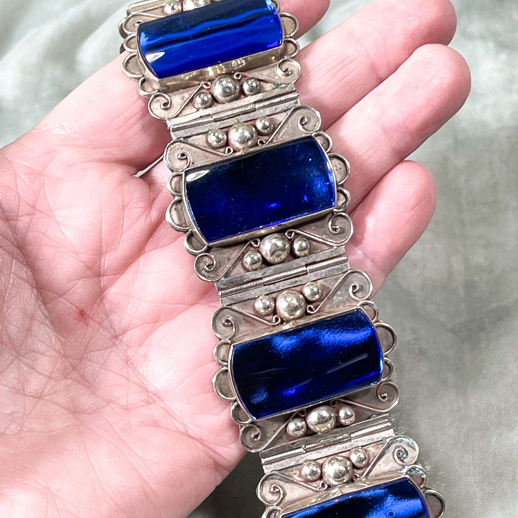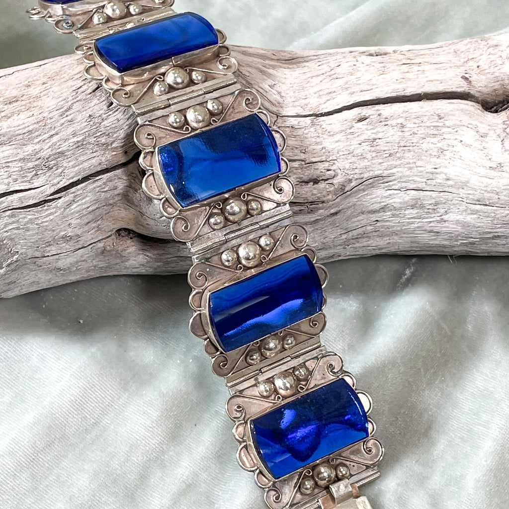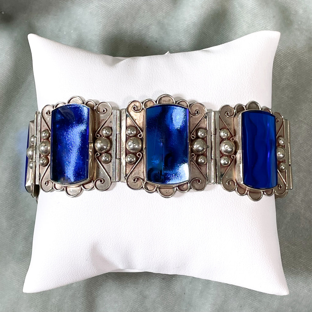 Vintage 40s silver and deep cobalt blue glass bracelet in the Mexican colonial style.