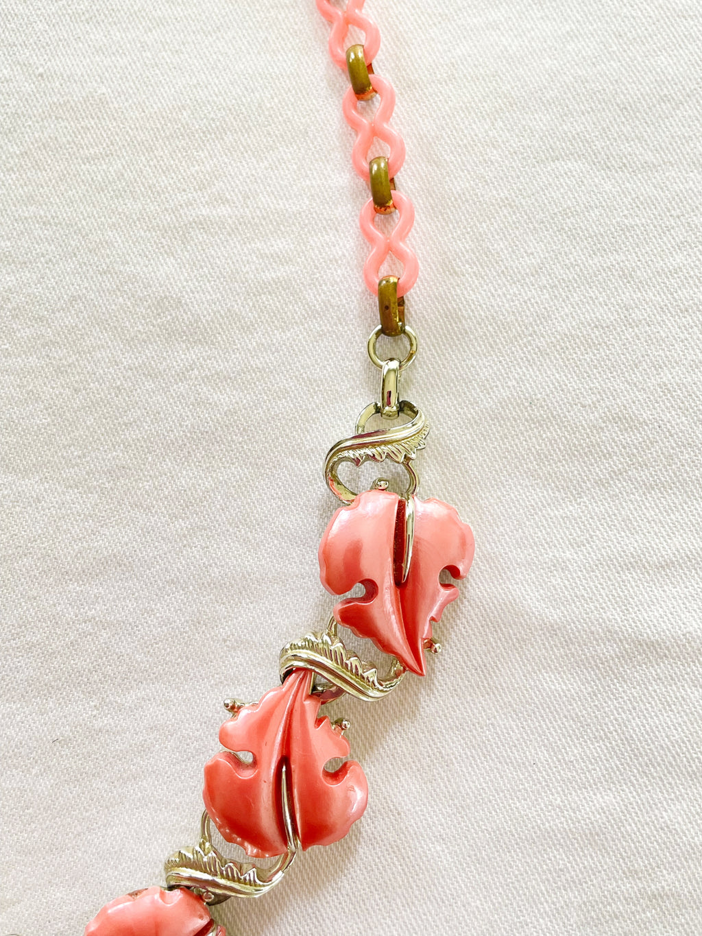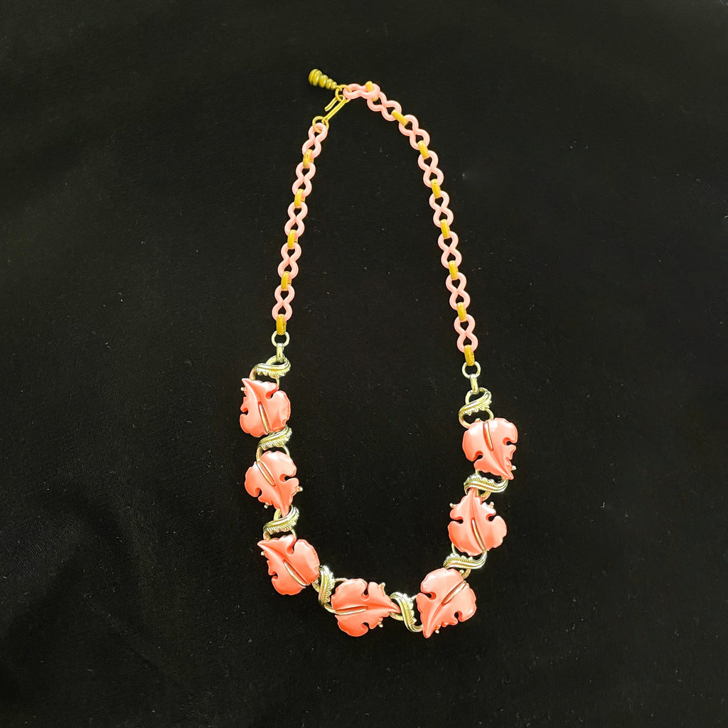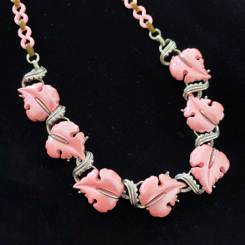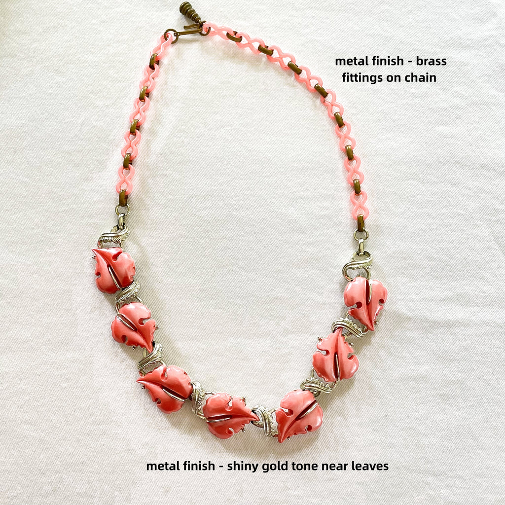 Vintage 50s Thermoset Lucite necklace in a leaf pattern.